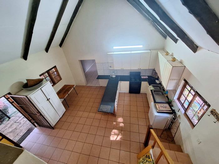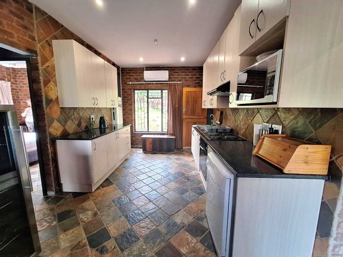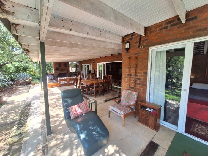 Bush-edge entertainer’s retreat with farm views, dual-living upper apartment, two-level patios, boma and built-in braais — ideal for holiday rental or family life. Four beds, three baths.