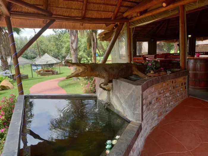 Live and invest in Waterberg foothills resort living — Mookgopong, Limpopo farm with established crocodile-breeding facility, thatch-roof restaurant, damfront dining, pool with water slides.