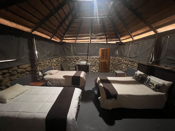 Bushveld retreat on 702 ha with majestic baobabs and Sand River beachfront, thatched chalets, pool and event hall — stocked with game; 14 bedrooms, ideal for weddings.