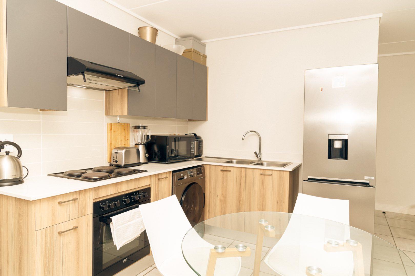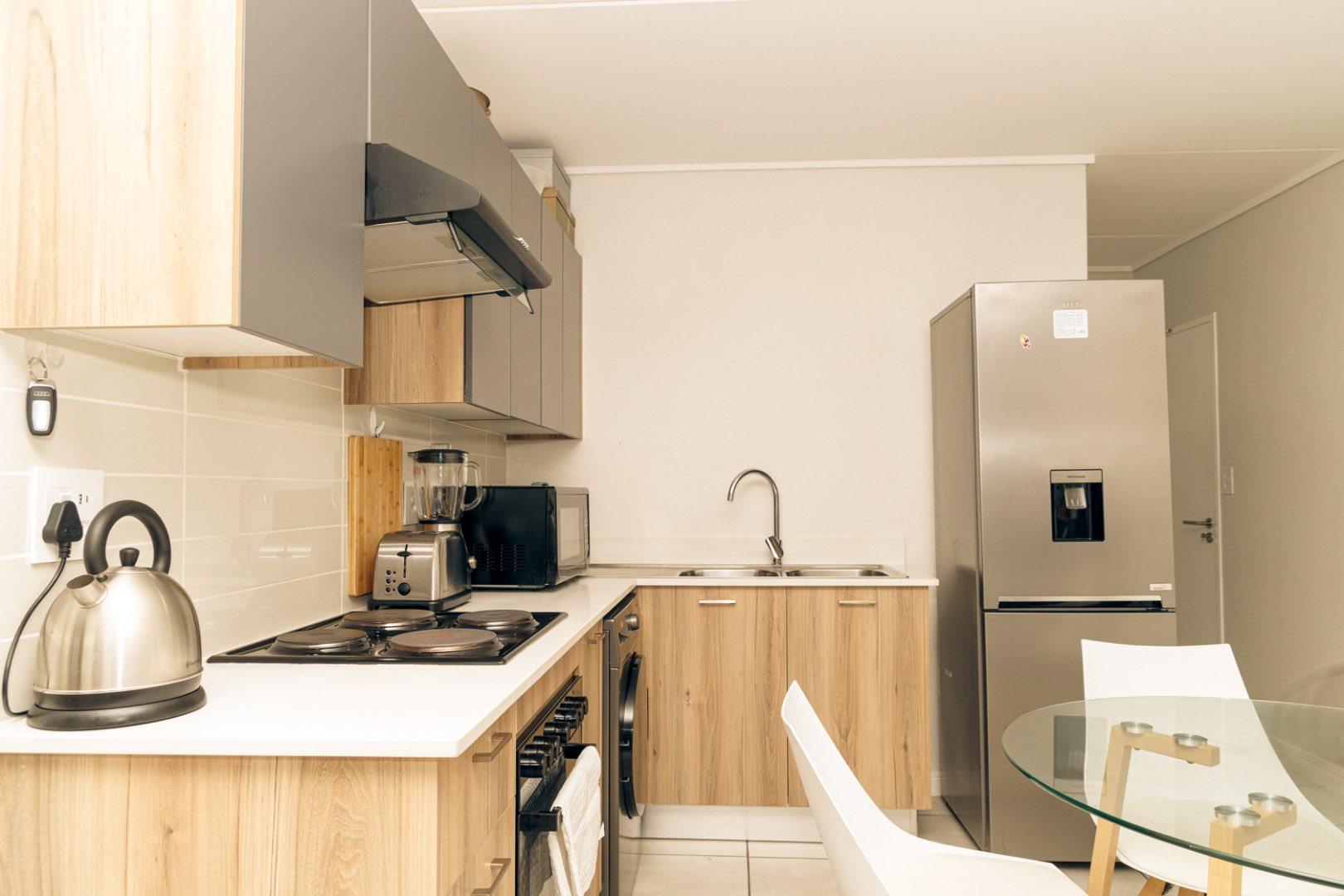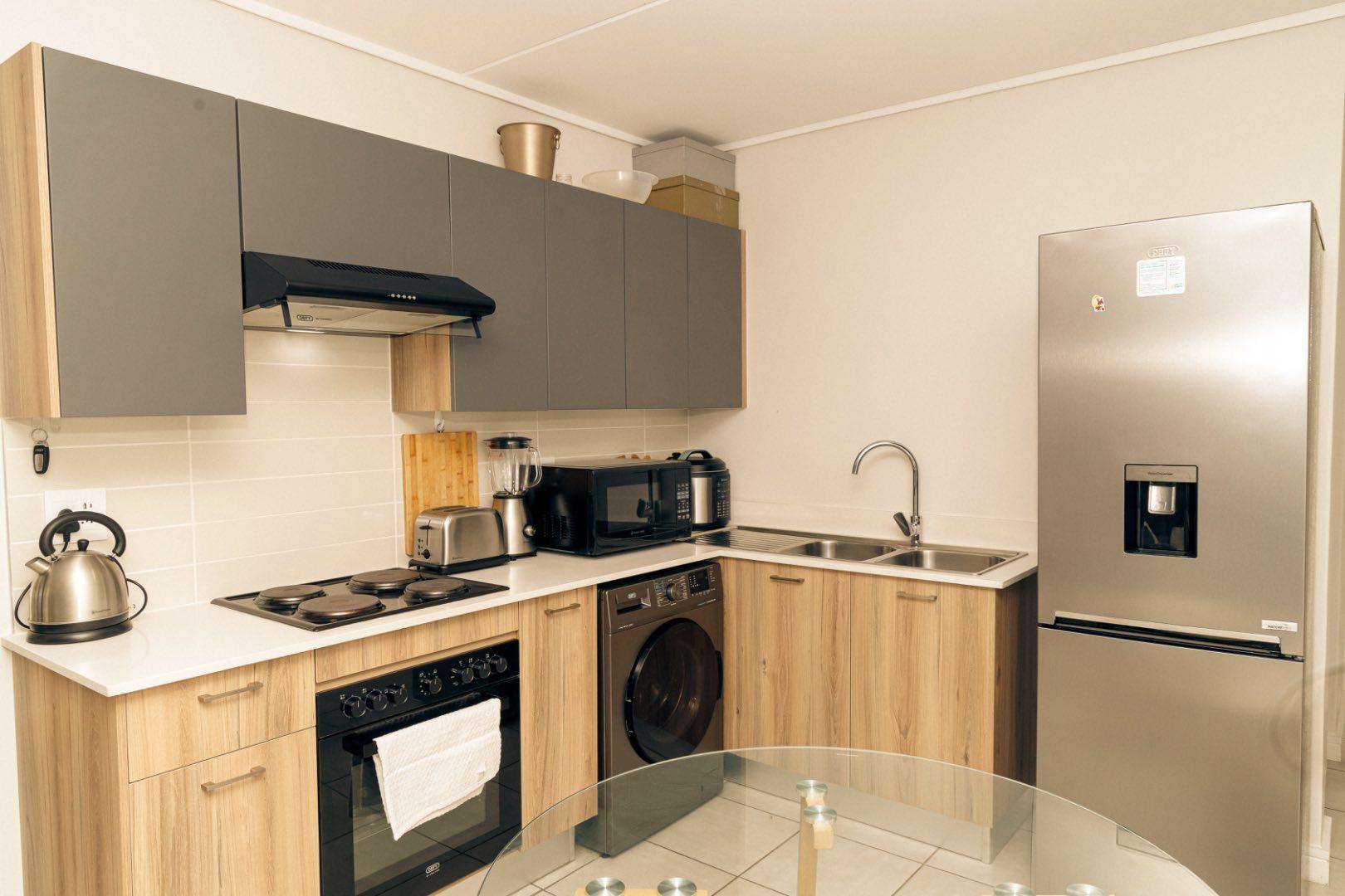 The unit comes with a kitchen fitted with an electric stove, space for a single door fridge, dishwasher/washer connections.