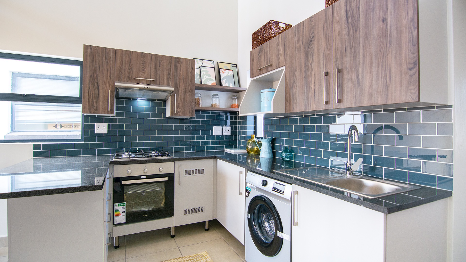 Open plan kitchen fitted with gas hob, oven, washing machine and fridge.