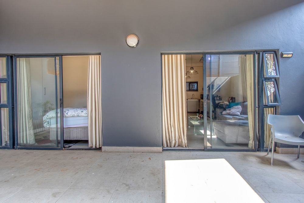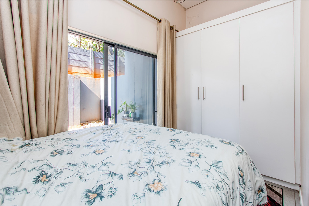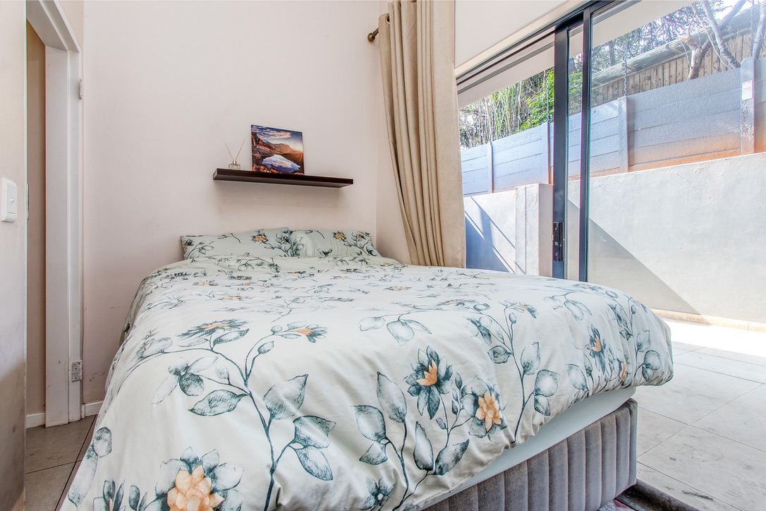 The bedroom, though compact, accommodates a double bed (not bigger) and opens directly onto the patio through sliding doors, bringing in natural light and fresh air. The full bathroom includes a shower-over-bath combination, wash basin, and toilet.