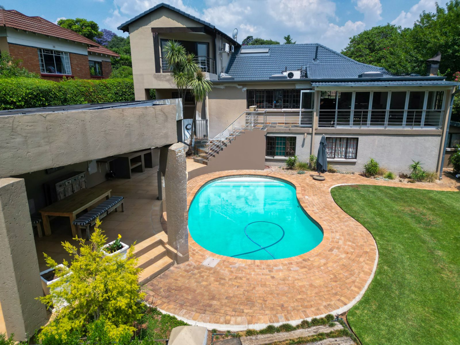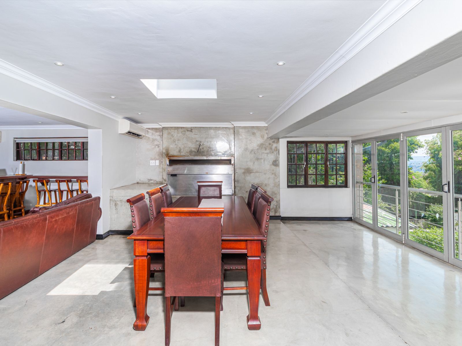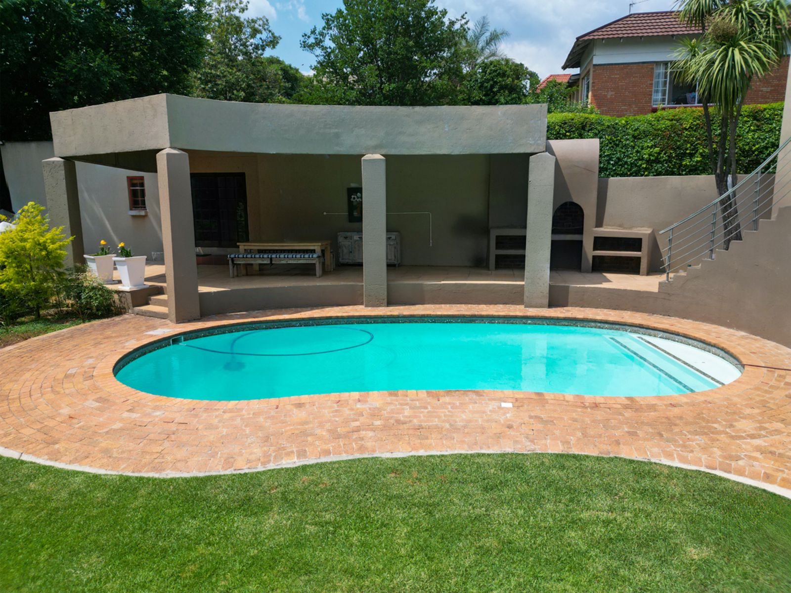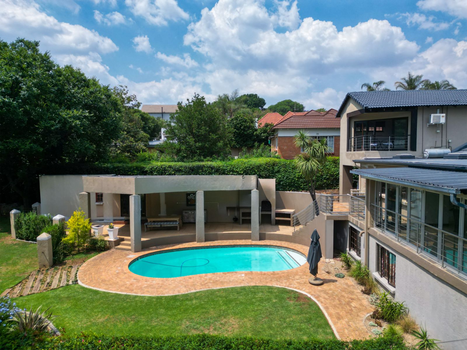 A gourmet kitchen that flows effortlessly into an enclosed braai and bar area overlooking the sparkling pool and landscaped garden.