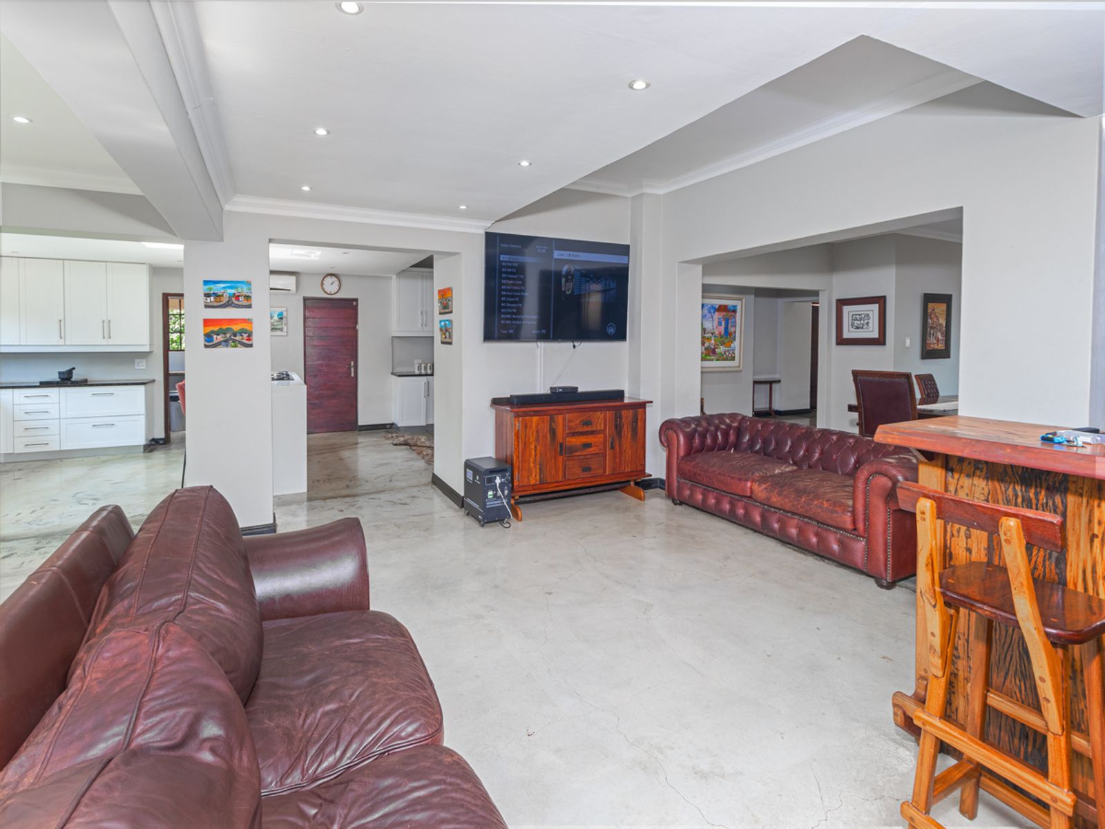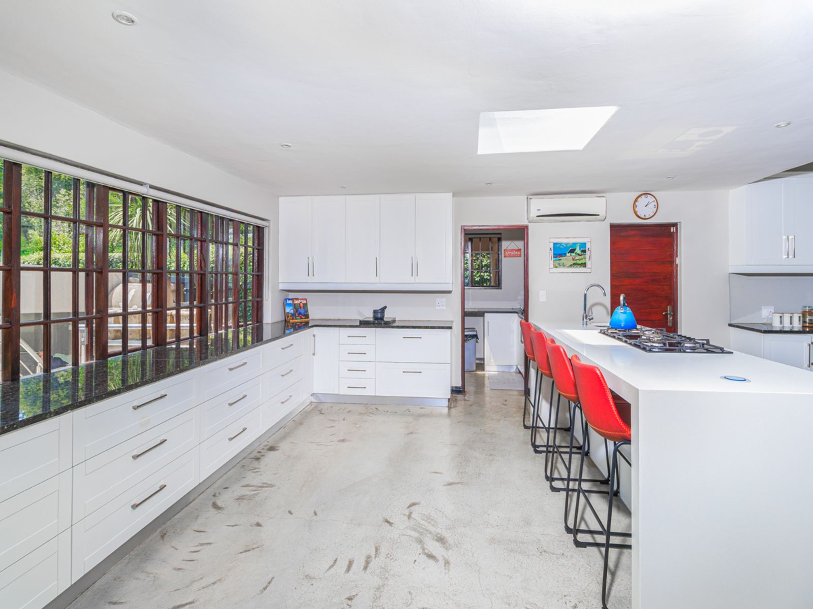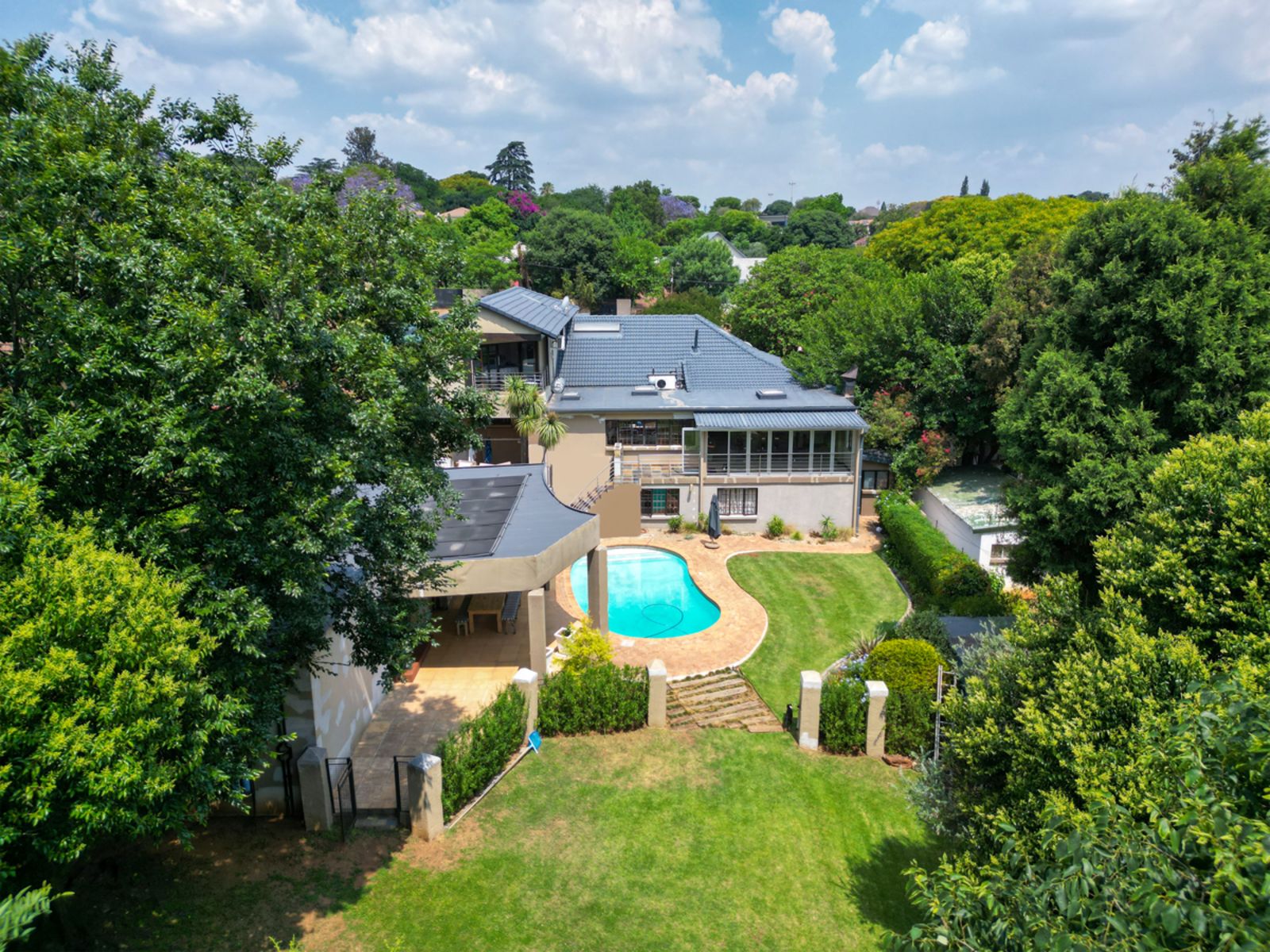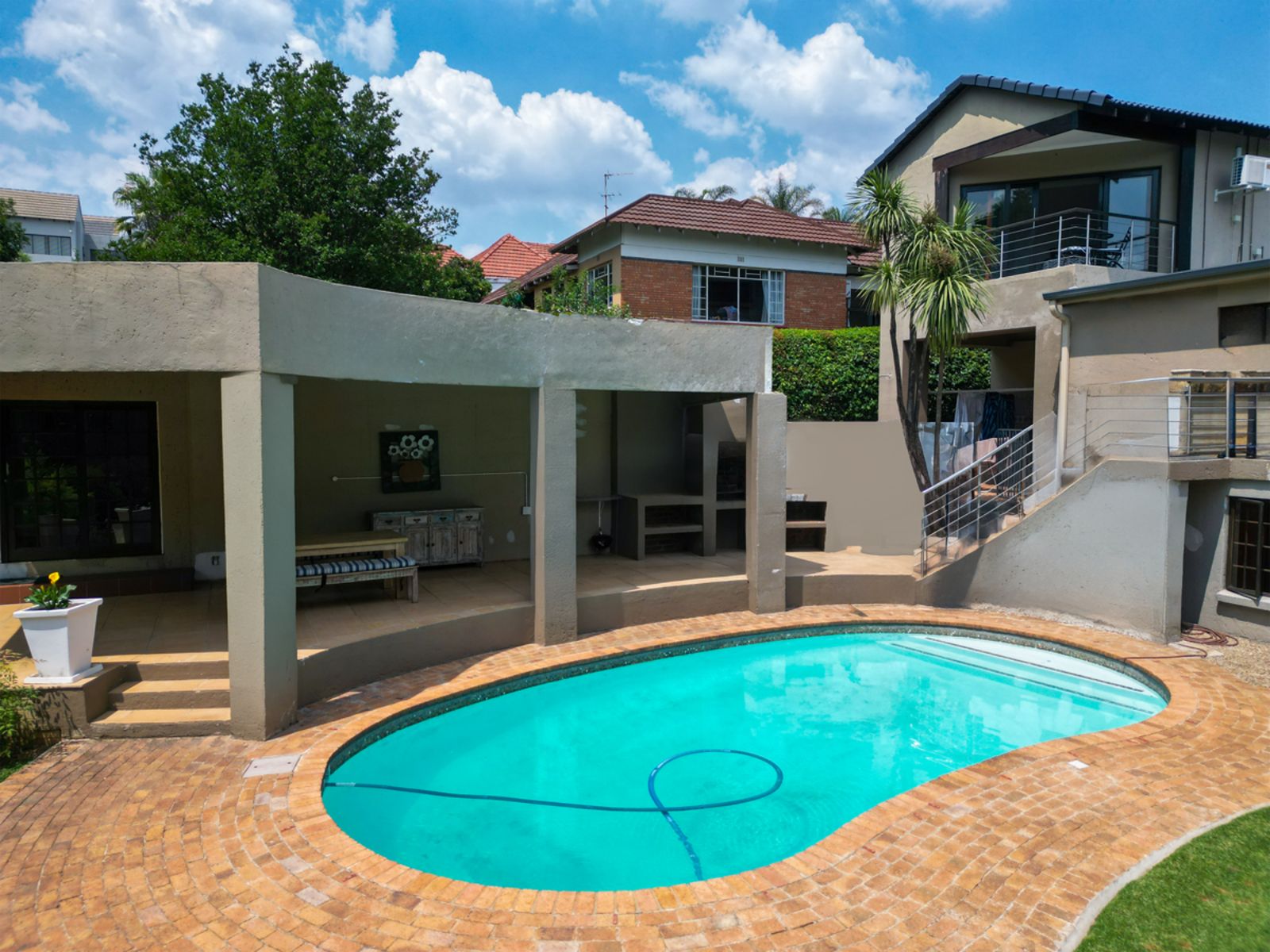 A gourmet kitchen that flows effortlessly into an enclosed braai and bar area overlooking the sparkling pool and landscaped garden.