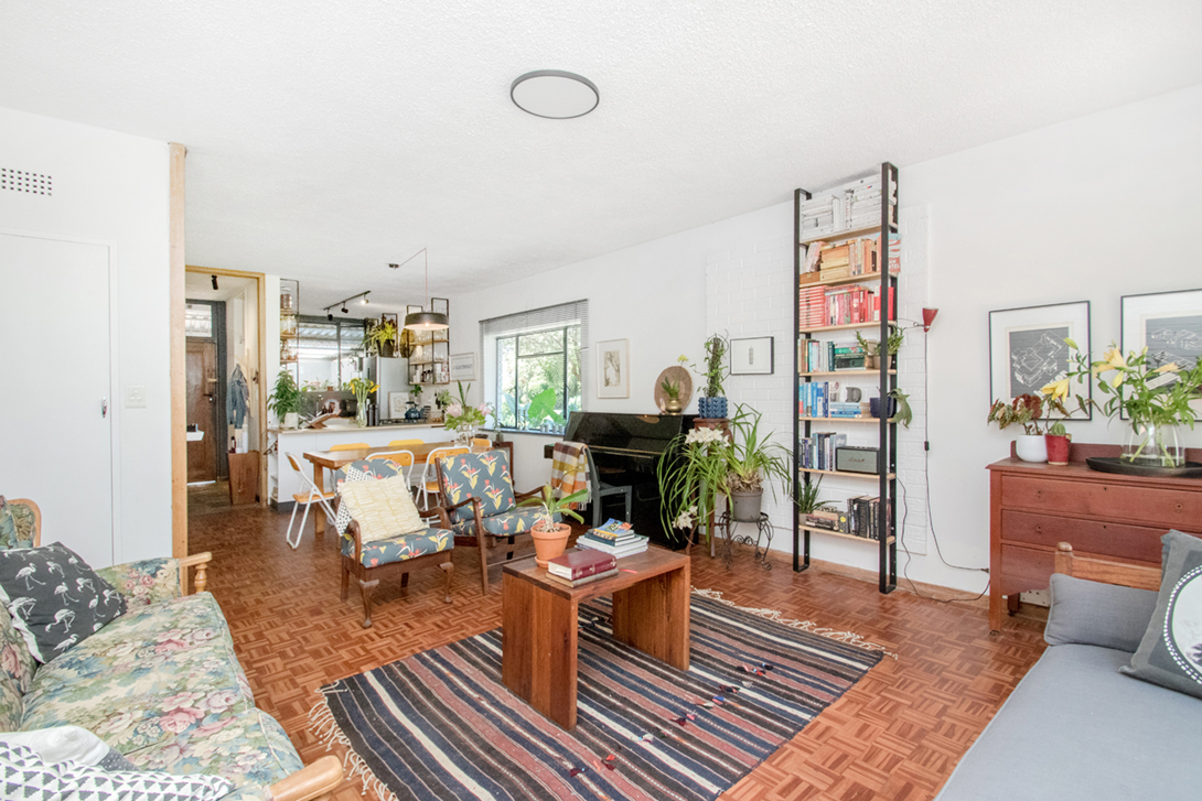 The kitchen flows seamlessly into a spacious open-plan dining and living area, featuring parquet flooring in pristine condition. The lounge opens onto a sunny patio, surrounded by an exquisite, garden — perfect for relaxing or entertaining.
