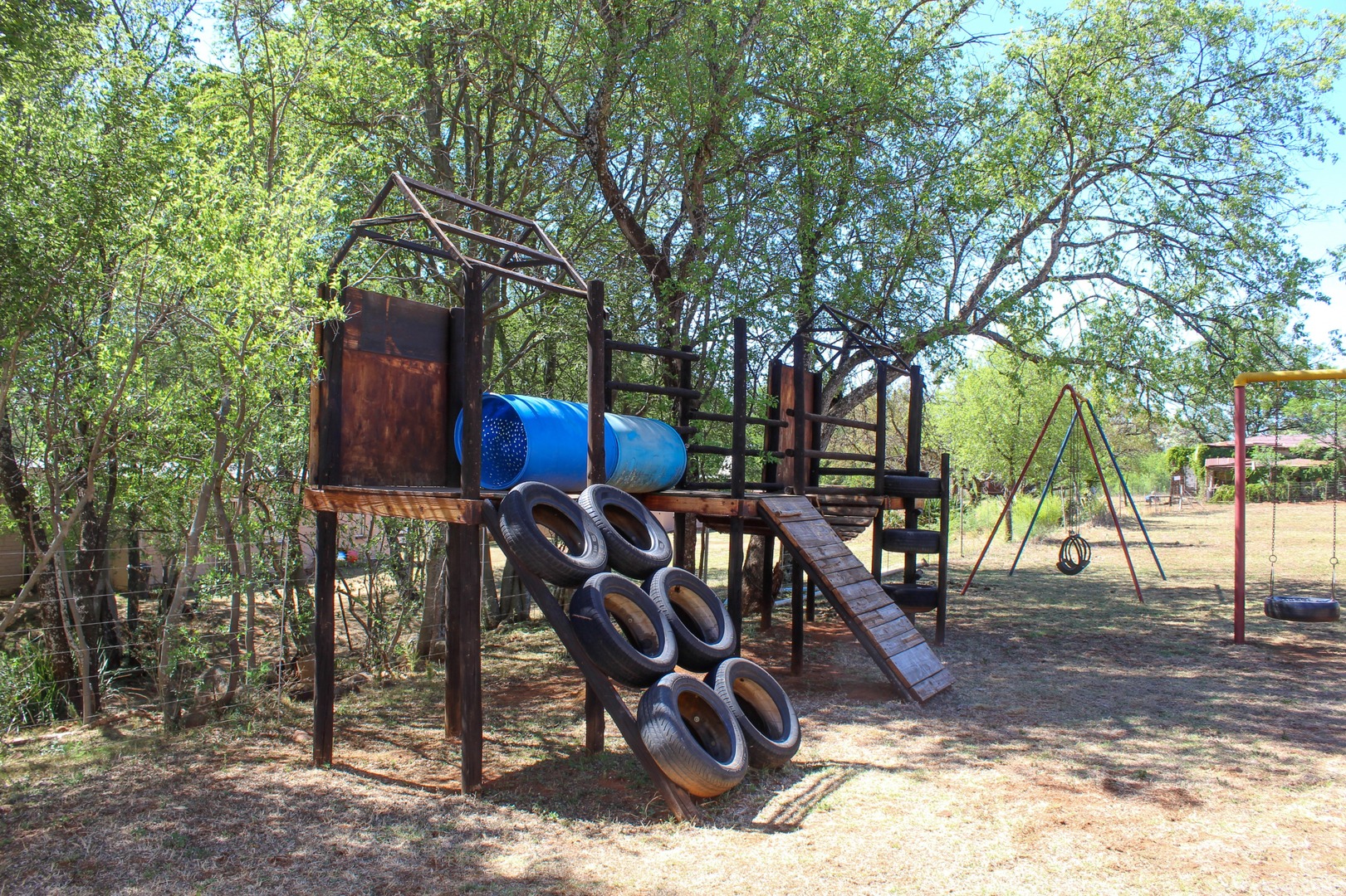 A sparkling blue pool serves as a refreshing oasis on sunny days, inviting you to swim, relax, or simply enjoy the serene surroundings. Families will appreciate the on-site play area, equipped with safe amenities for children to enjoy.