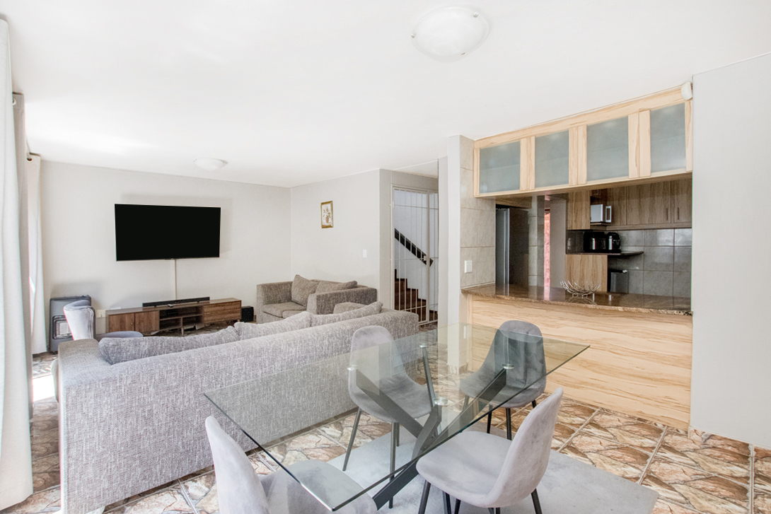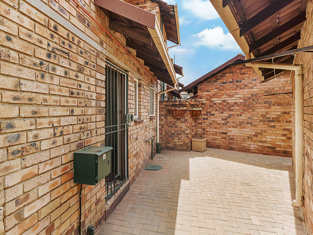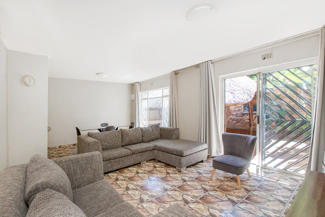 The modern kitchen is fitted with built-in cupboards and offers space for your appliances. The living area opens onto a private, well-sized garden complete with a lovely Lapa and built-in braai, the perfect spot for weekend get-togethers!