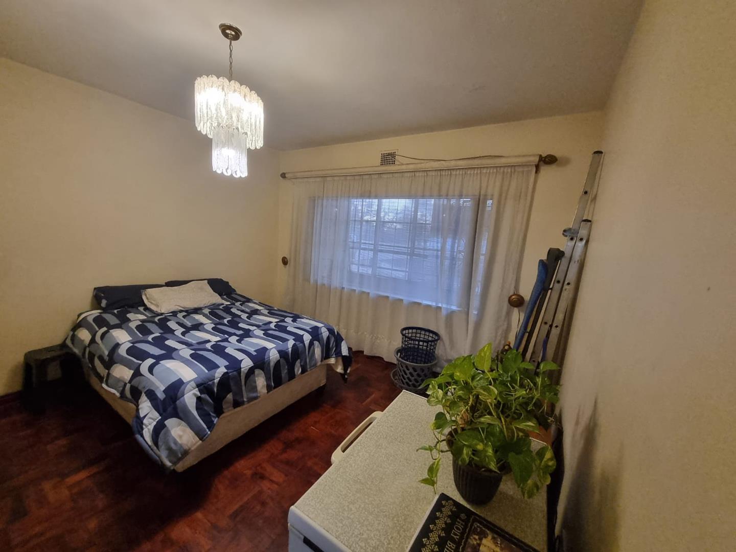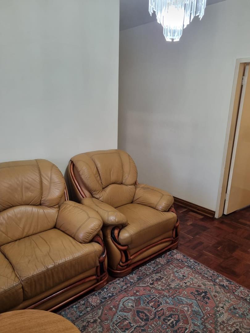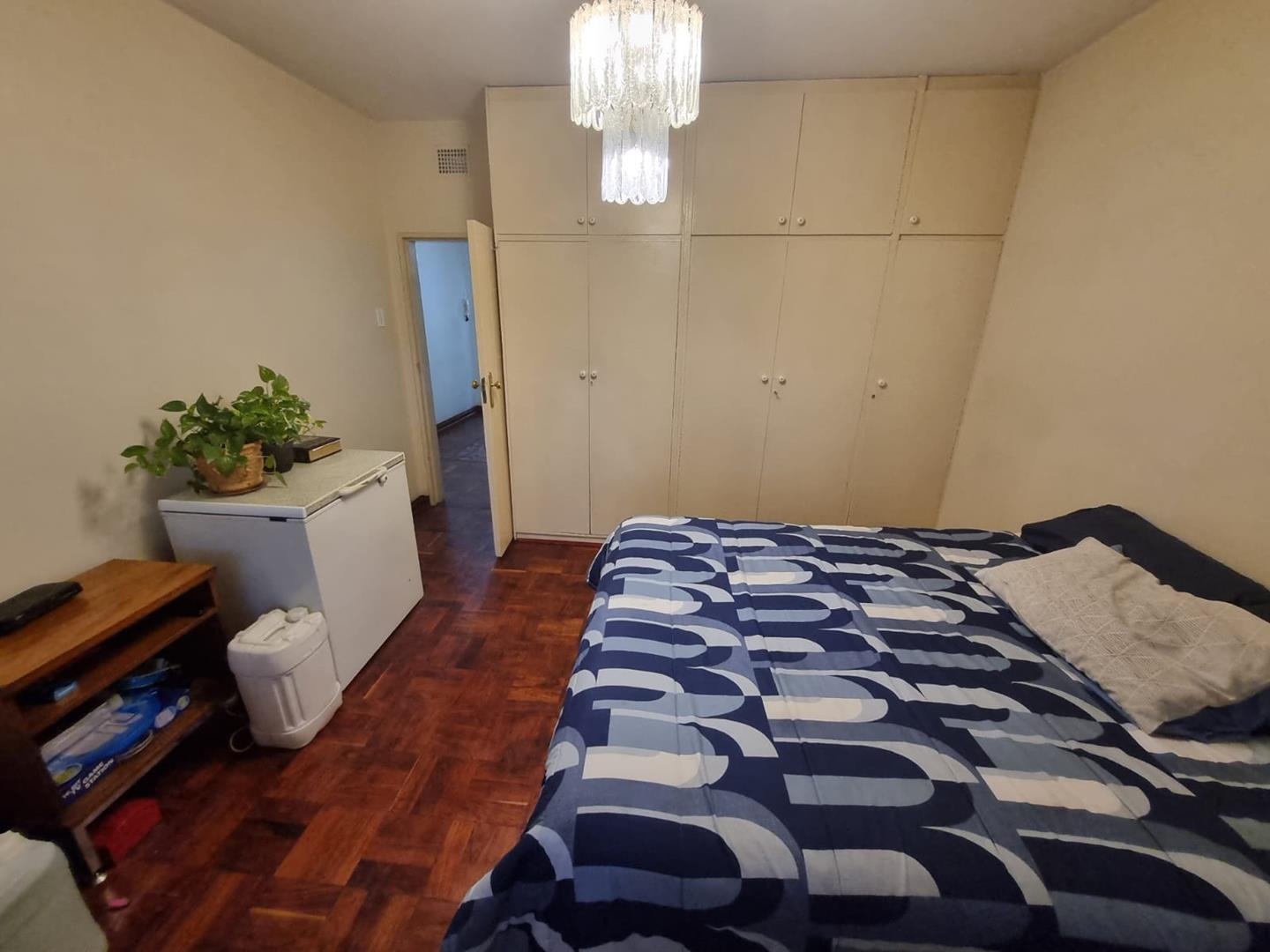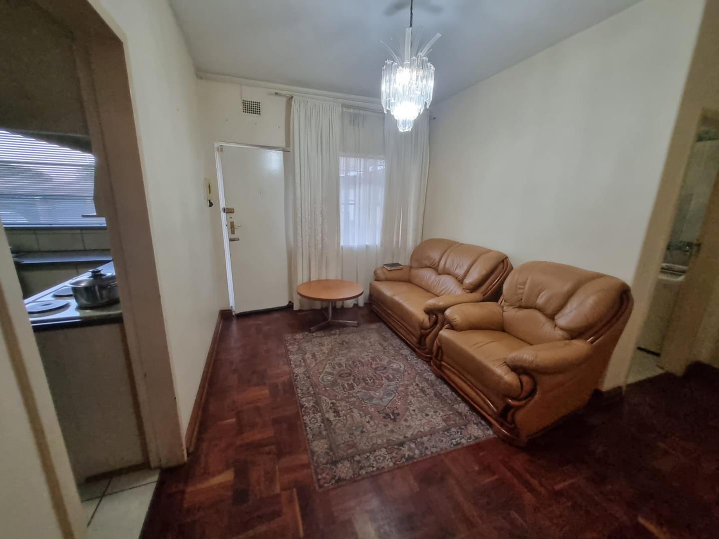 The open-plan design seamlessly connects the lounge and dining room, leading out to a balcony that offers a picturesque view of the garden below. The bedroom is generously sized and features parquet flooring/carpets, along with built-in cupboards. The bathroom is fully tiled and equipped with a shower, toilet, and basin.