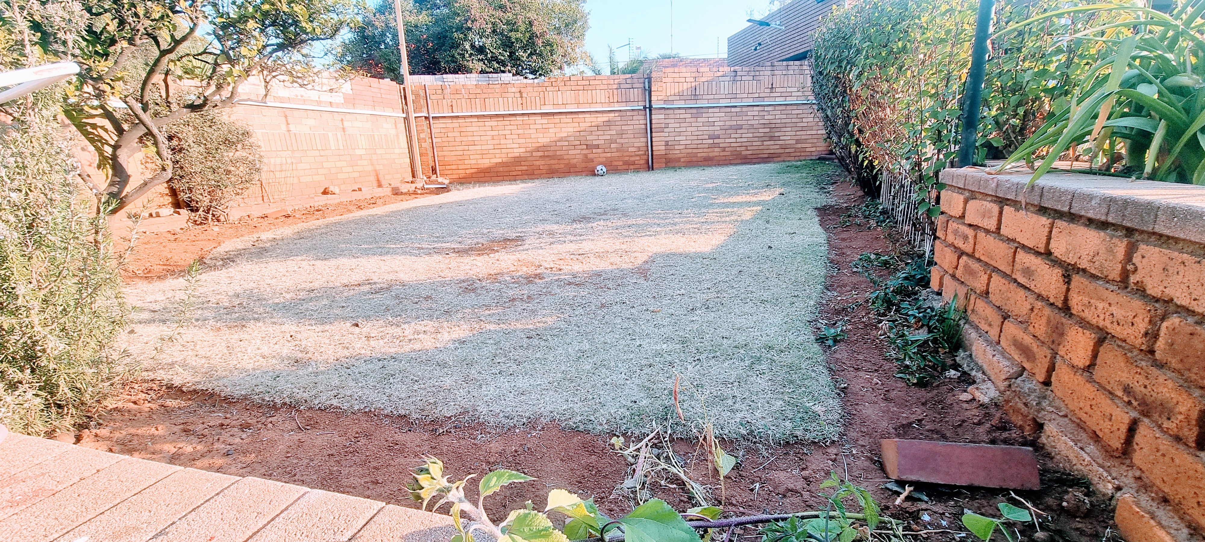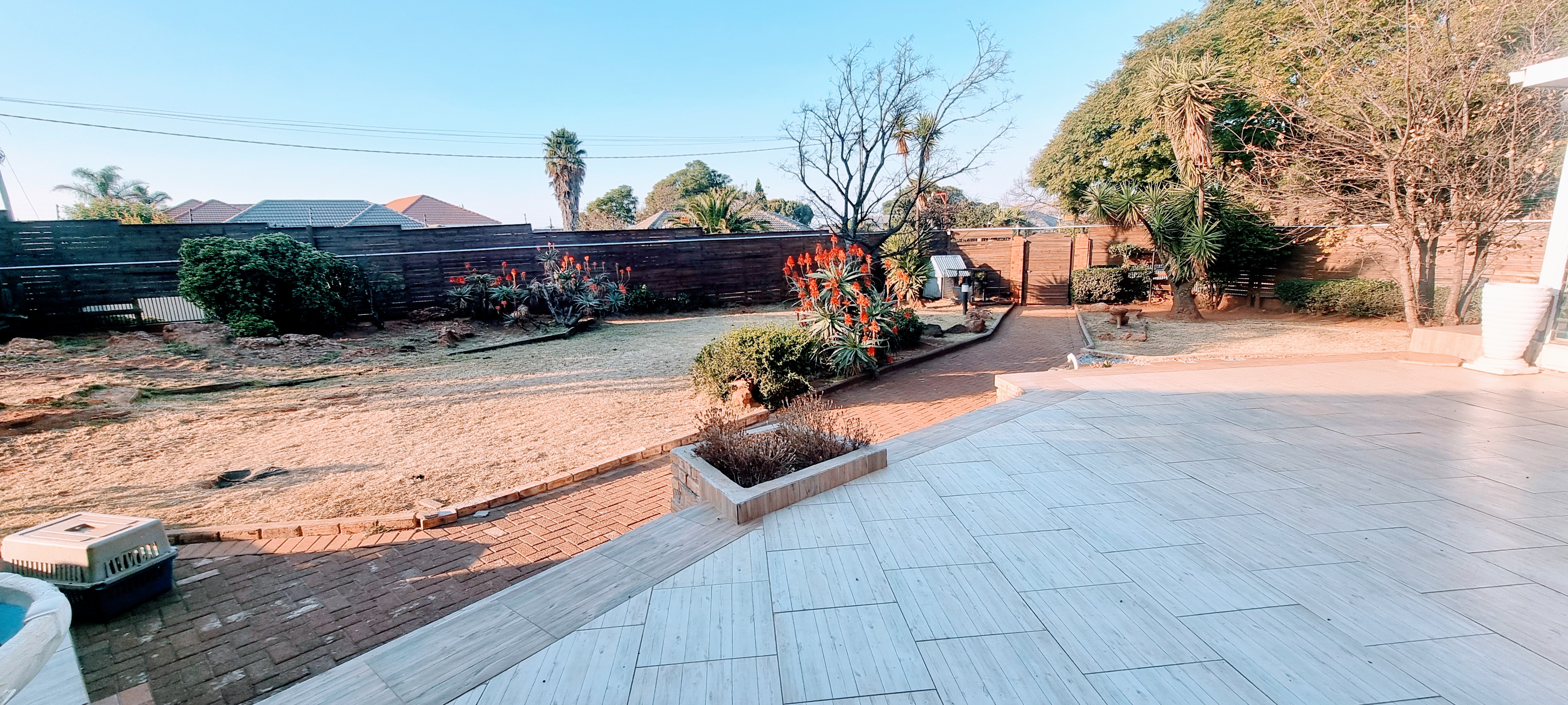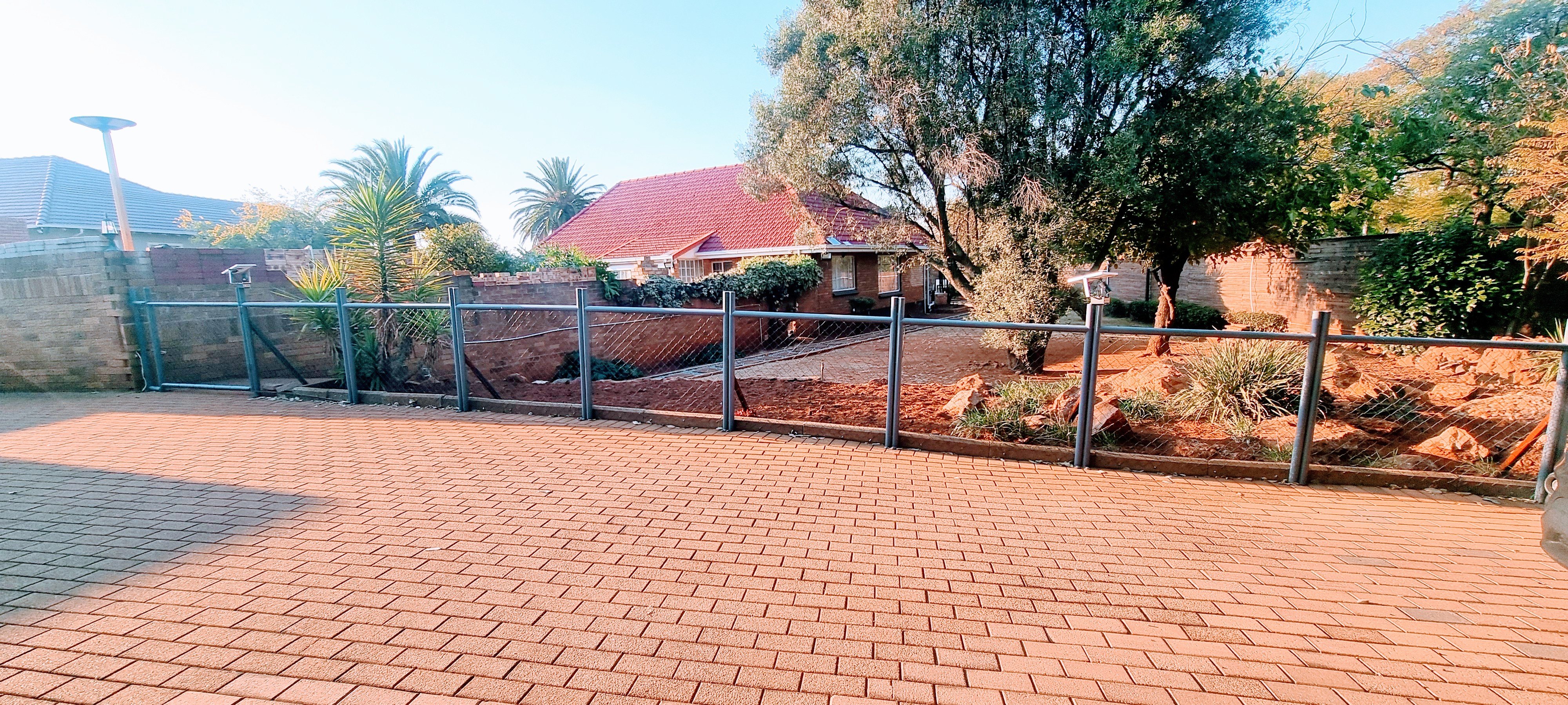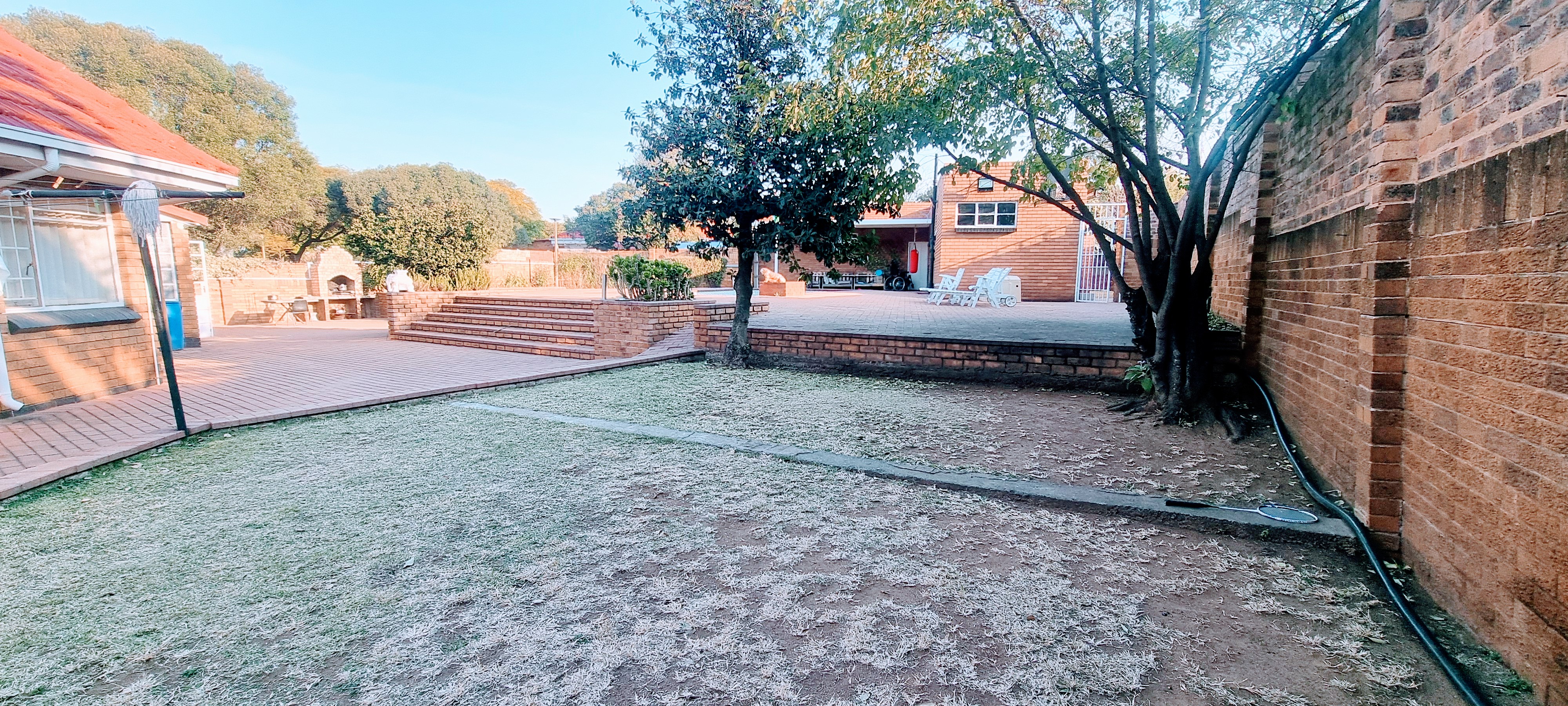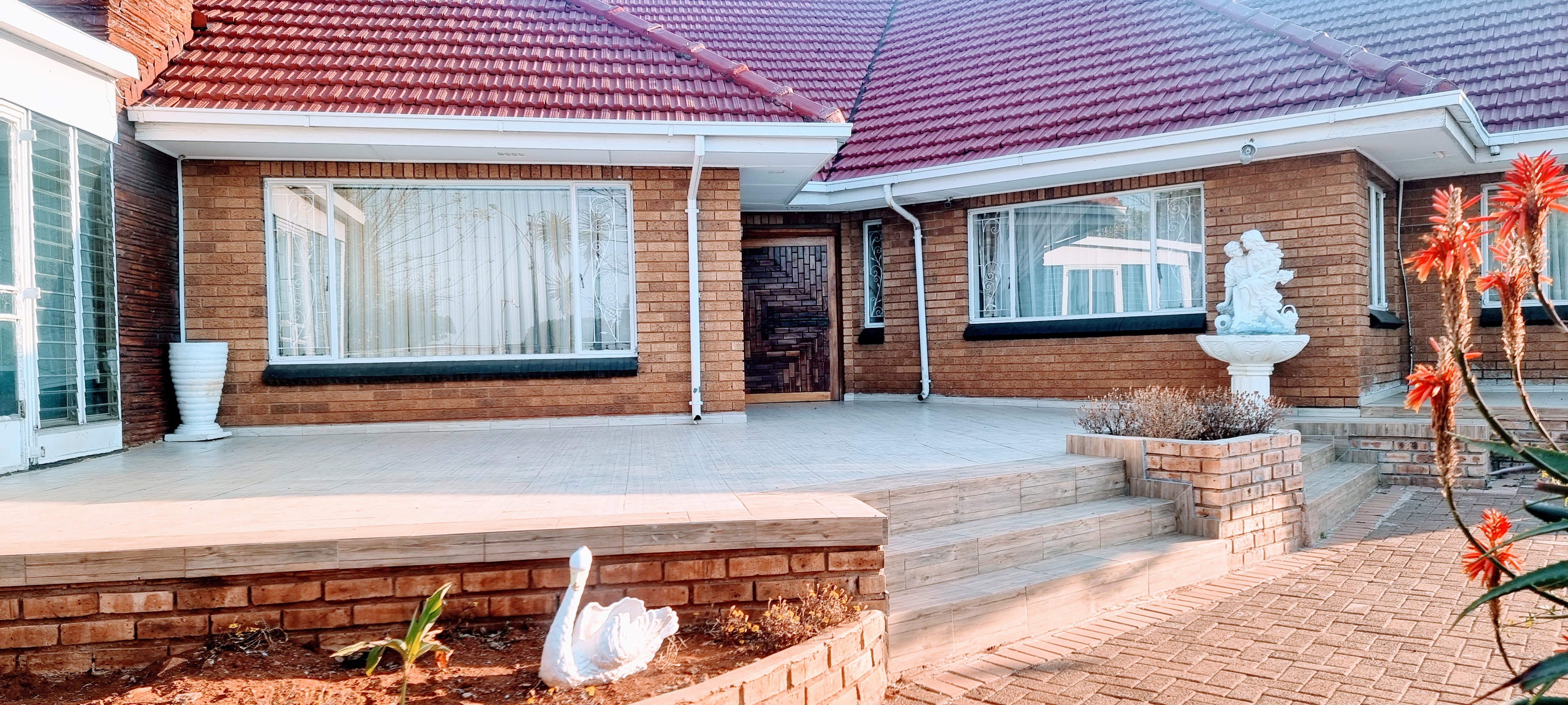 There is a swimming pool, with big entertainment area, double garage, parking for +- 8 cars, cottage, store room.