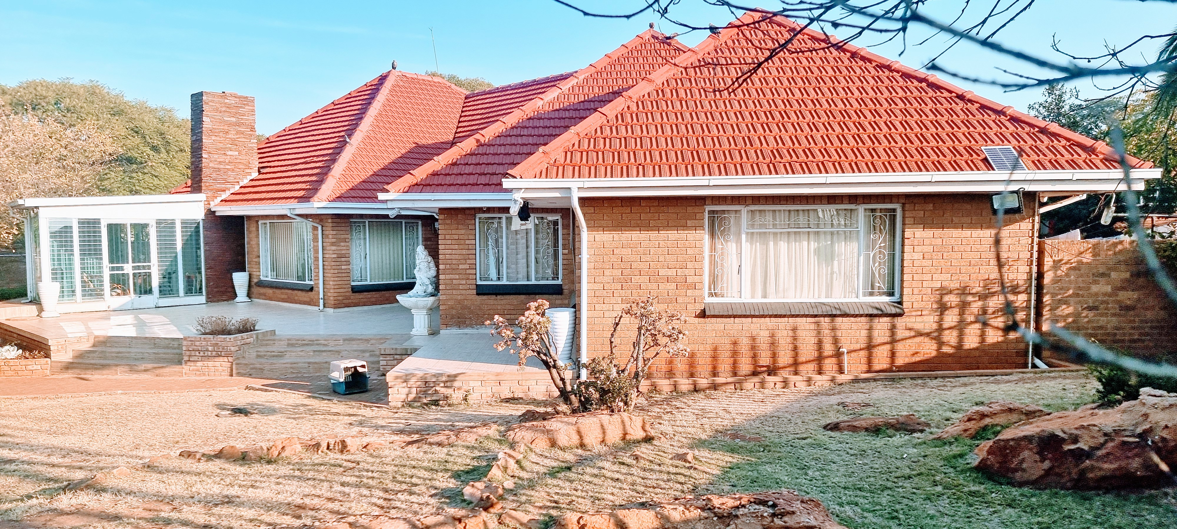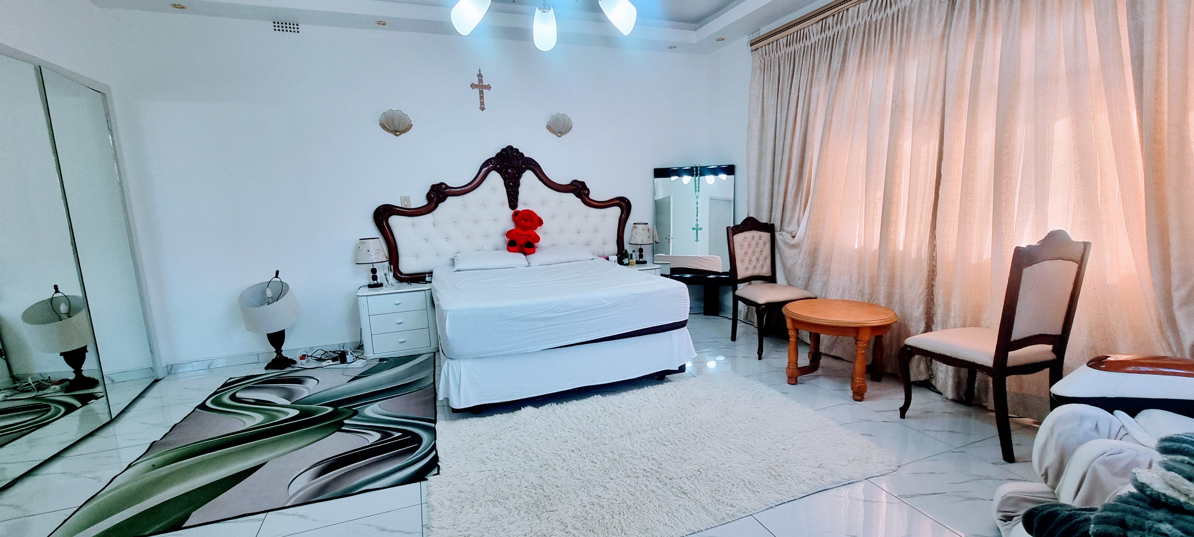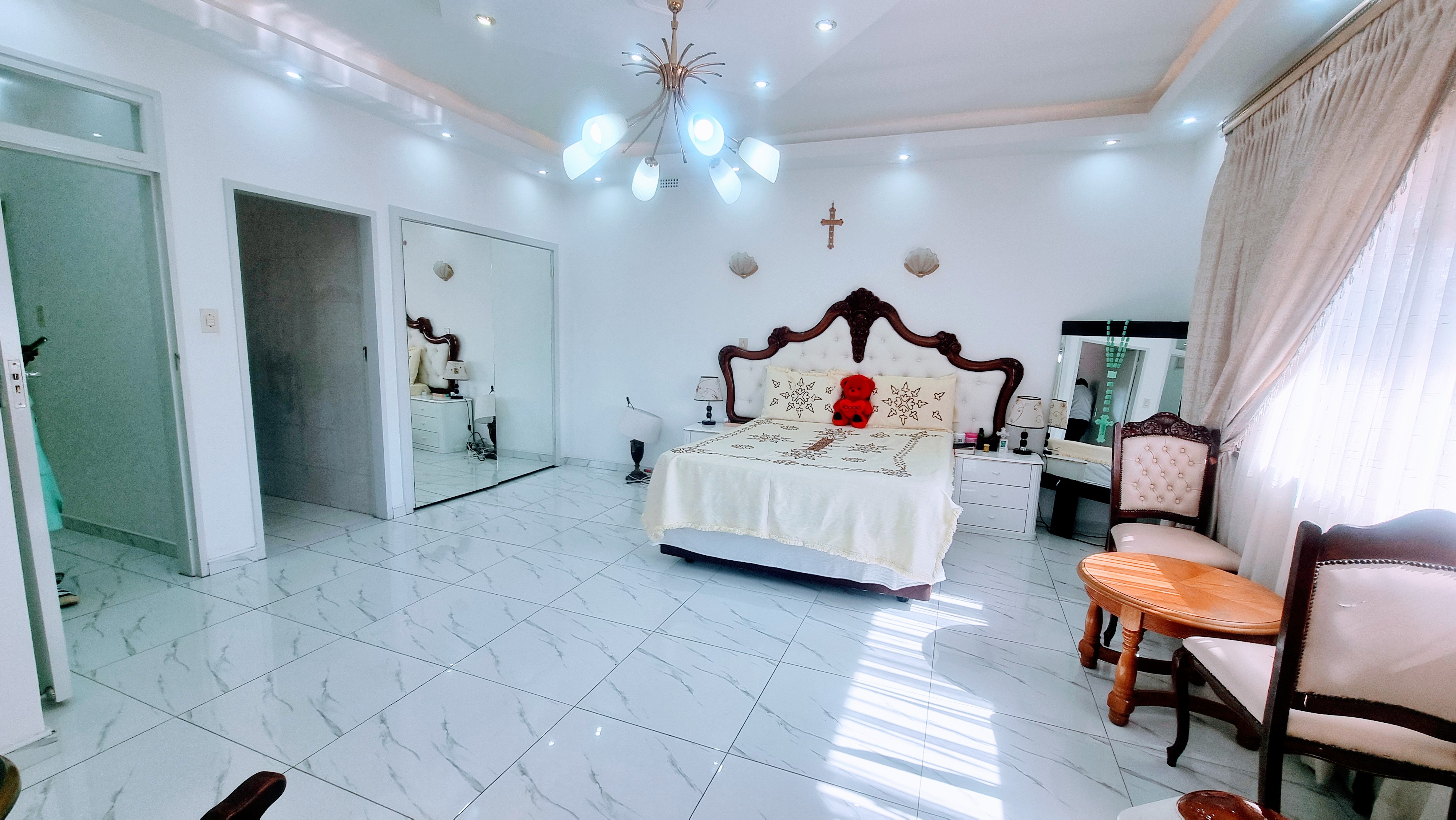 This lovely spacious home consist of 4 bedrooms, in which the main bedroom is an en suite, 2 bathrooms, massive kitchen with granite tops, gas stove and kitchen nook. there is a space for a double door fridge. There is also a scullery. There is a large lounge with a space for a dinning and there is also a bar area, and the sun room with guest toilet. There is a open veranda and a entrance hall.