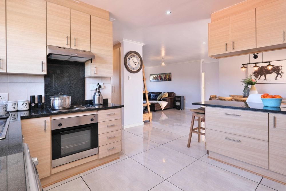 Open plan lounge and kitchen with stove and built-in cupboards.