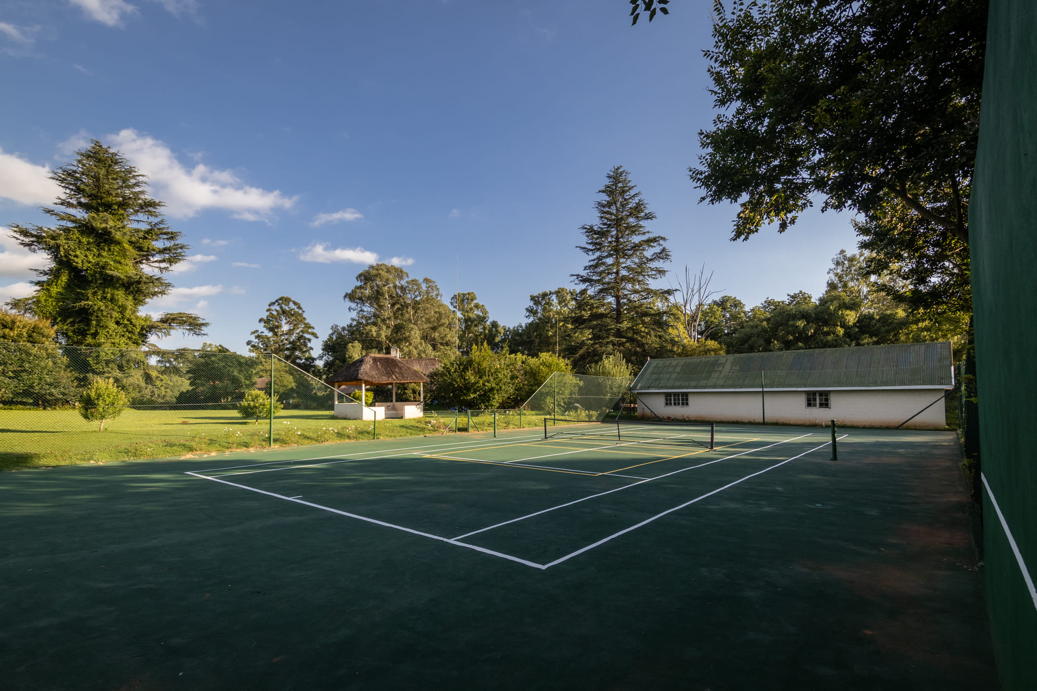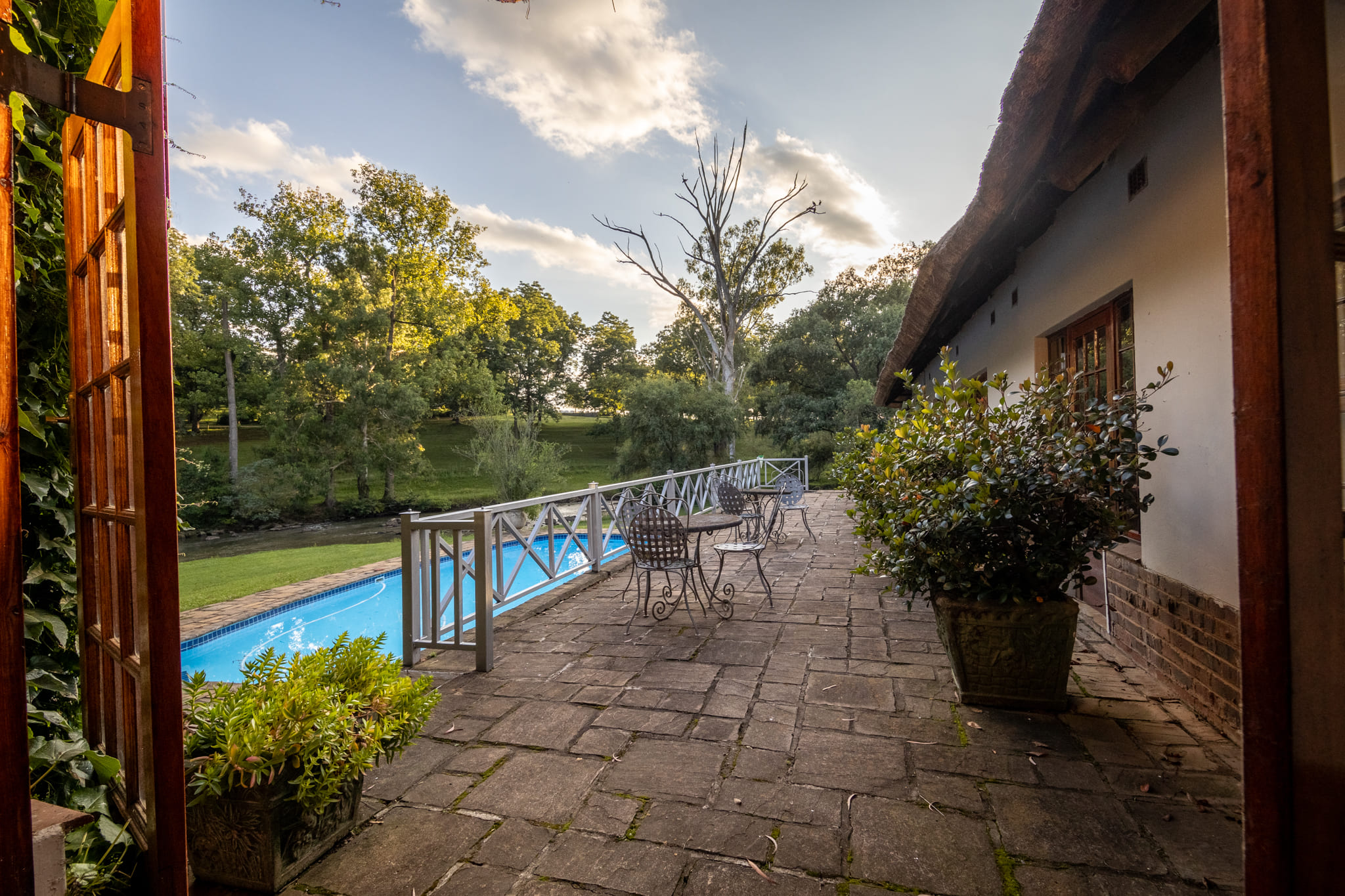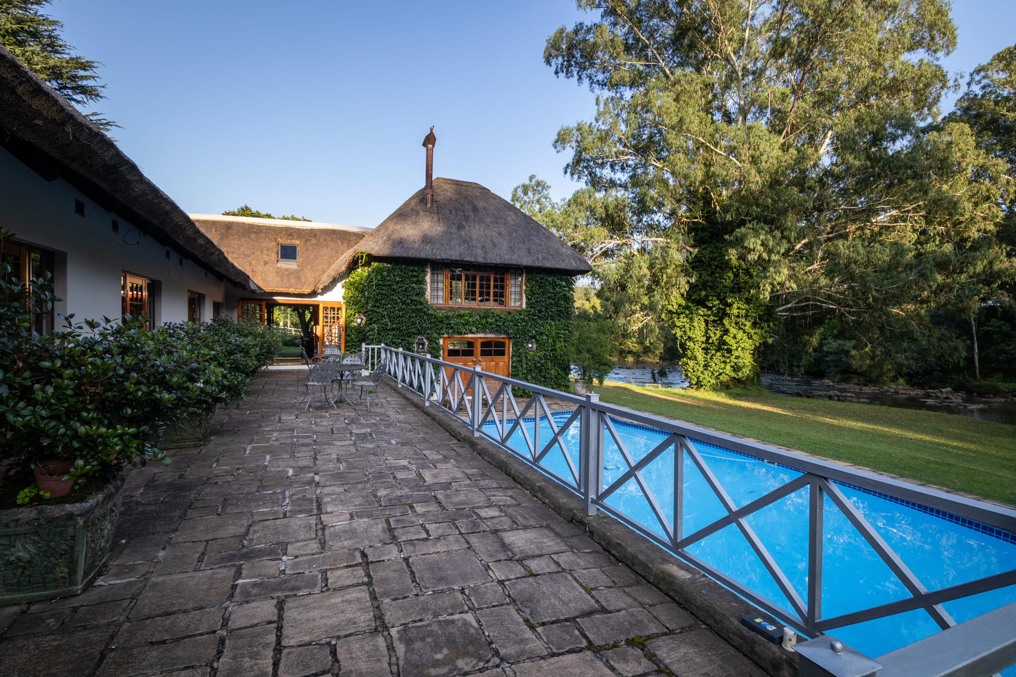 Outdoor features include a refurbished swimming pool overlooking the river and a combined tennis and pickleball court. The irrigated kikuyu pastures are productive and well maintained, supported by the extensive irrigation infrastructure.