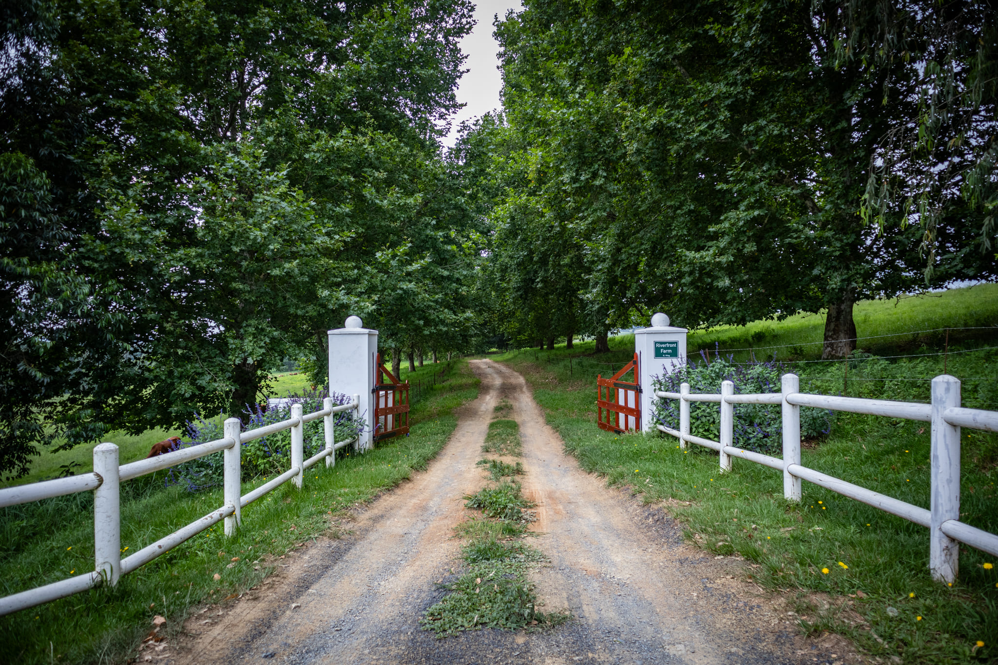 Access is via a concrete strip driveway running from the entrance gate through a long avenue of mature plane trees to the farmstead. The approach is quiet and established, opening into broad pastures with distant river views and a classic Midlands farm setting.