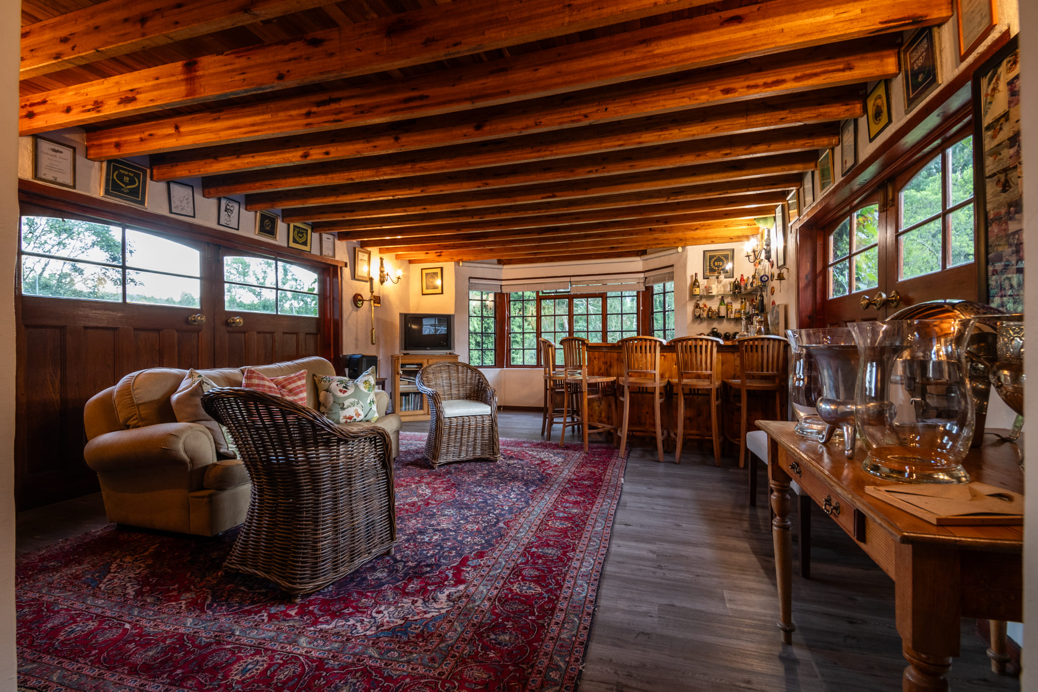 A fitted pub area connects directly to the recently refurbished swimming pool, making it well suited to relaxed entertaining. A fully enclosed sunroom, glazed on three sides, looks out over the gardens, river and farmland and is a usable space throughout the year.