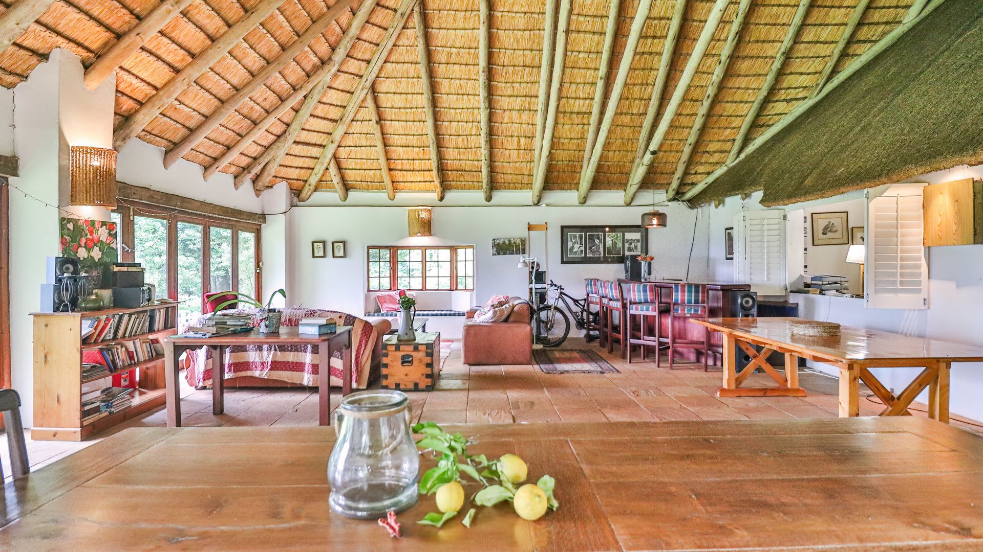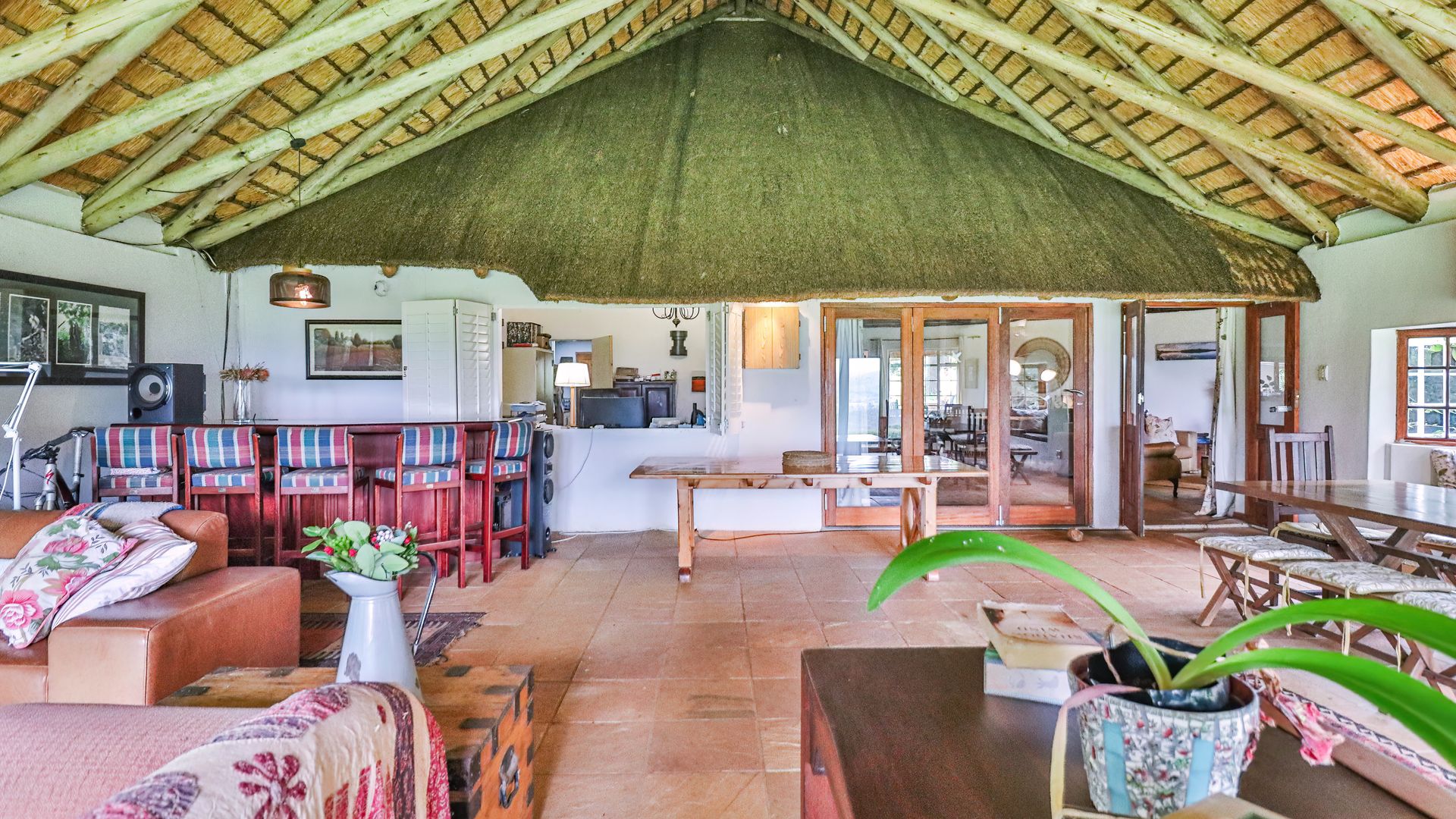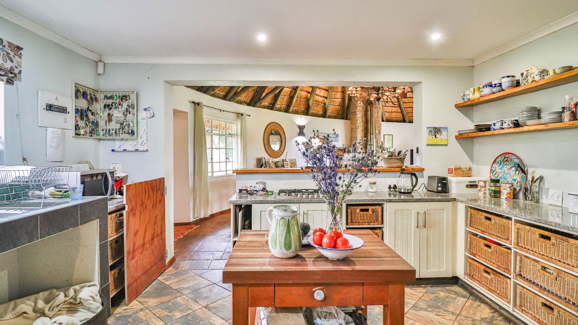 The thatched main house is perfectly situated away from the cottages and farmhouse. The charming home offers two bedrooms and two bathrooms, an open plan kitchen, lounge, dining area leading into an expansive entertainment area, overlooking the lawns and garden. The office can also be a converted to a third bedroom if required