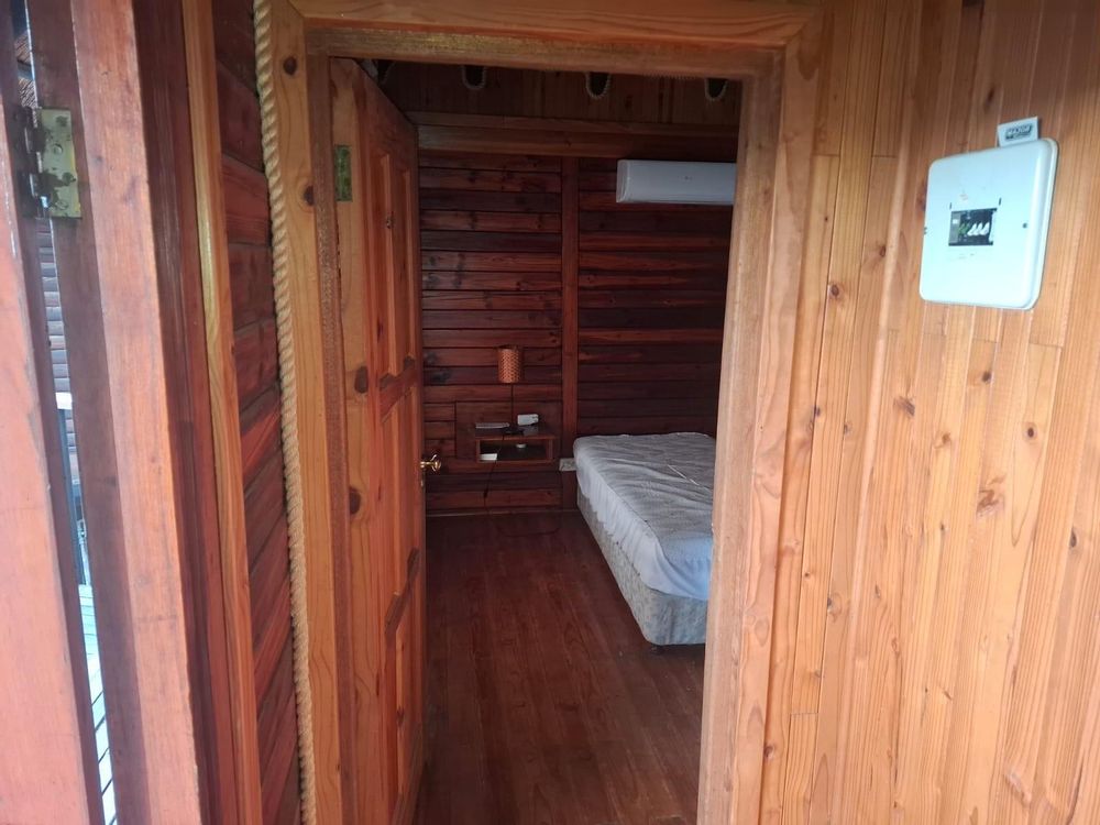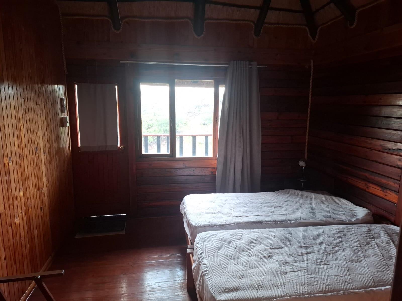 The home offers a true wooden-cabin feel with a thatch roof and elevated walkways connecting each room.