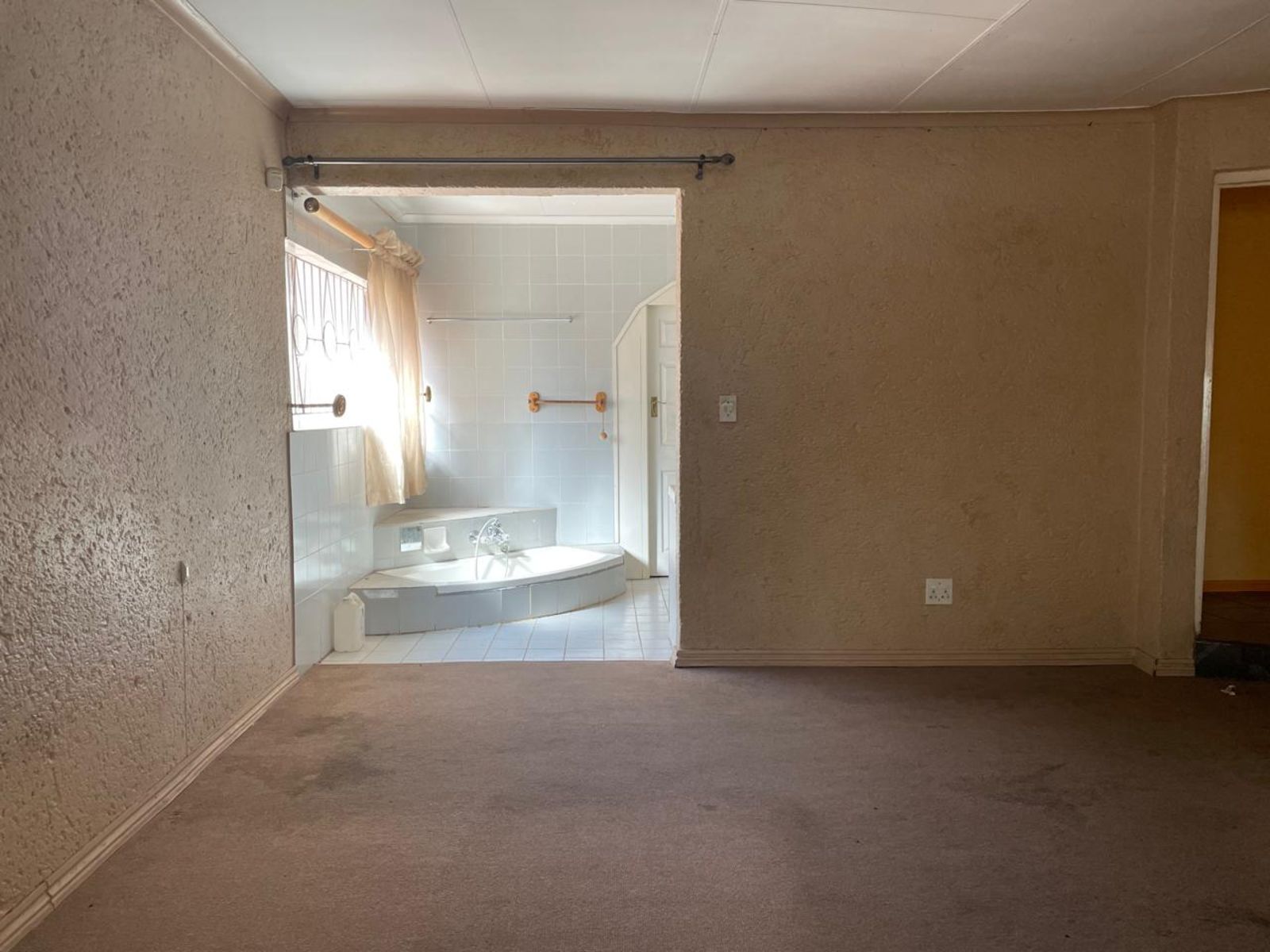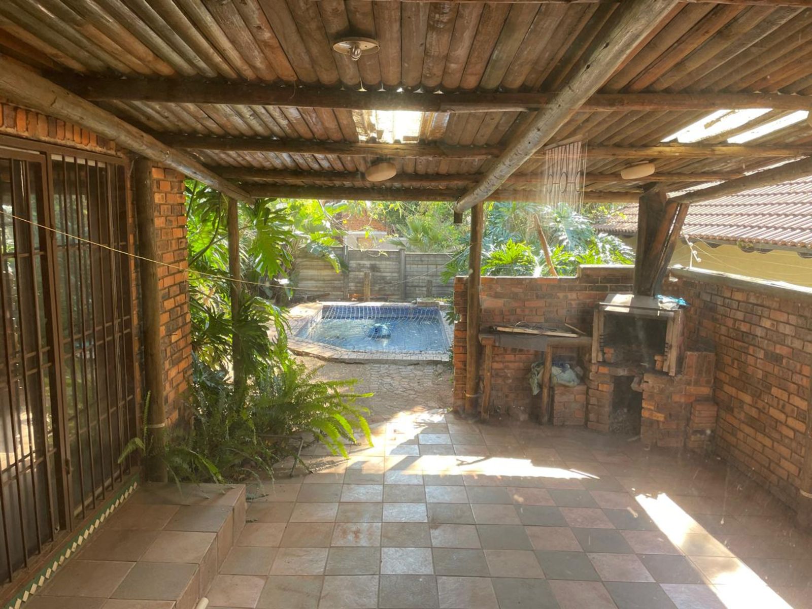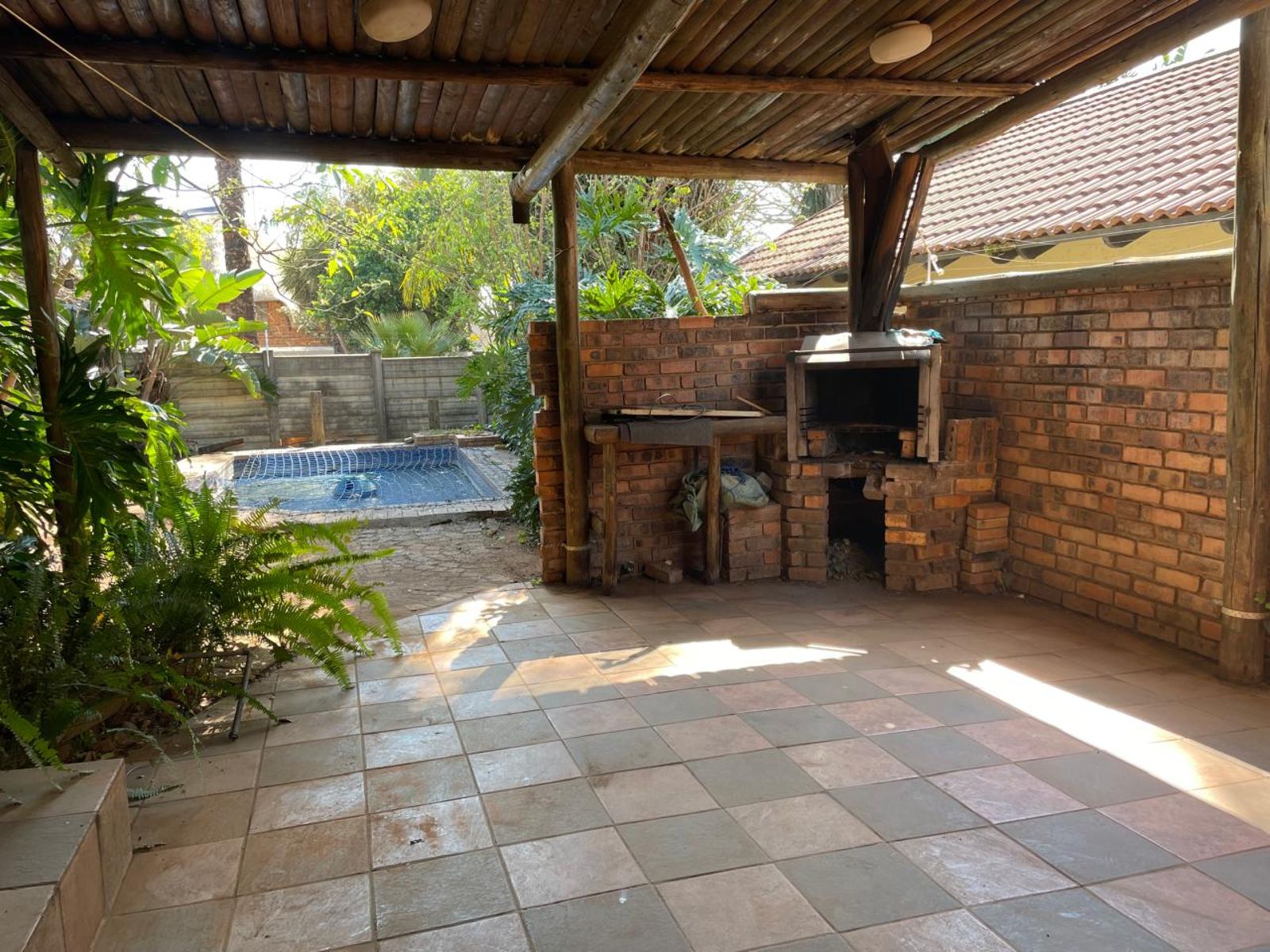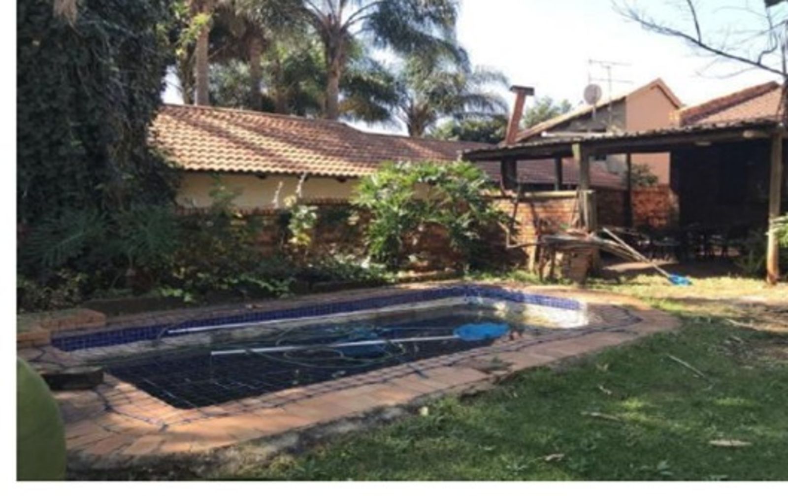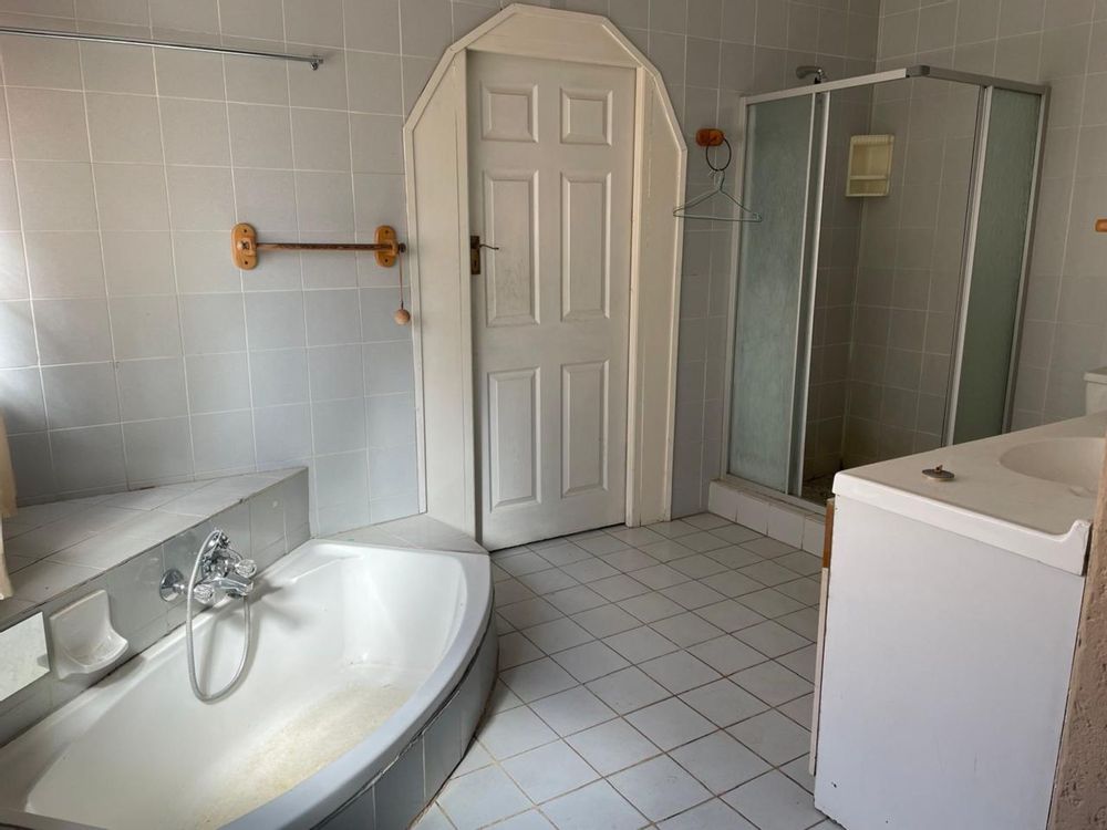 LARGE FAMILY HOME NEWLY RENOVATED, OFFERING 3 FULL BEDROOMS, ALL BUILT-IN CUPBOARDS. THE MAIN BEDROOM HAS AN EN-SUITE BATHROOM AND A LARGE WALK-IN CLOSET. THE 2nd BATHROOM IS SHARED BY THE OTHER 2 BEDROOMS. THE LOUNGE IS SUNKEN WITH A DINING AREA; THE KITCHEN HAS ENOUGH CUPBOARD SPACE, AND APPLIANCES ARE IN PLACE. COMPLETE WITH SCULLERY AND CORNER PANTRY. THE DINING AREA LEADS DIRECTLY INTO THE GARAGE. THE INDOOR ENTERTAINMENT AREA HAS A BUILT-IN BAR AND JACUZZI. A PATIO WITH BUILT-IN BRAAI. A SWIMMING POOL STAFF QUARTERS