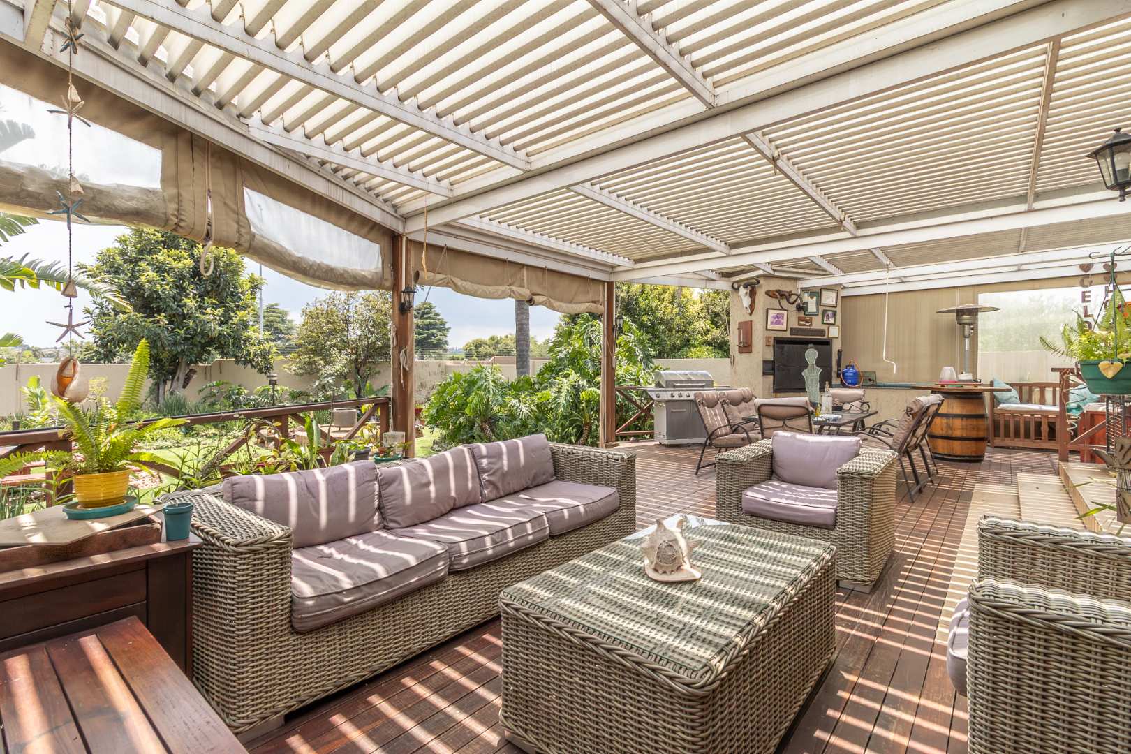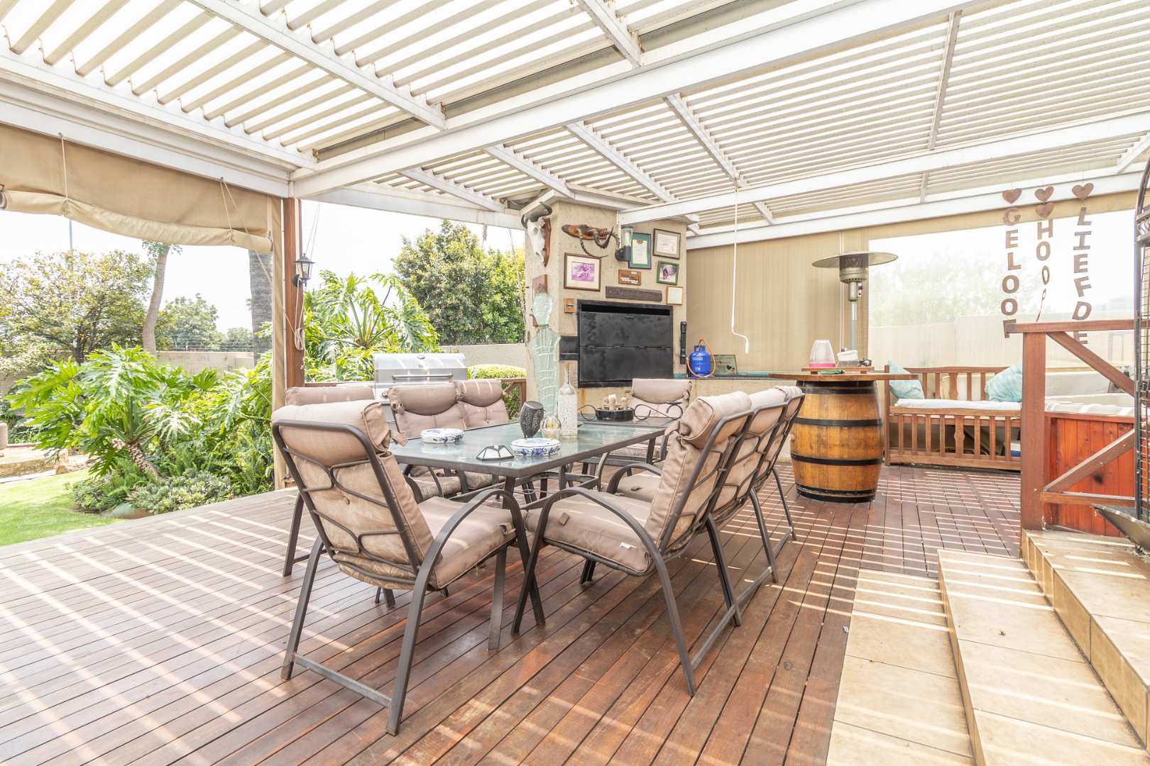 Step outside to a large louvre-covered patio, perfect for those who enjoy entertaining in true South African style. Whether hosting a braai or simply relaxing and chatting with family and friends, this space is ideal for any occasion. The adjustable louvre awning on the patio provides the perfect spot for lazy Sunday mornings, where one can unwind in the Jacuzzi or enjoy a good book and a cup of coffee. It also offers the convenience of adjusting the roof based on the weather, allowing you to keep an eye on the kids as they play in the secure, spacious garden.