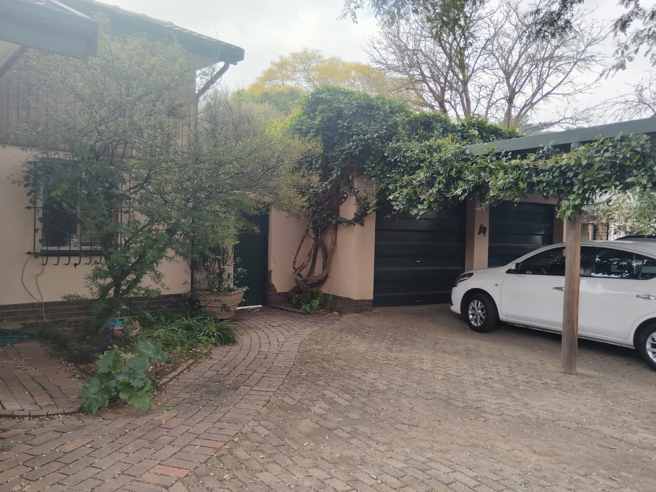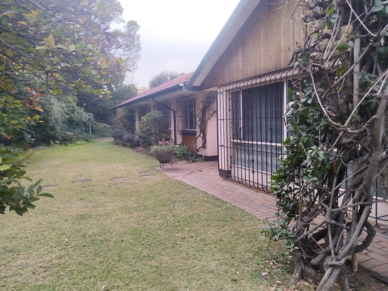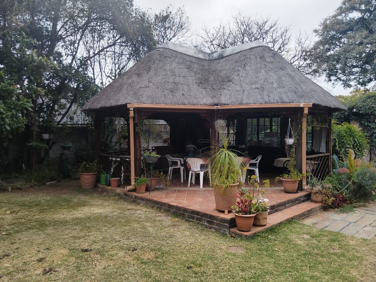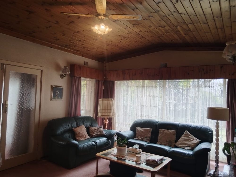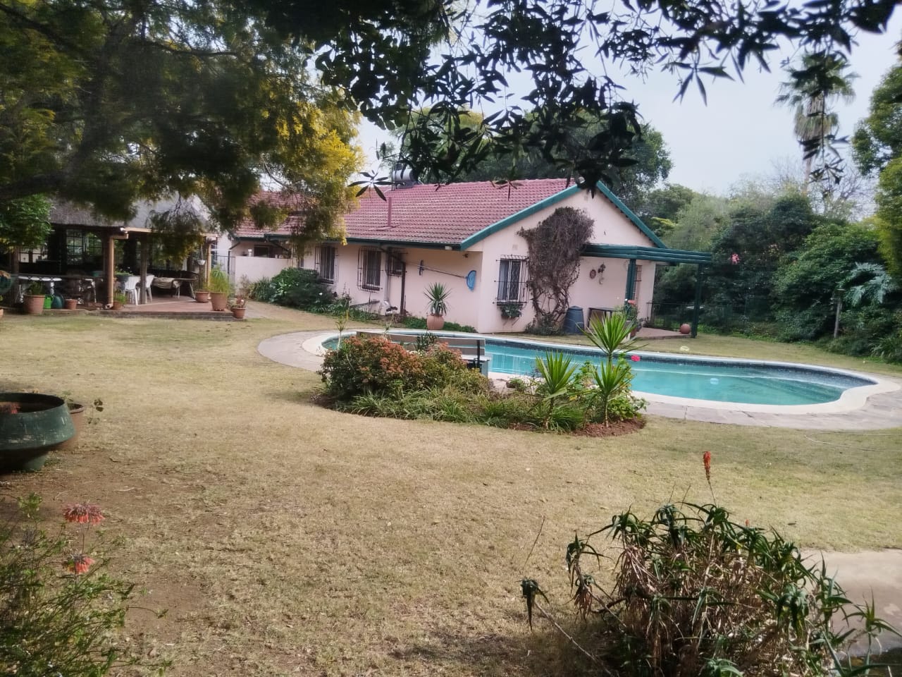 Outdoors, enjoy a peaceful garden space featuring a koi pond, water feature, thatch gazebo, and a sparkling pool — perfect for entertaining. A braai area, double garage, additional parking, and staff accommodation complete the exterior. The property is secured with Spanish wrought iron bars and benefits from a borehole, electric points in the garden, and an outside toilet and basin.