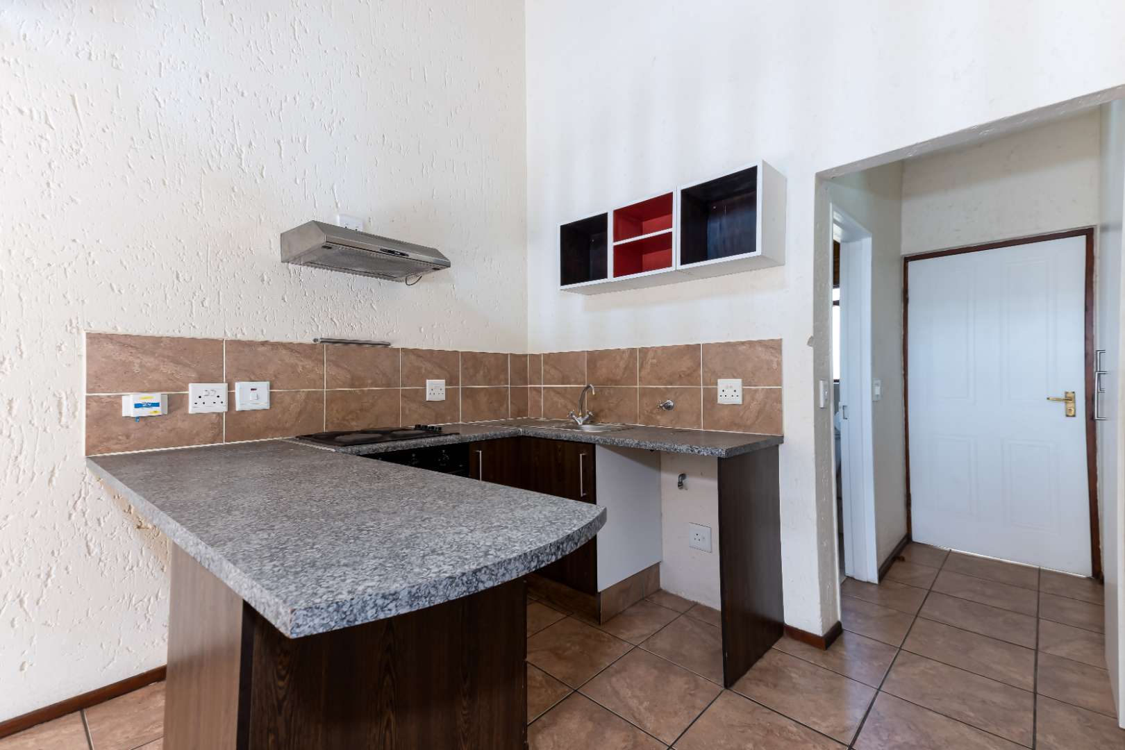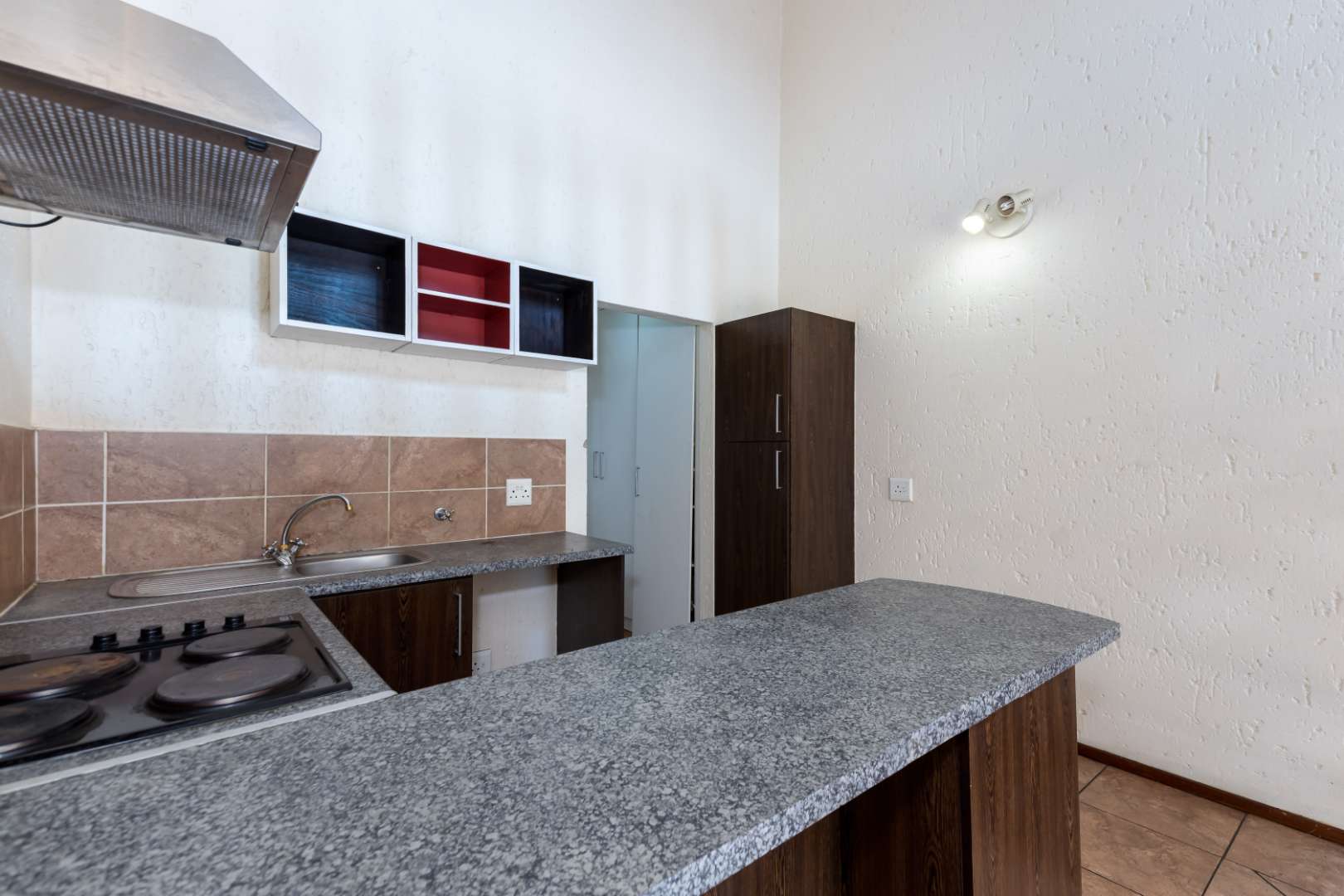 A welcoming entrance into the home flows onto the open concept kitchen and lounge spilling onto a sunny balcony, overlooking the treetops from below. The open plan kitchen boasts an electric stove and oven plus extractor fan, under counter space for 1 appliance, single door fridge space, plus ample built-in cupboards.