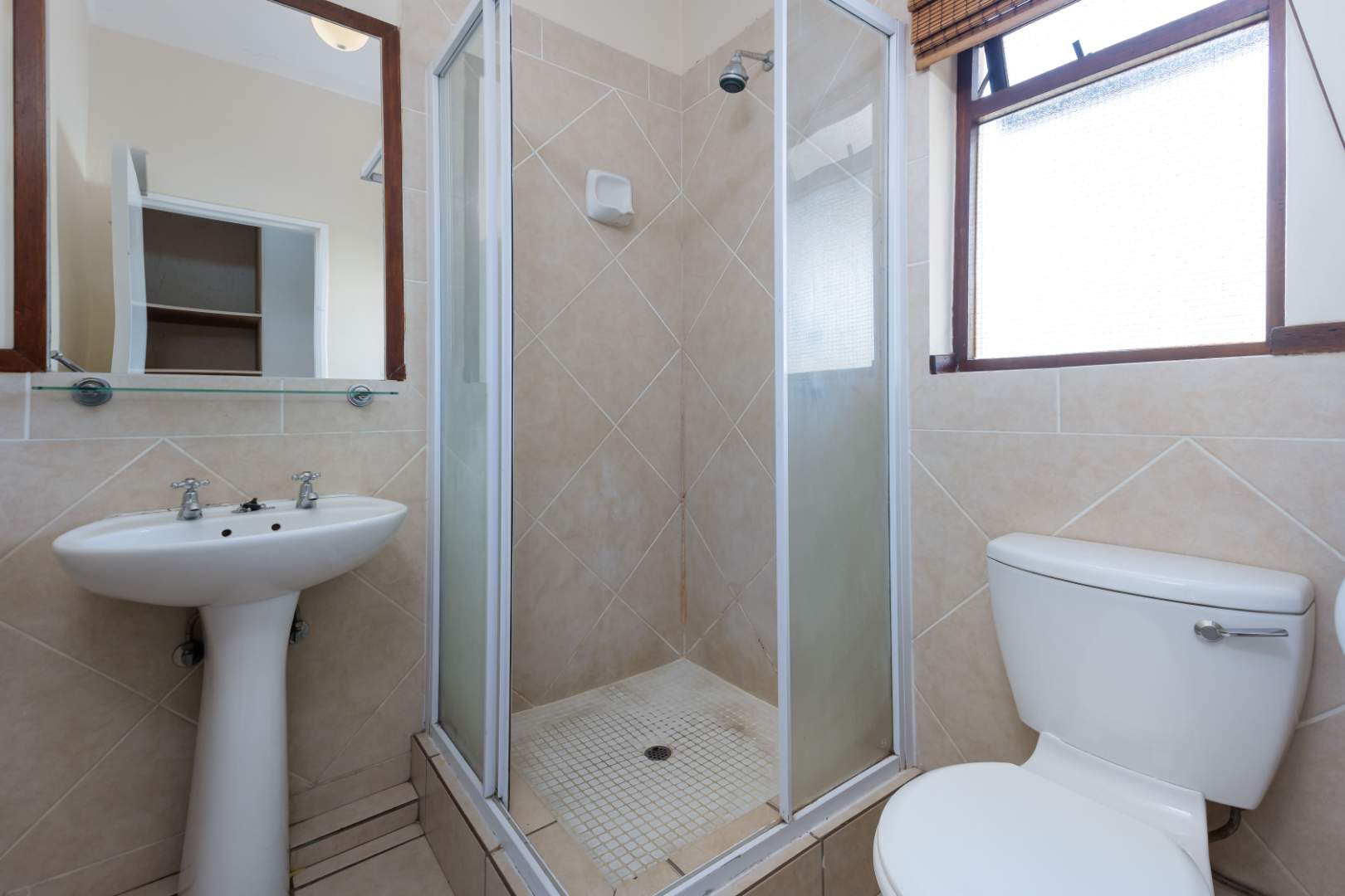 1 Sun-filled spacious loft bedroom plus a bathroom with a shower, basin, and loo.
