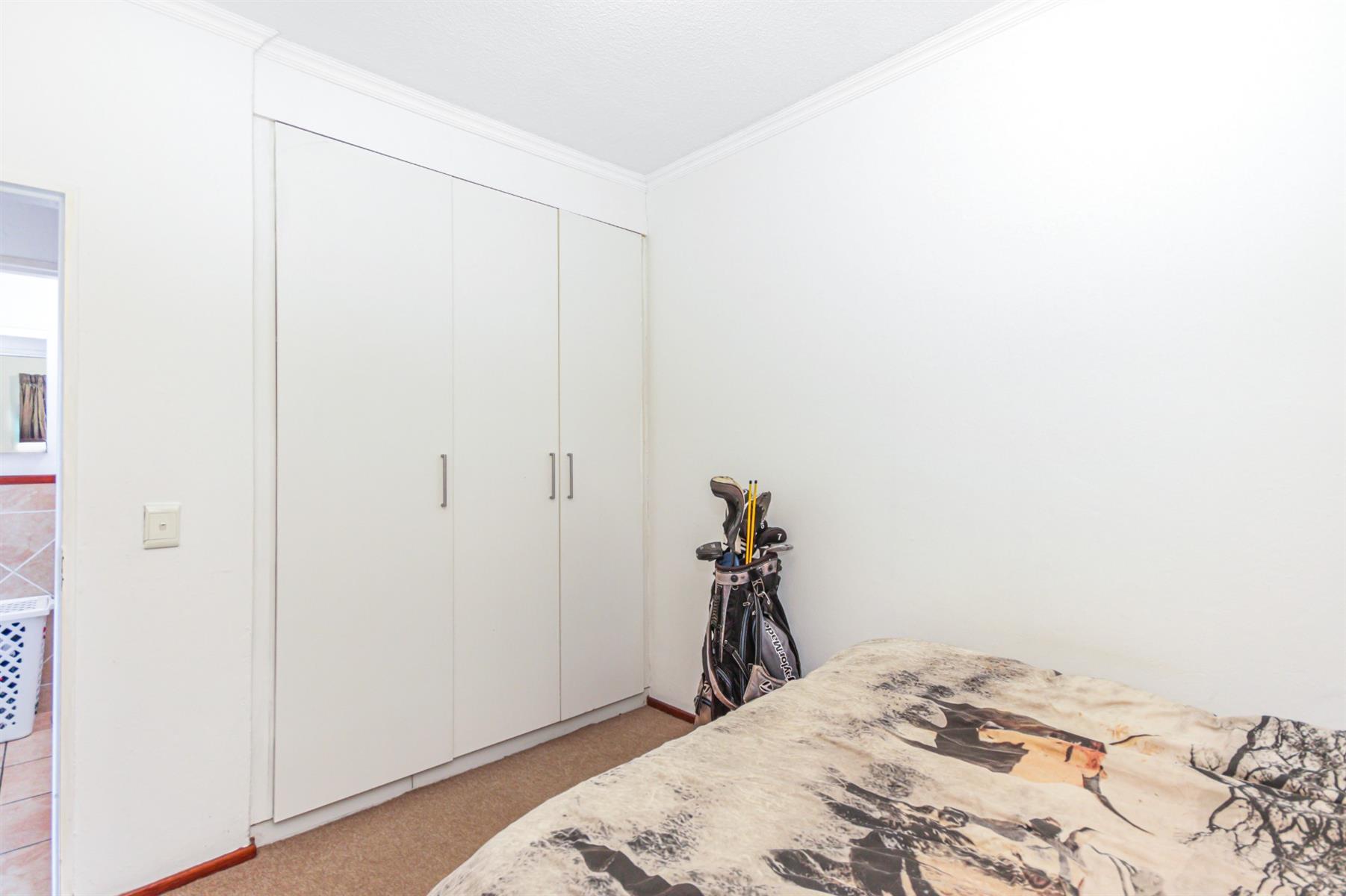 A carpeted bedroom with built in cupboards and natural light