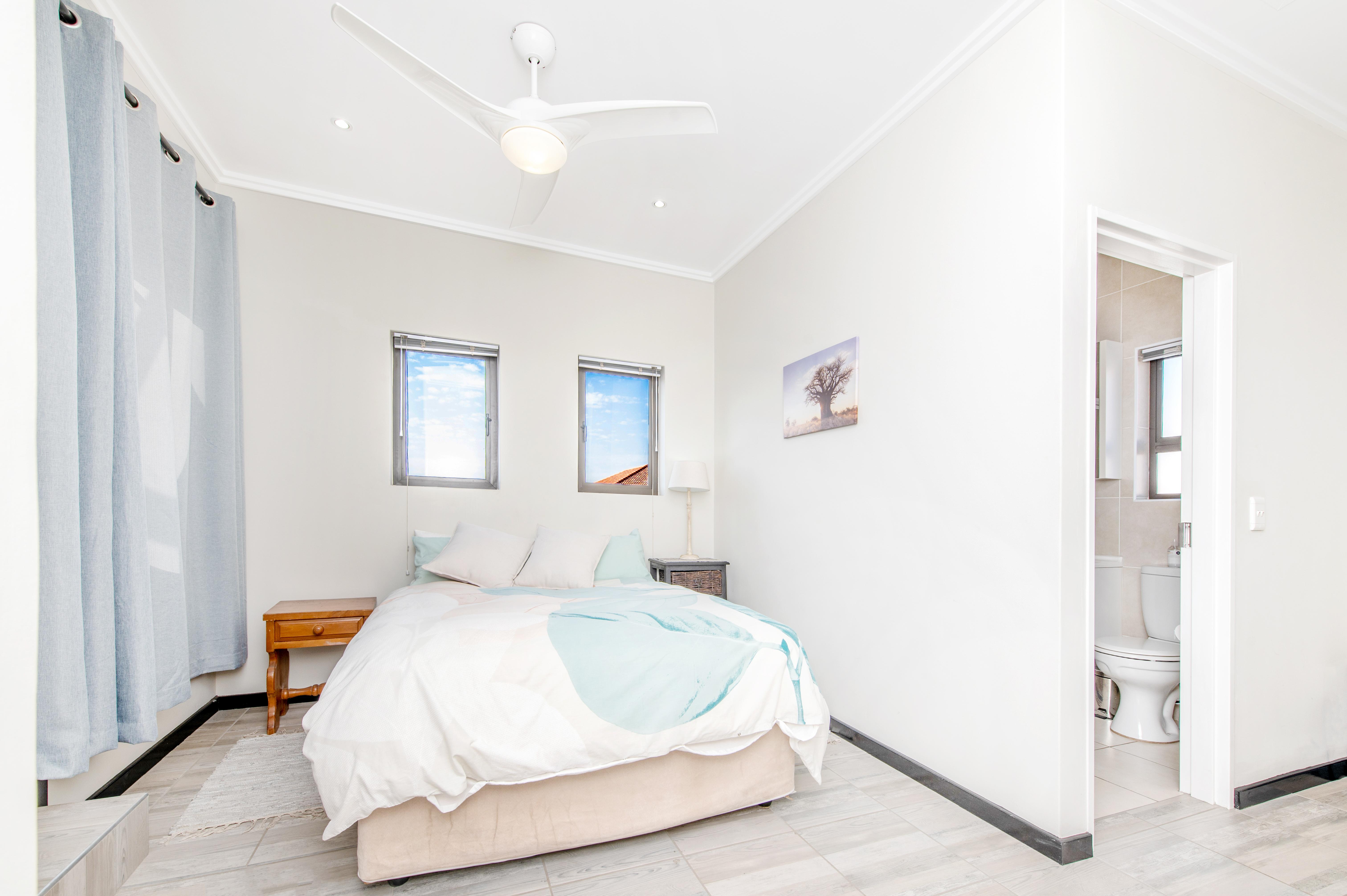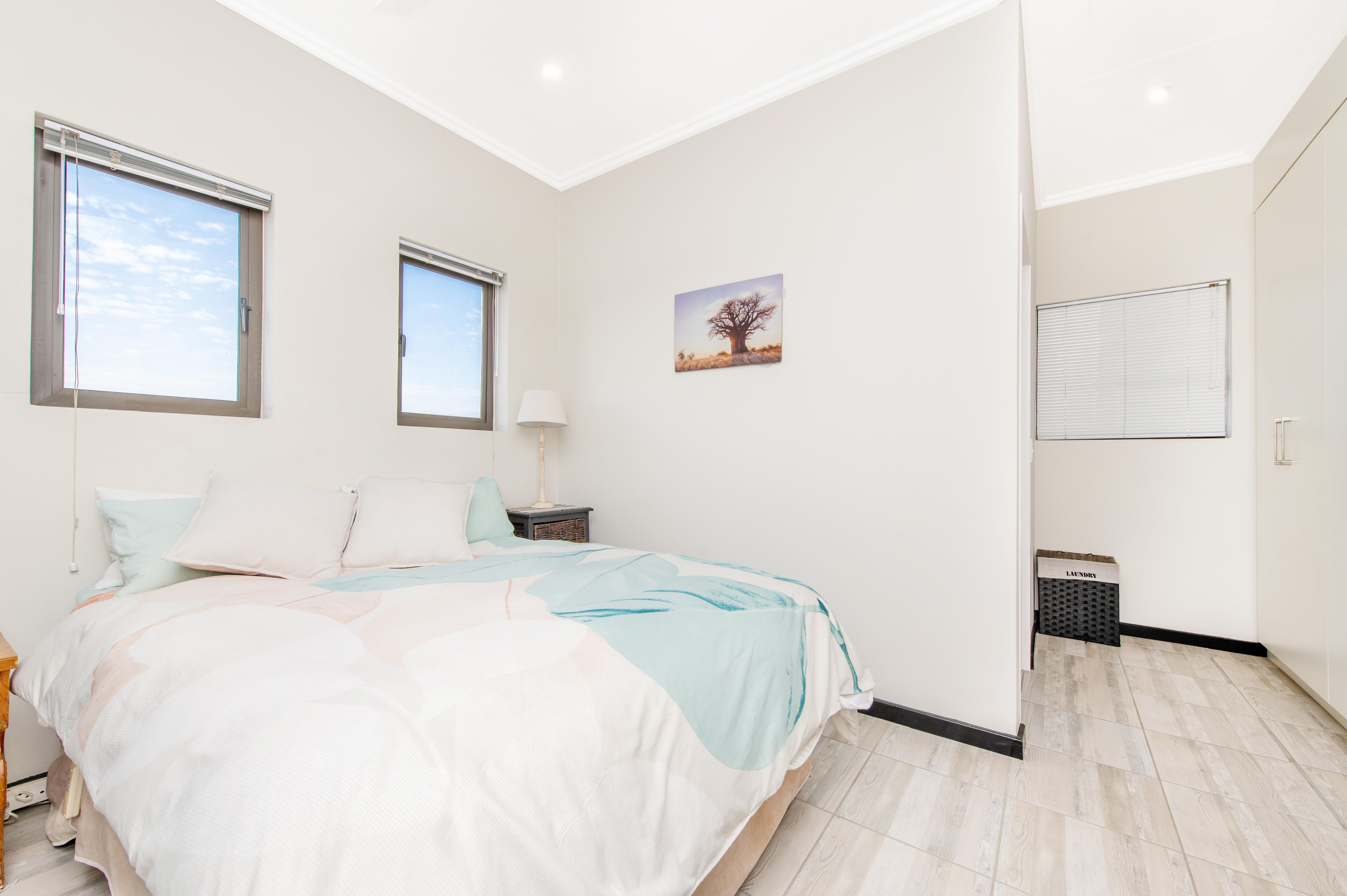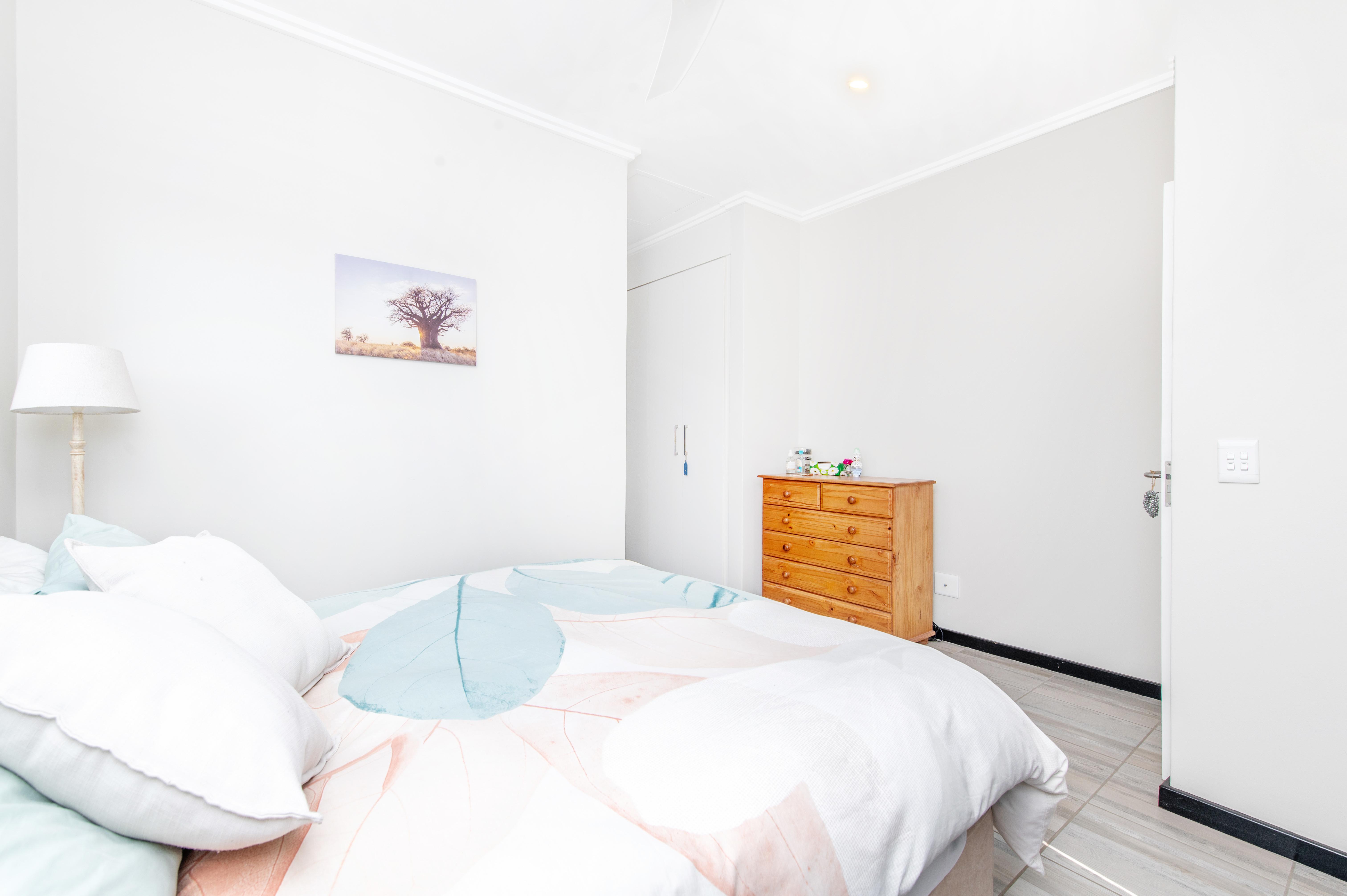 The bedroom is generously proportioned and features built-in cupboards, providing ample storage for your belongings. It offers a serene sanctuary to unwind after a long day, with its soothing ambiance and a perfect balance of comfort and style.