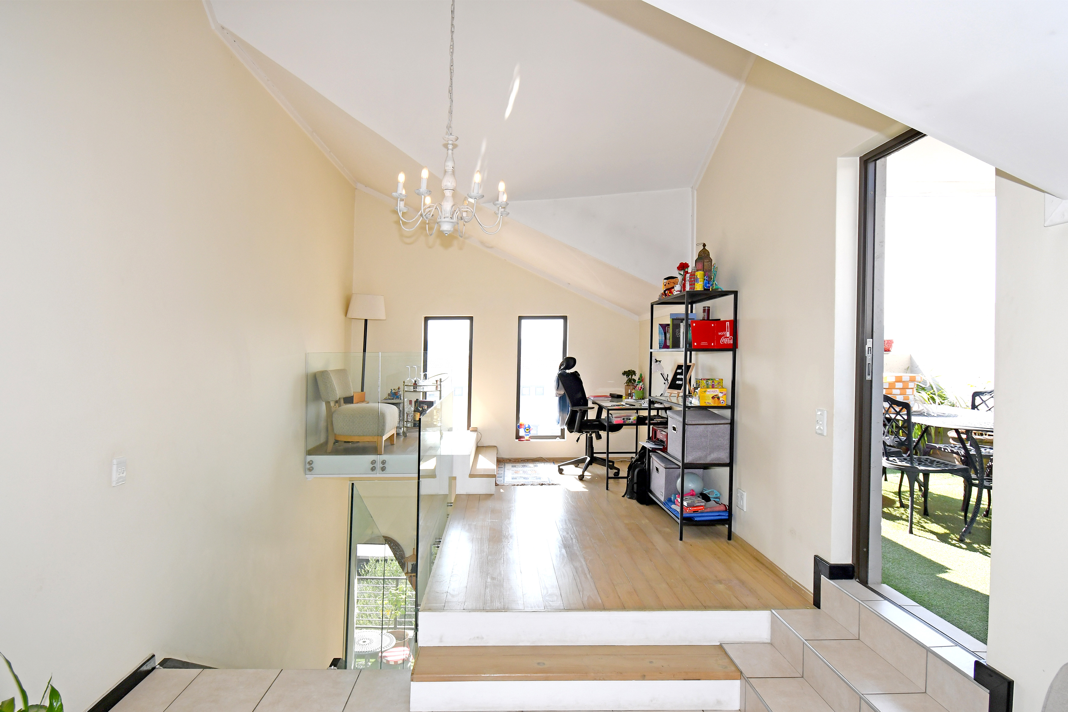 Upstairs, the loft opens into a cozy lounge — perfect for movie nights, relaxed reading, or casual entertaining. An extended section of the loft creates an ideal space for a home office or creative nook. Slide open the doors to a covered balcony with lovely views — your private spot for morning coffee or sunset unwinding.