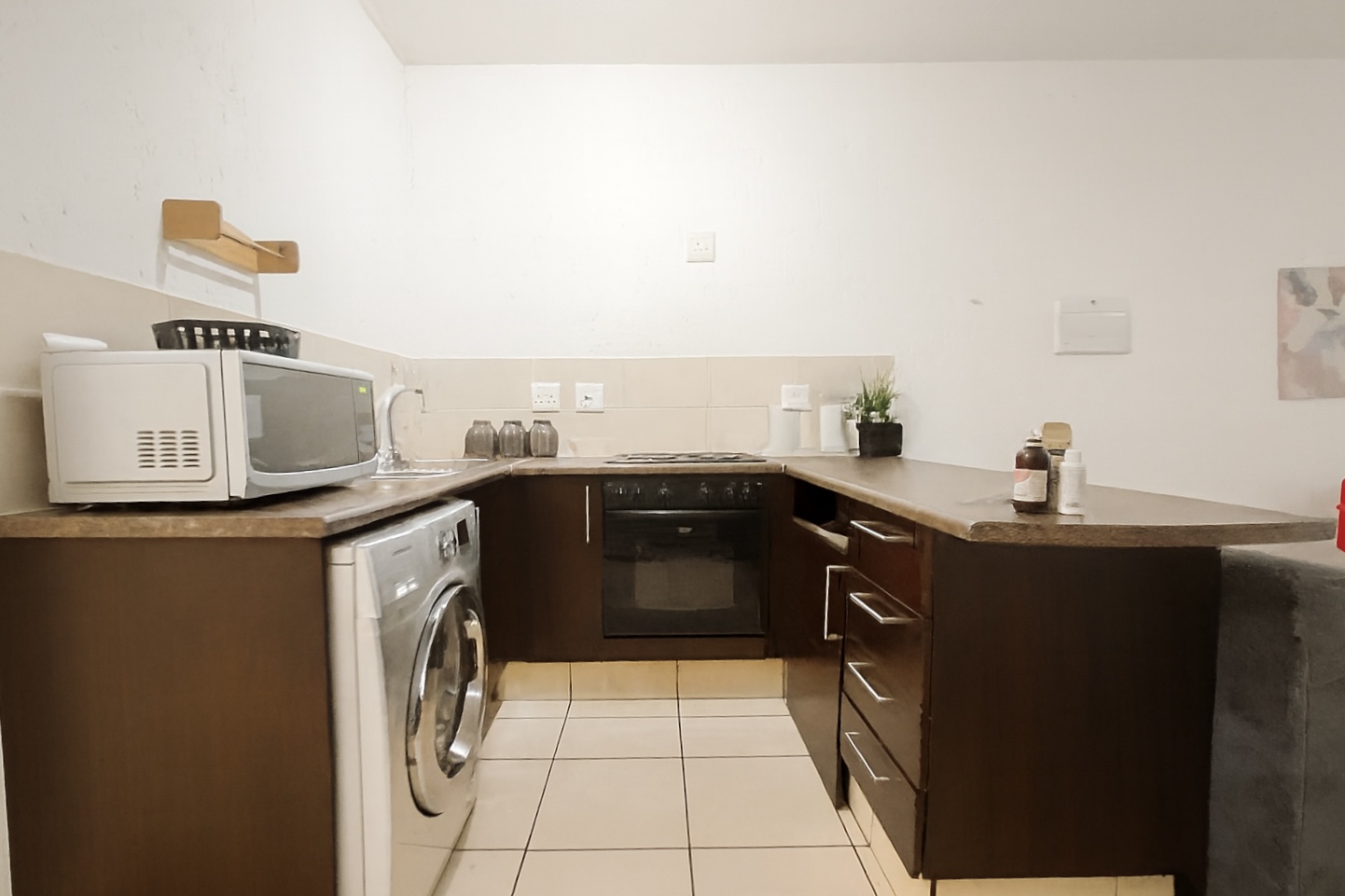 This ground-floor studio offers a functional open-plan layout with a combined lounge and bedroom area featuring built-in cupboards. The kitchen includes space for one under-counter appliance and leads to a neat bathroom with a shower. The bedroom opens onto an enclosed patio that extends to a private garden, perfect for relaxing or entertaining in comfort and privacy.