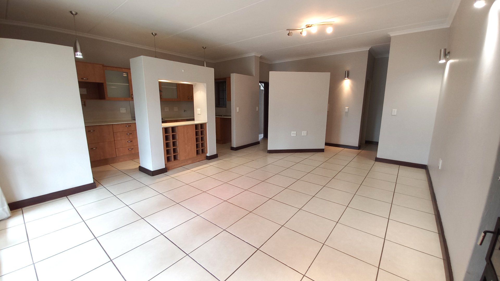 The open-plan kitchen is designed with practicality in mind and includes a built-in wine rack, extractor fan, space for two appliances, and room for a single-door fridge.