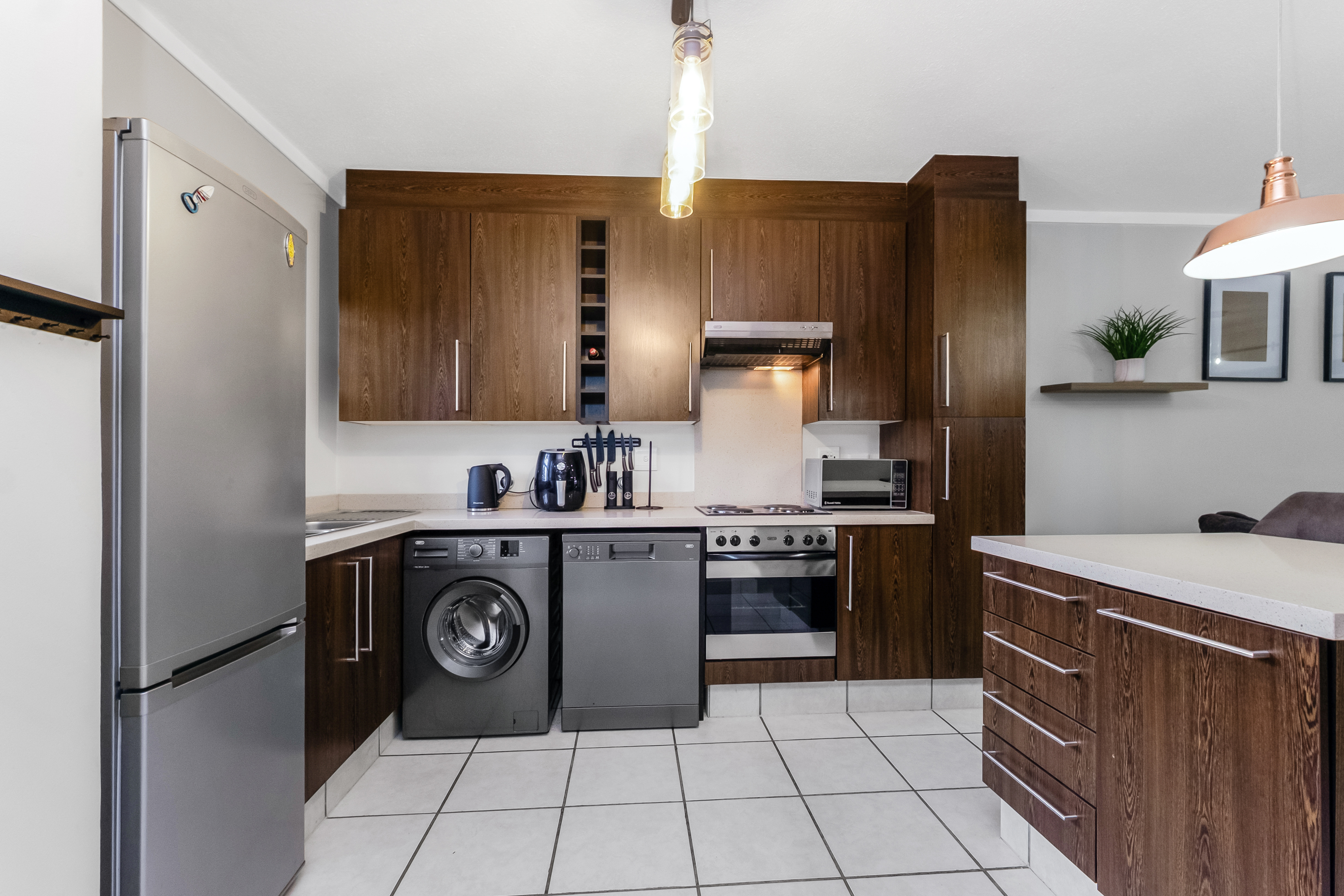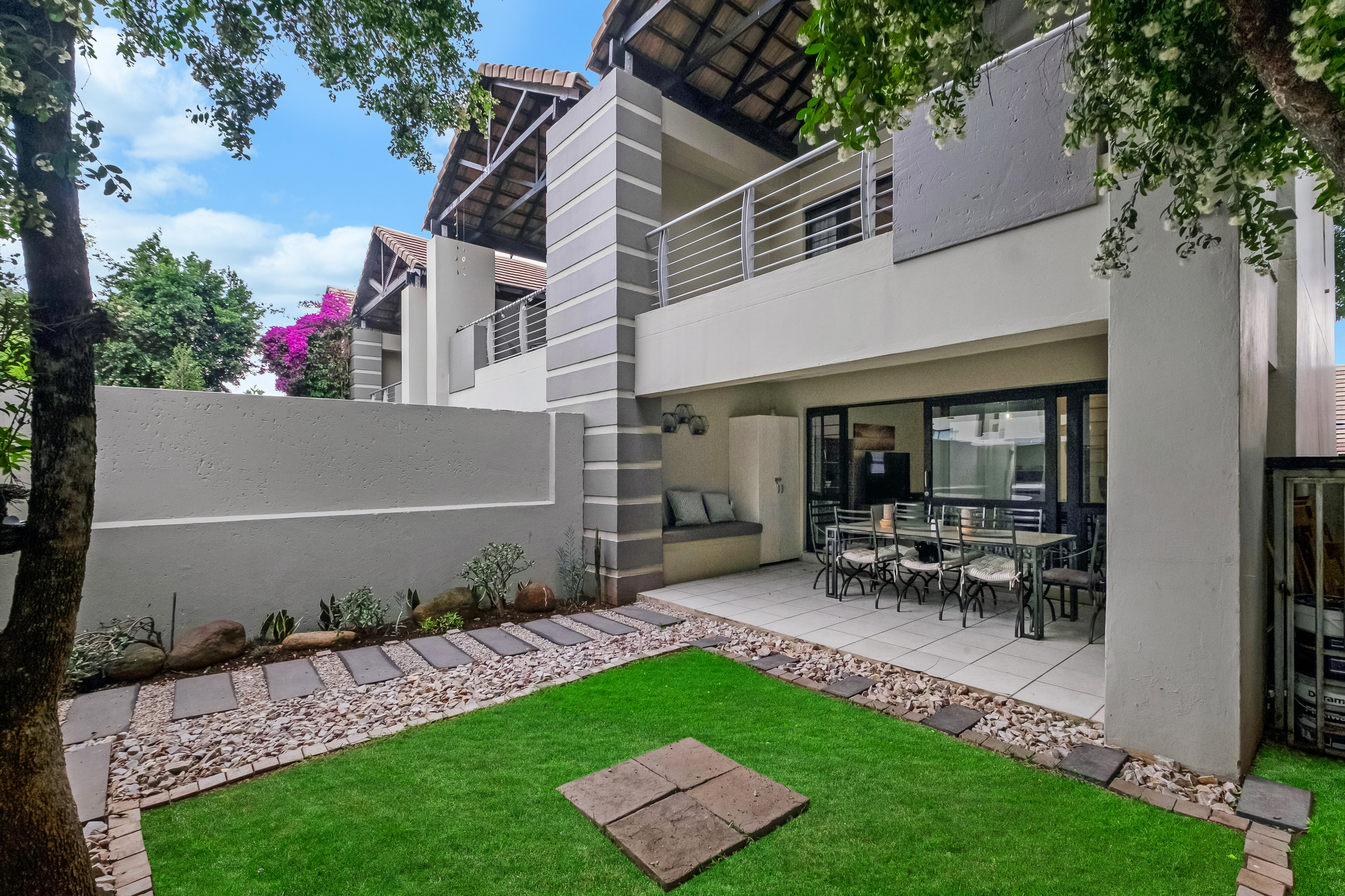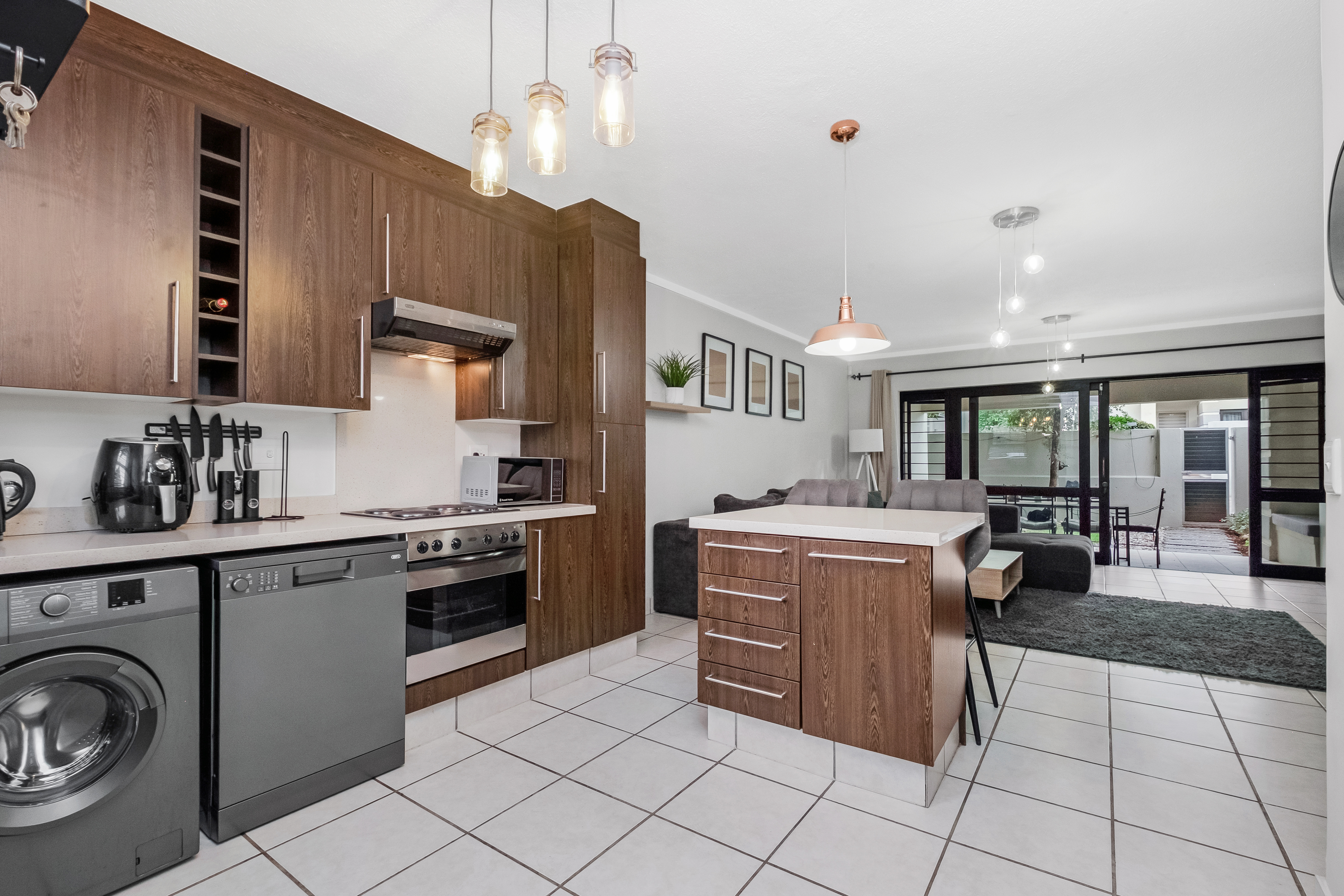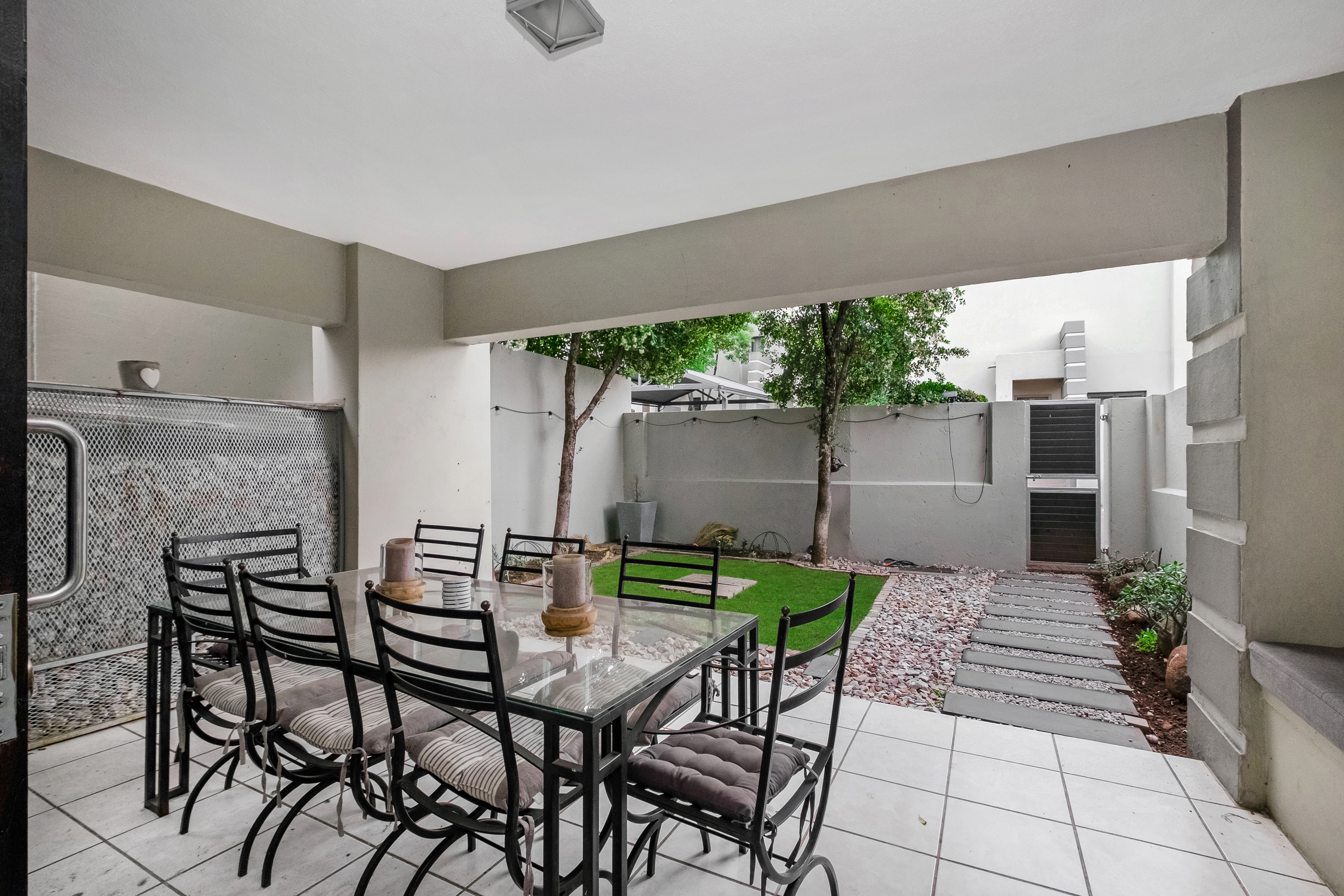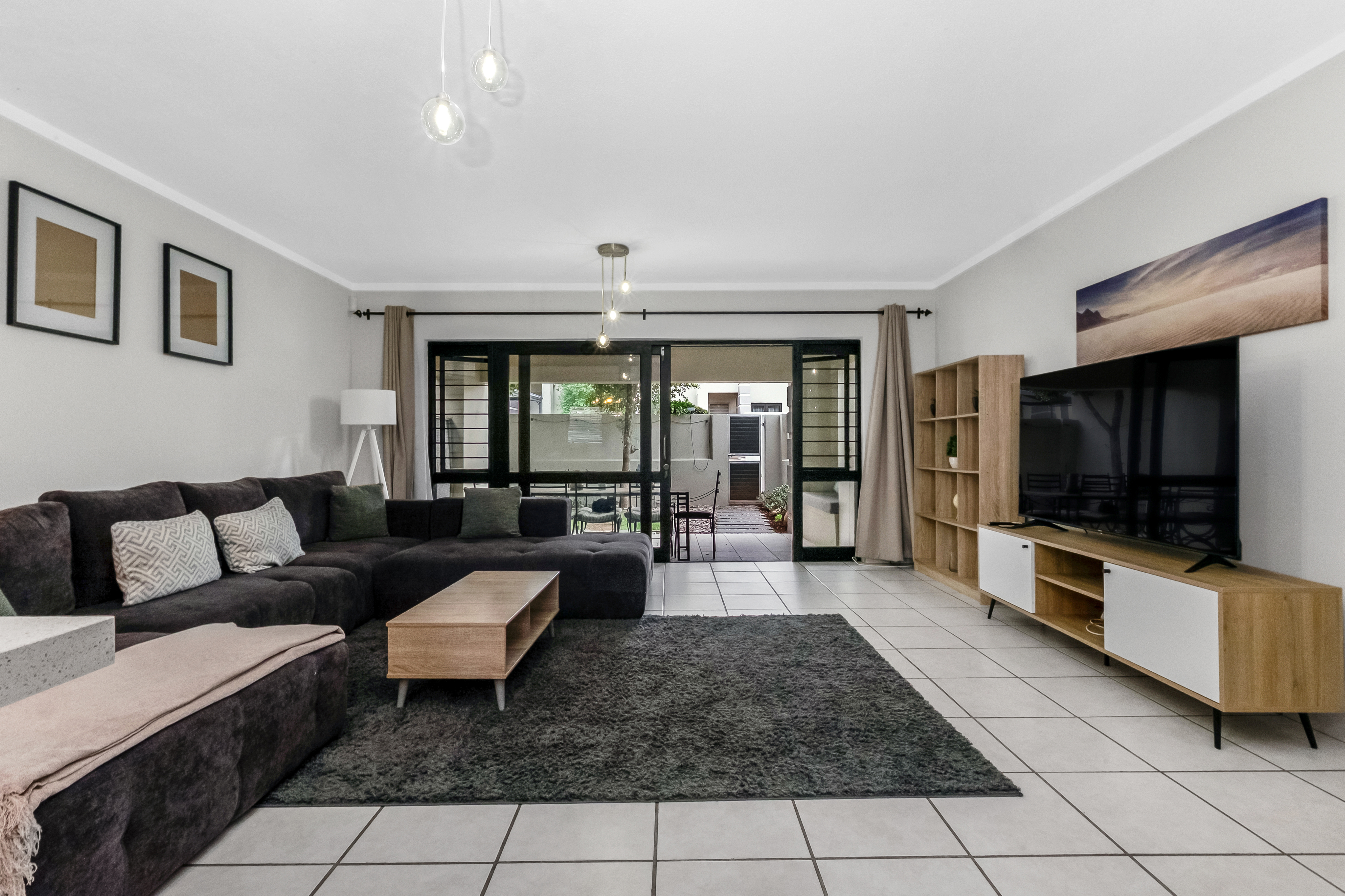 The living and dining area exude comfort and elegance, furnished with plush seating and soft lighting that create a homely yet stylish ambiance. Large glass doors open onto a covered patio overlooking a neat private garden — perfect for evening braais, weekend brunches, or simply unwinding outdoors.