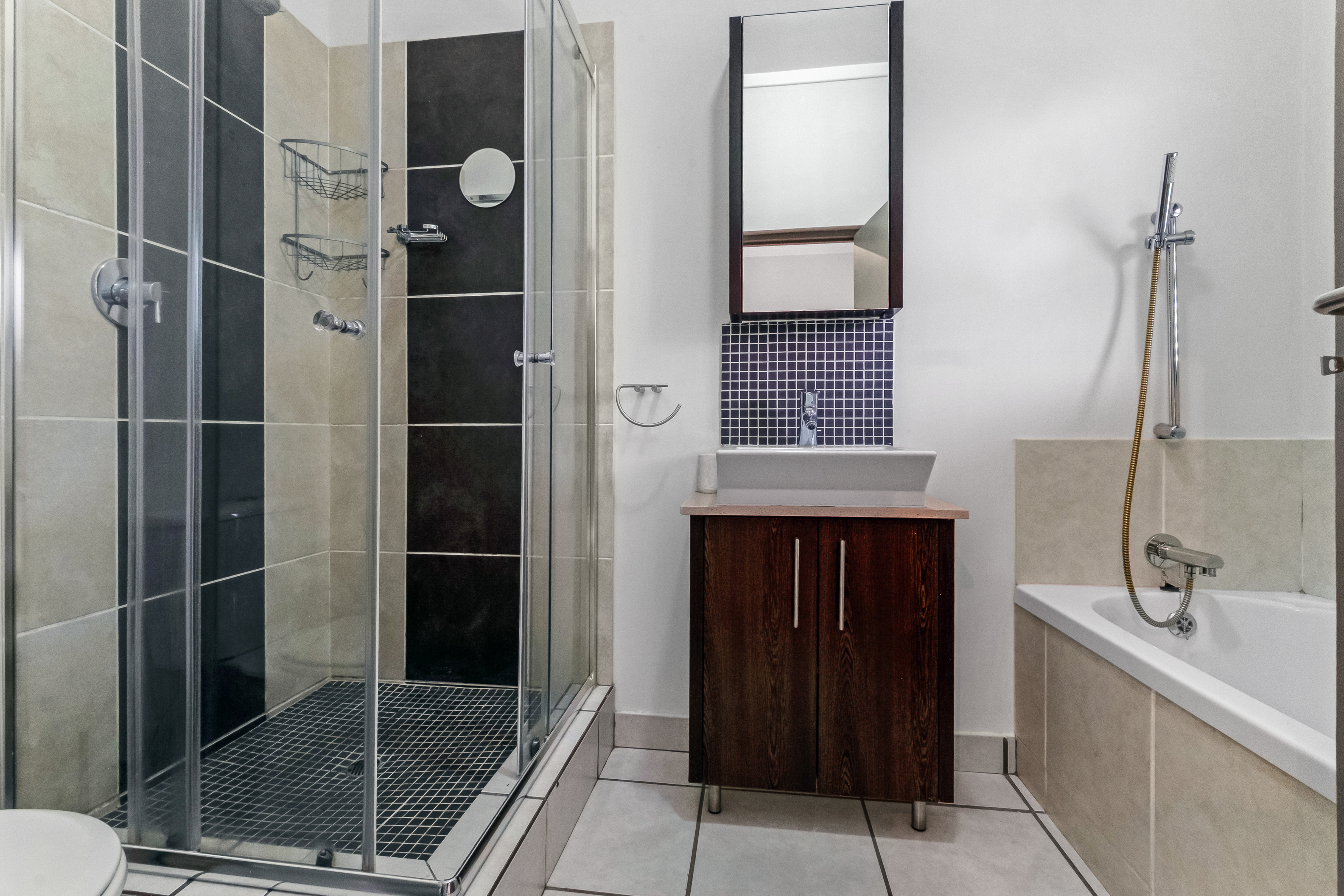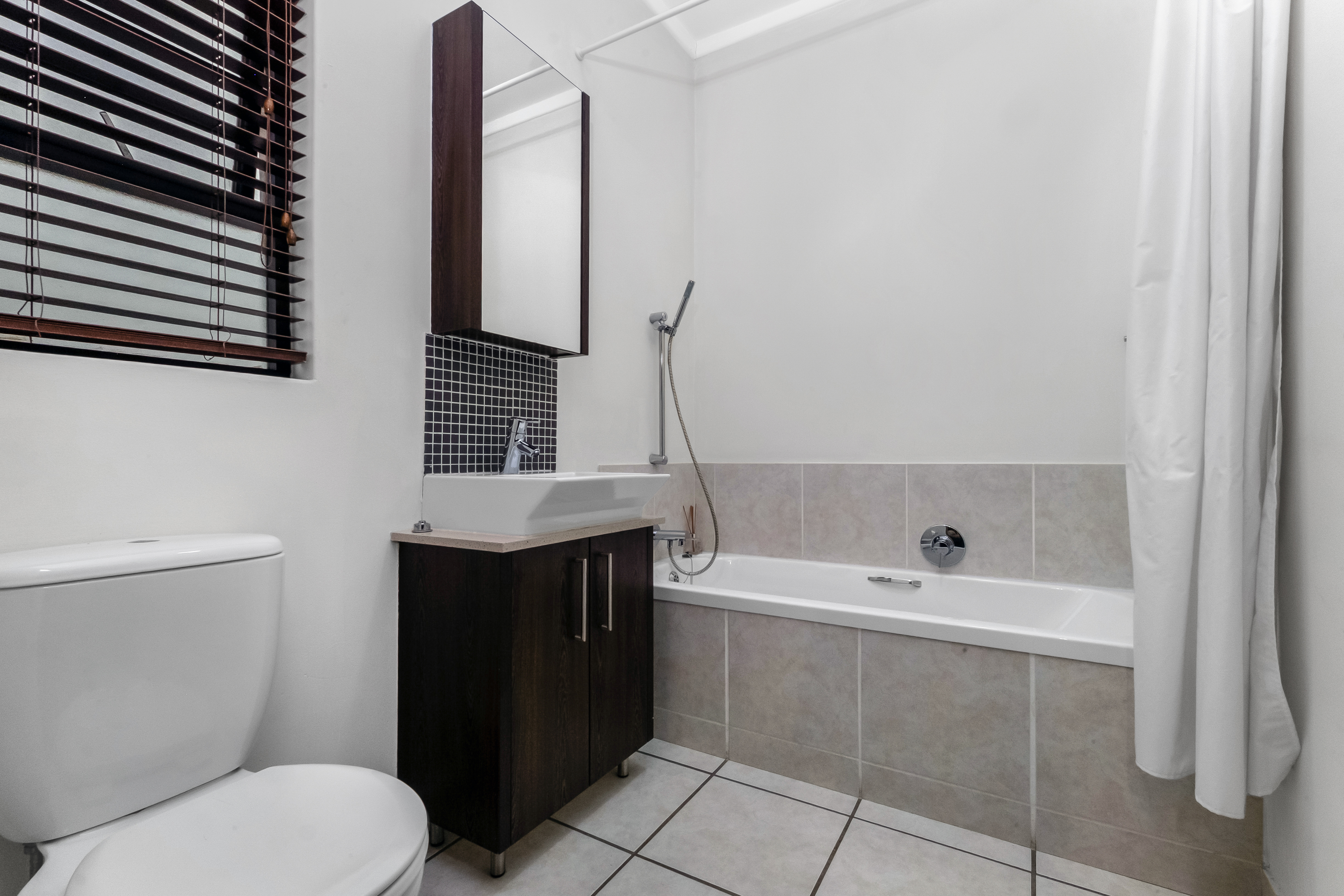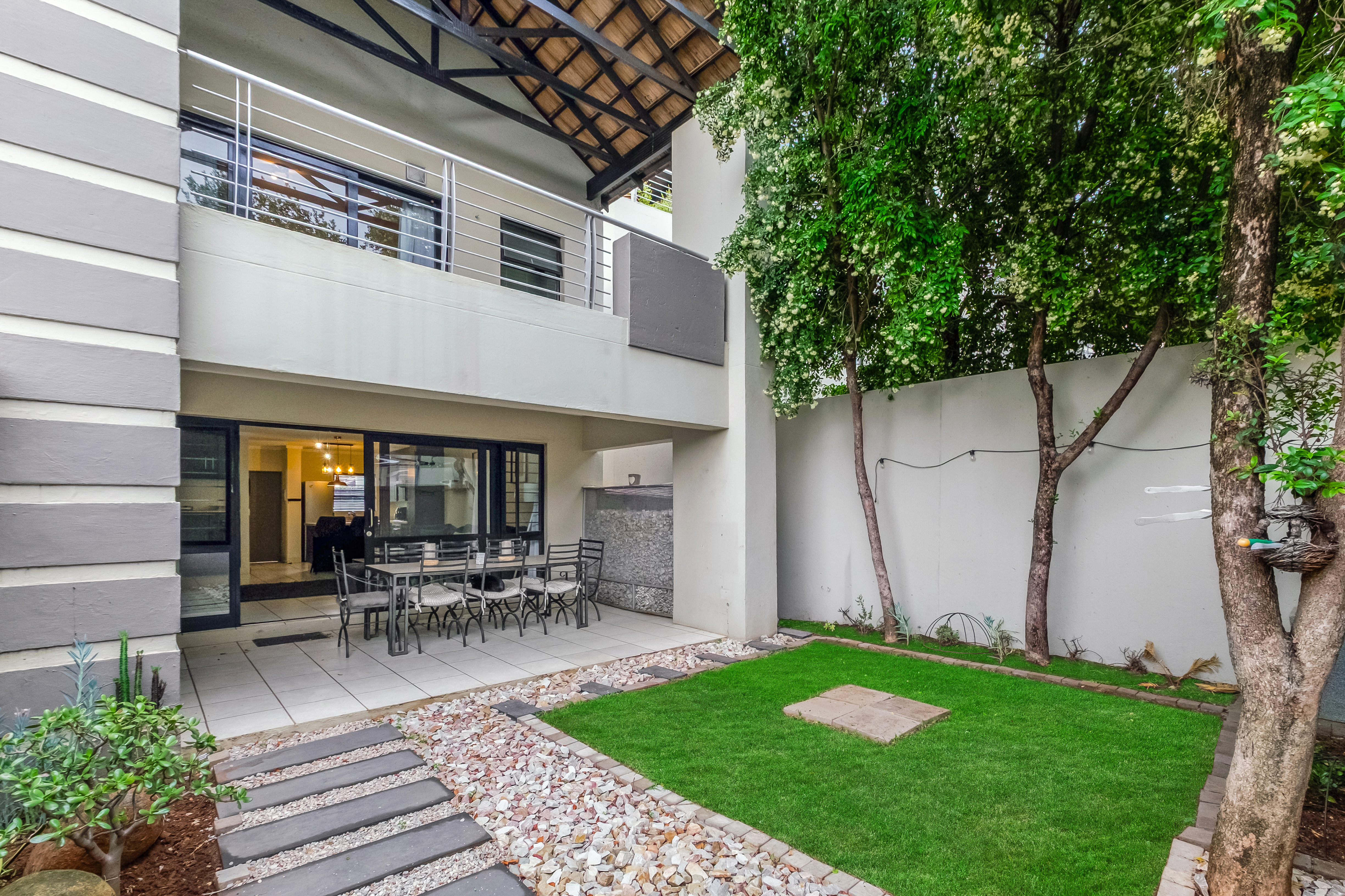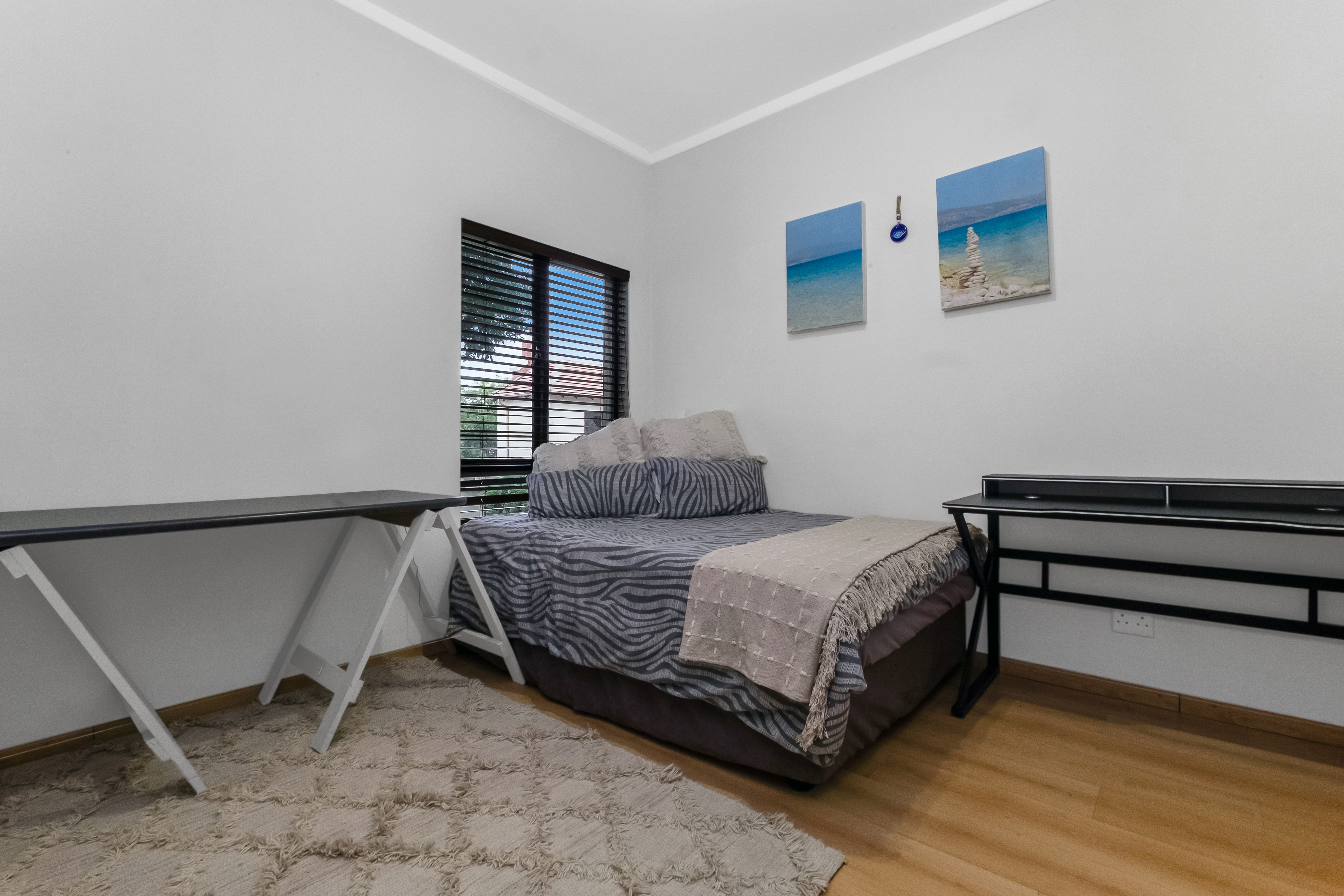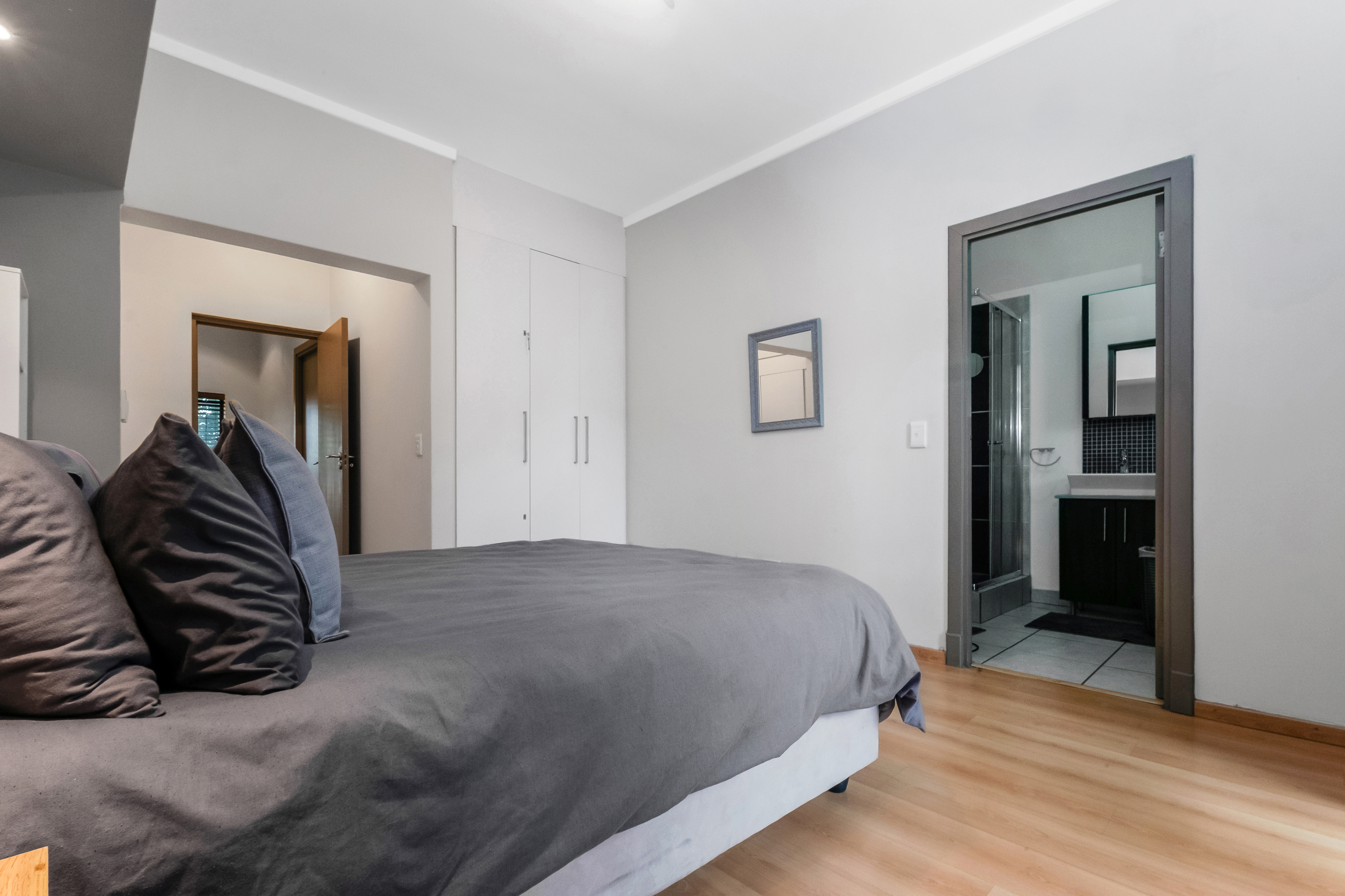 The living and dining area exude comfort and elegance, furnished with plush seating and soft lighting that create a homely yet stylish ambiance. Large glass doors open onto a covered patio overlooking a neat private garden — perfect for evening braais, weekend brunches, or simply unwinding outdoors.