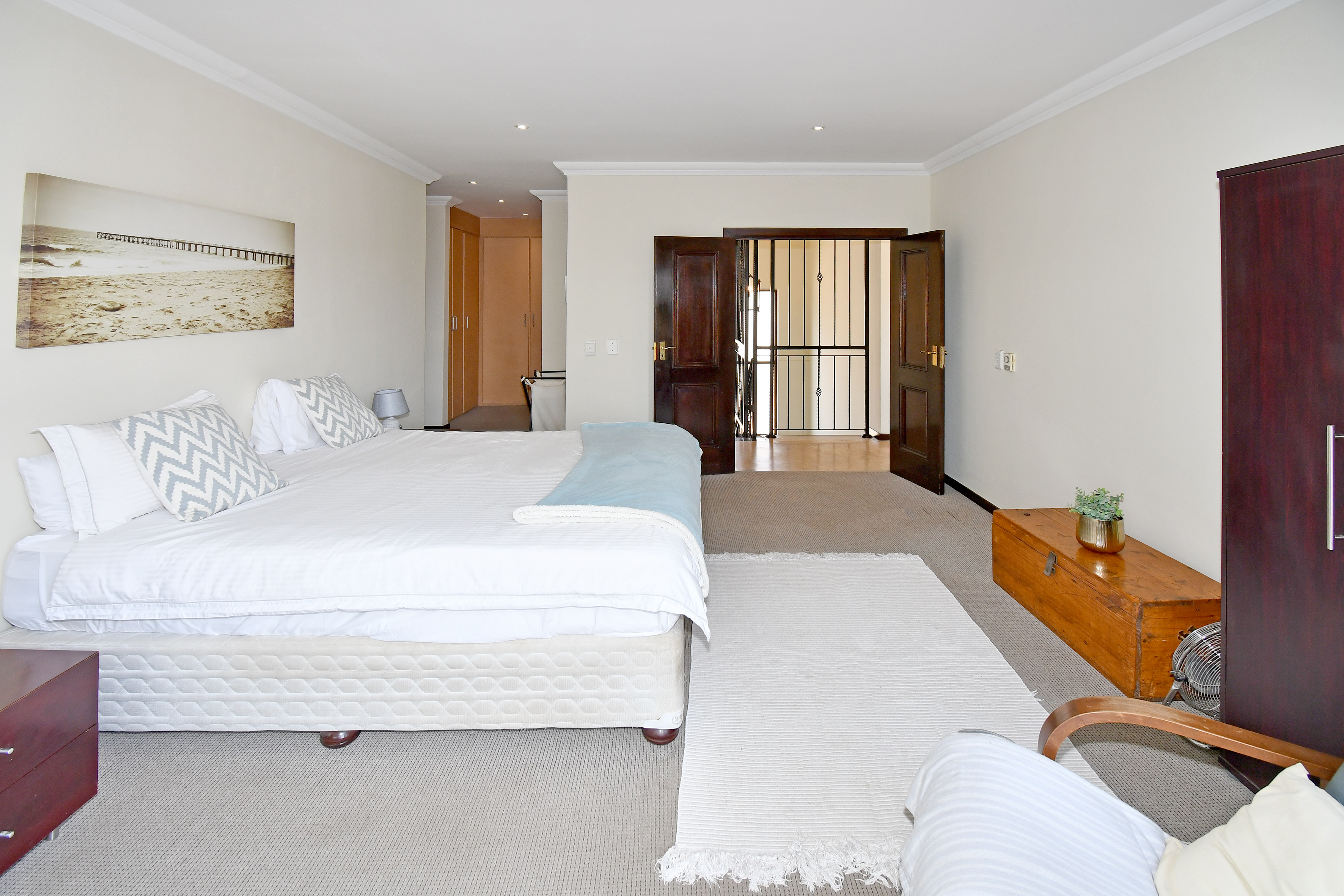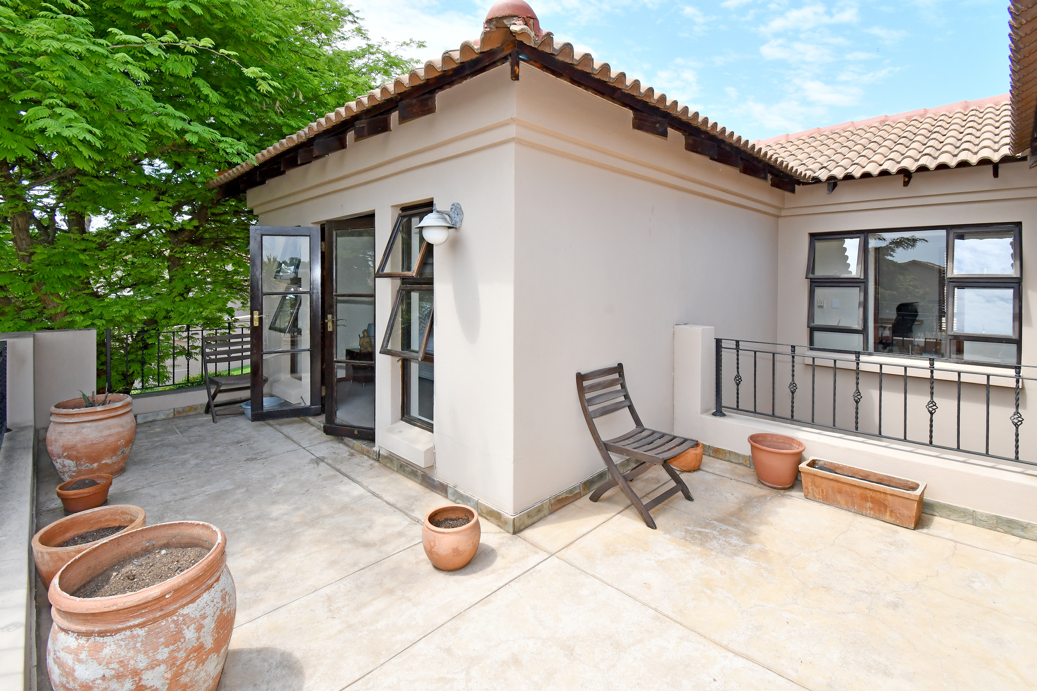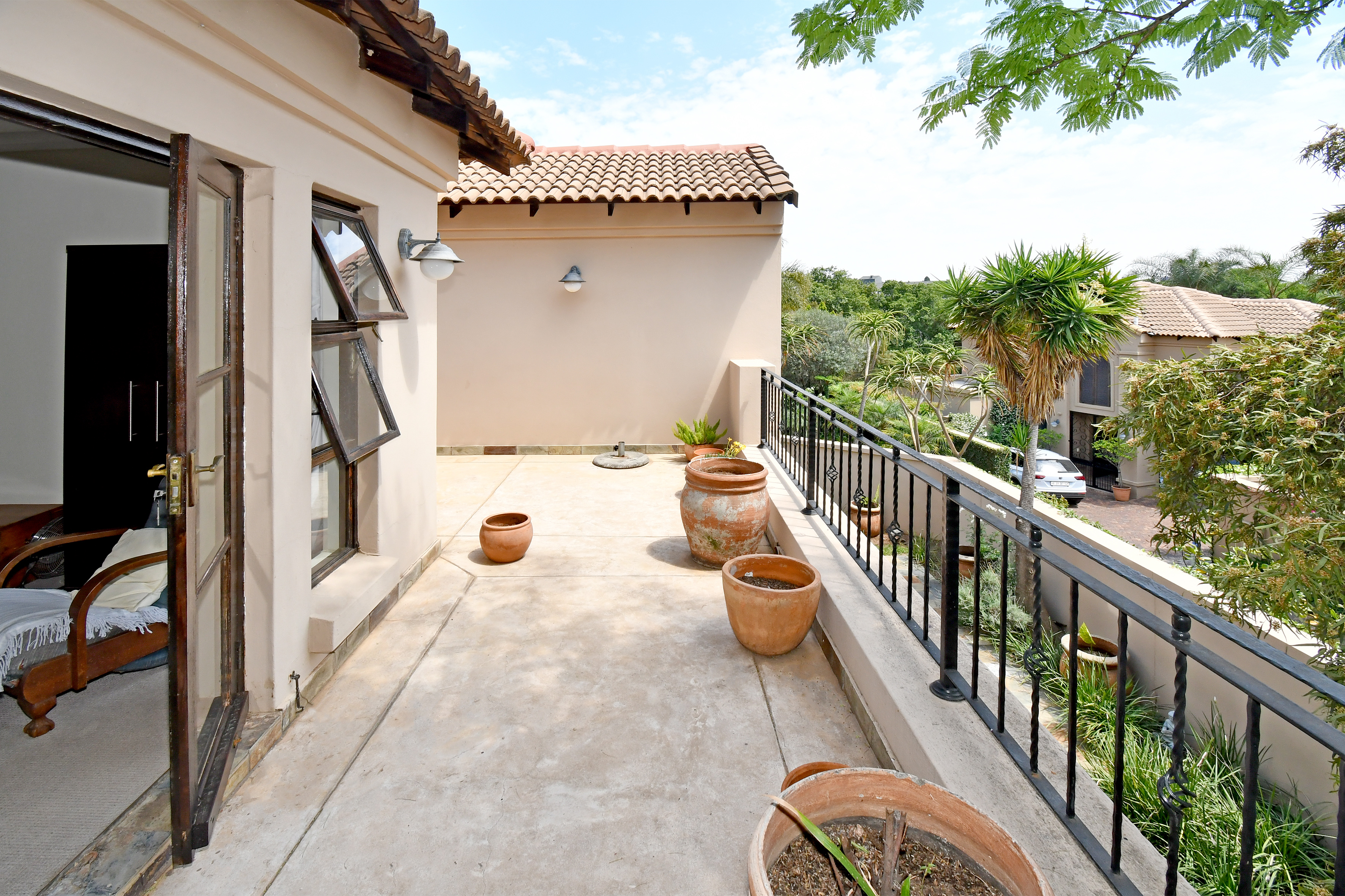 Upstairs, you’ll find four lovely, well-sized bedrooms. The master suite boasts a full en-suite bathroom, while another bedroom has its own shower. The remaining two bedrooms are serviced by a bathroom with a bath. Two of the bedrooms share a balcony, and the third enjoys a private balcony, perfect for relaxing and taking in the views.