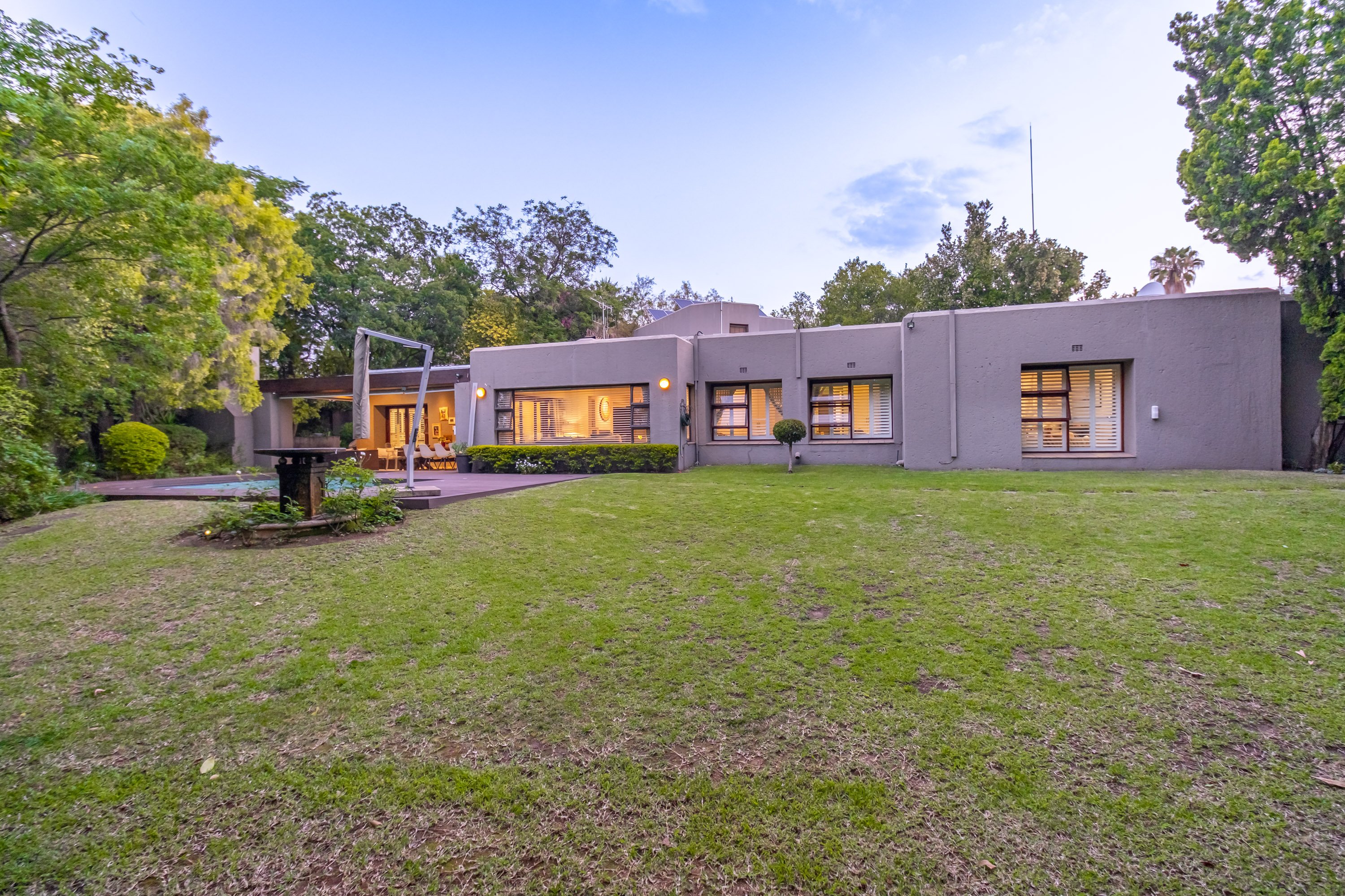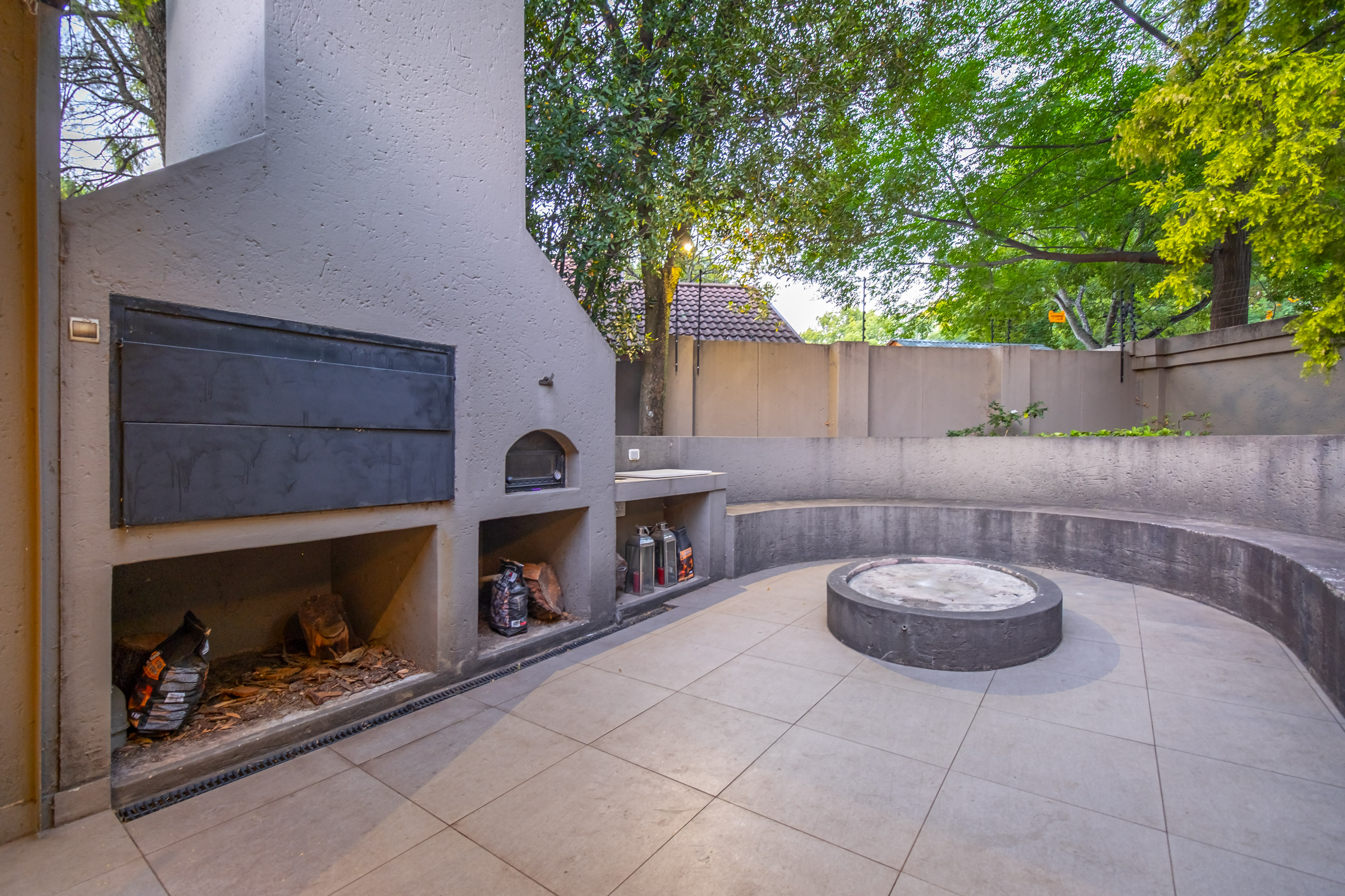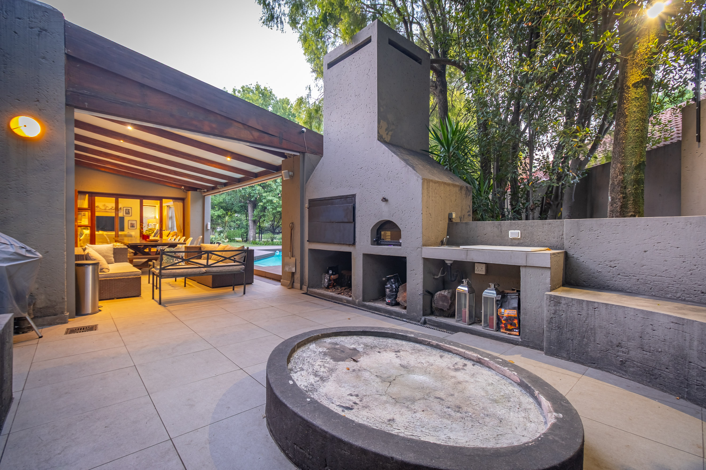 Outdoor living includes a covered patio overlooking the pool, composite decking, firepit, built-in braai, and pizza oven, with a spacious lawn for family enjoyment.