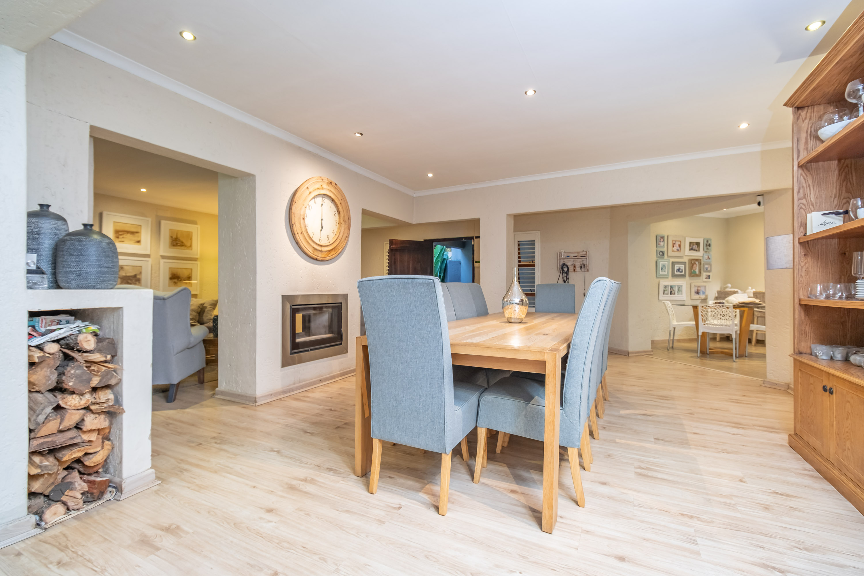 This well-appointed home offers open-plan living areas with a lounge, dining room, and TV room sharing a double-sided fireplace. The modern kitchen includes quality finishes, a pantry, and a separate scullery.