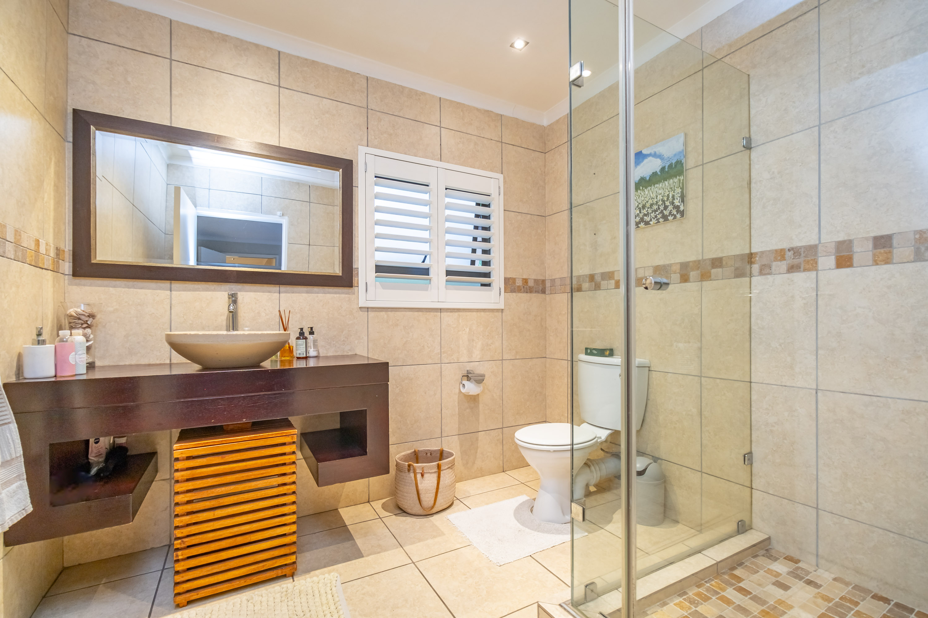 The bedroom wing features three generous bedrooms and two full bathrooms, including a main en-suite. A separate guest suite with its own bathroom adds convenience.