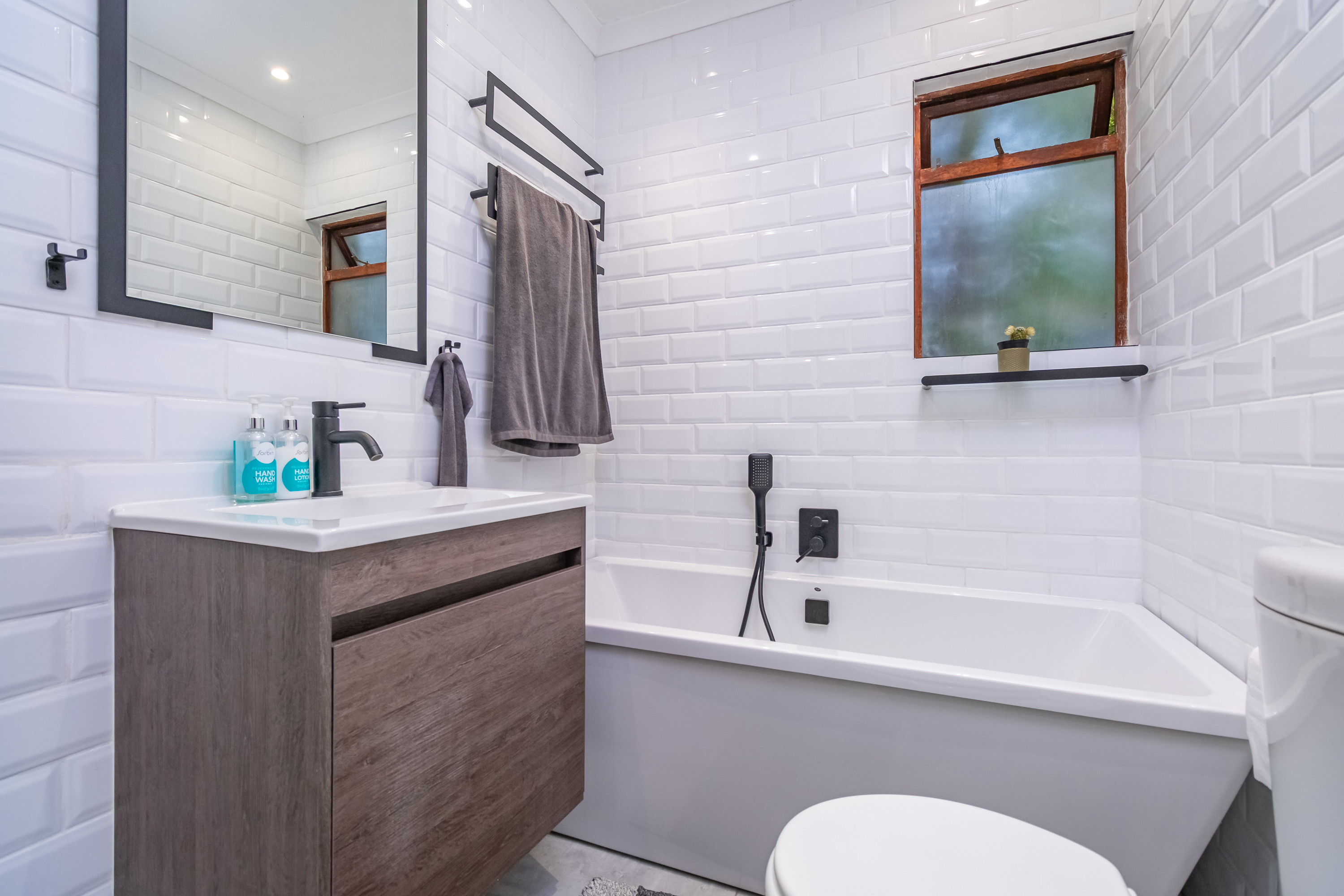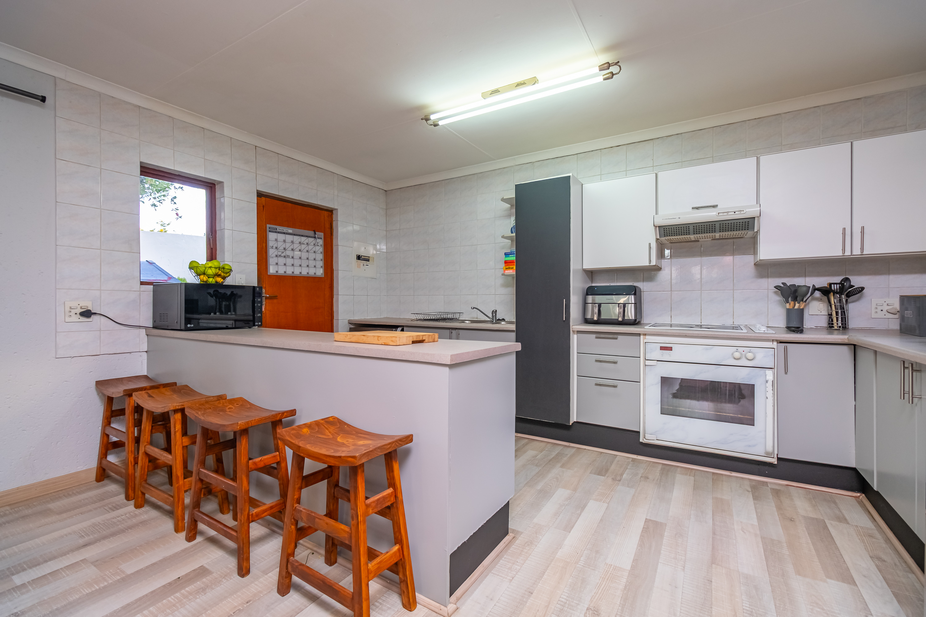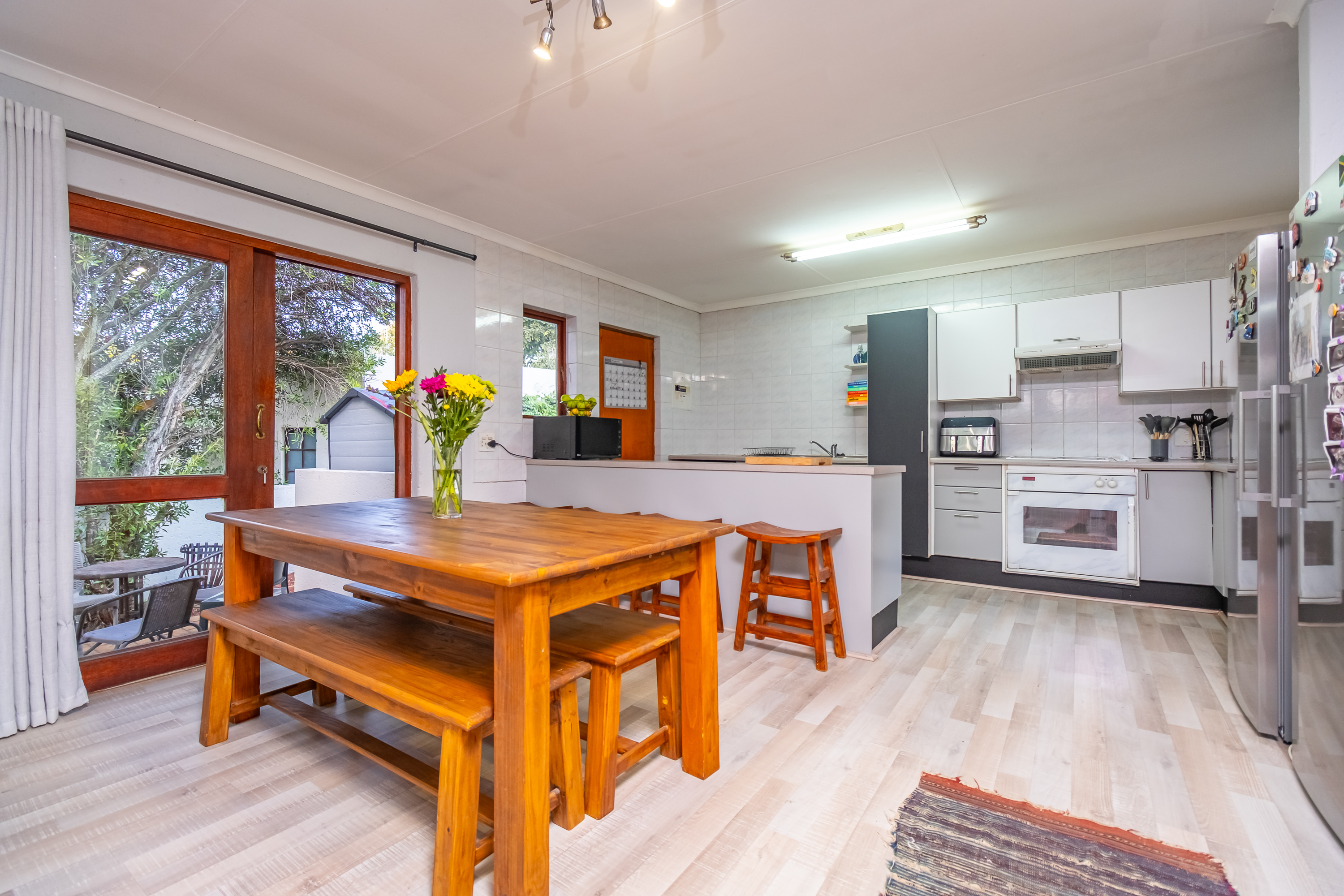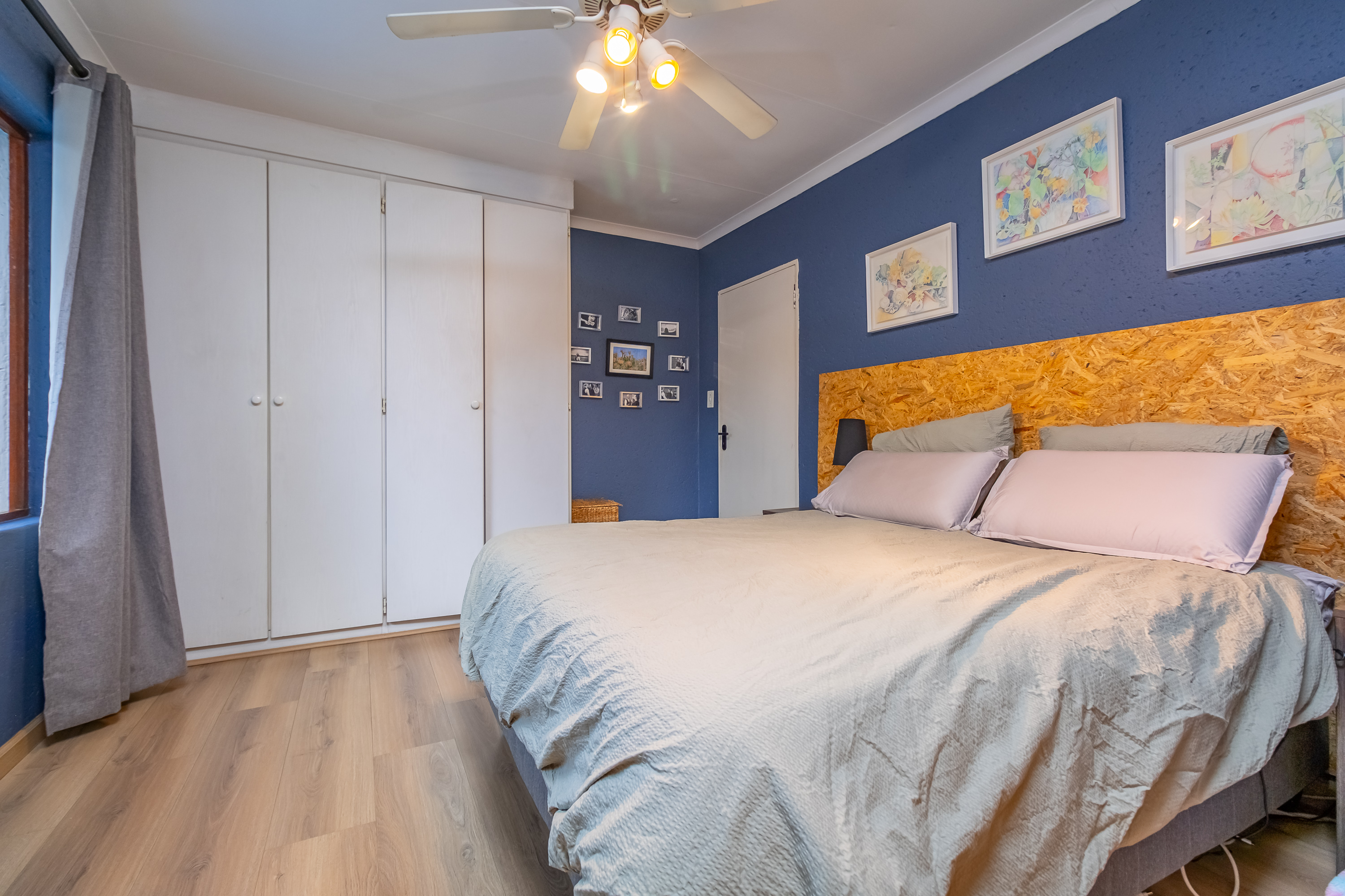 Accommodation includes three bedrooms with built-in cupboards and two brand-new, modern bathrooms, with the main bedroom featuring a full en-suite. Stylish laminate flooring runs throughout the home.