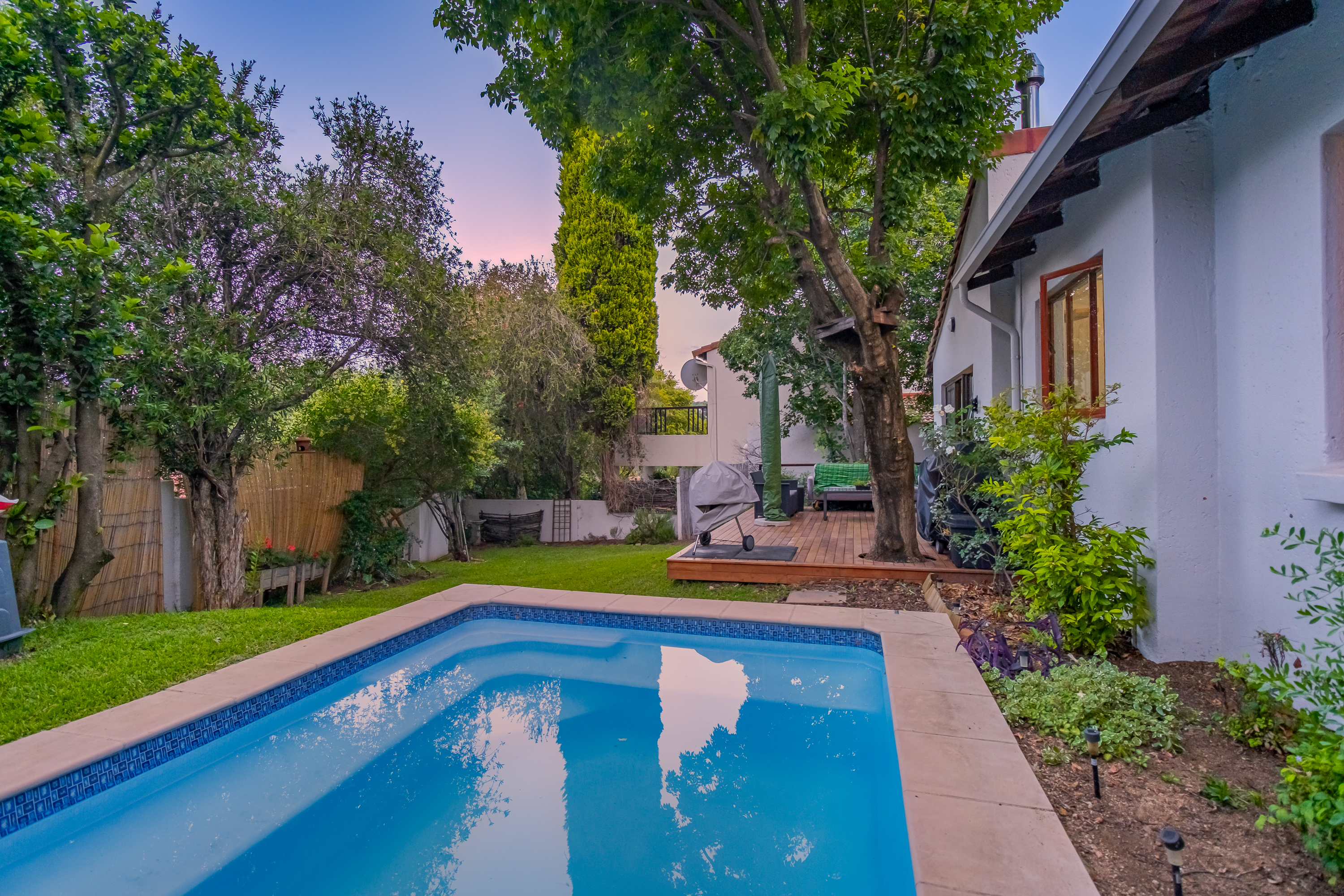 The kitchen, ready for renovation, flows seamlessly into the dining area and lounge with fireplace. Living room opens onto a wooden deck overlooking a lush green garden and sparkling pool — perfect for relaxed living and entertaining.