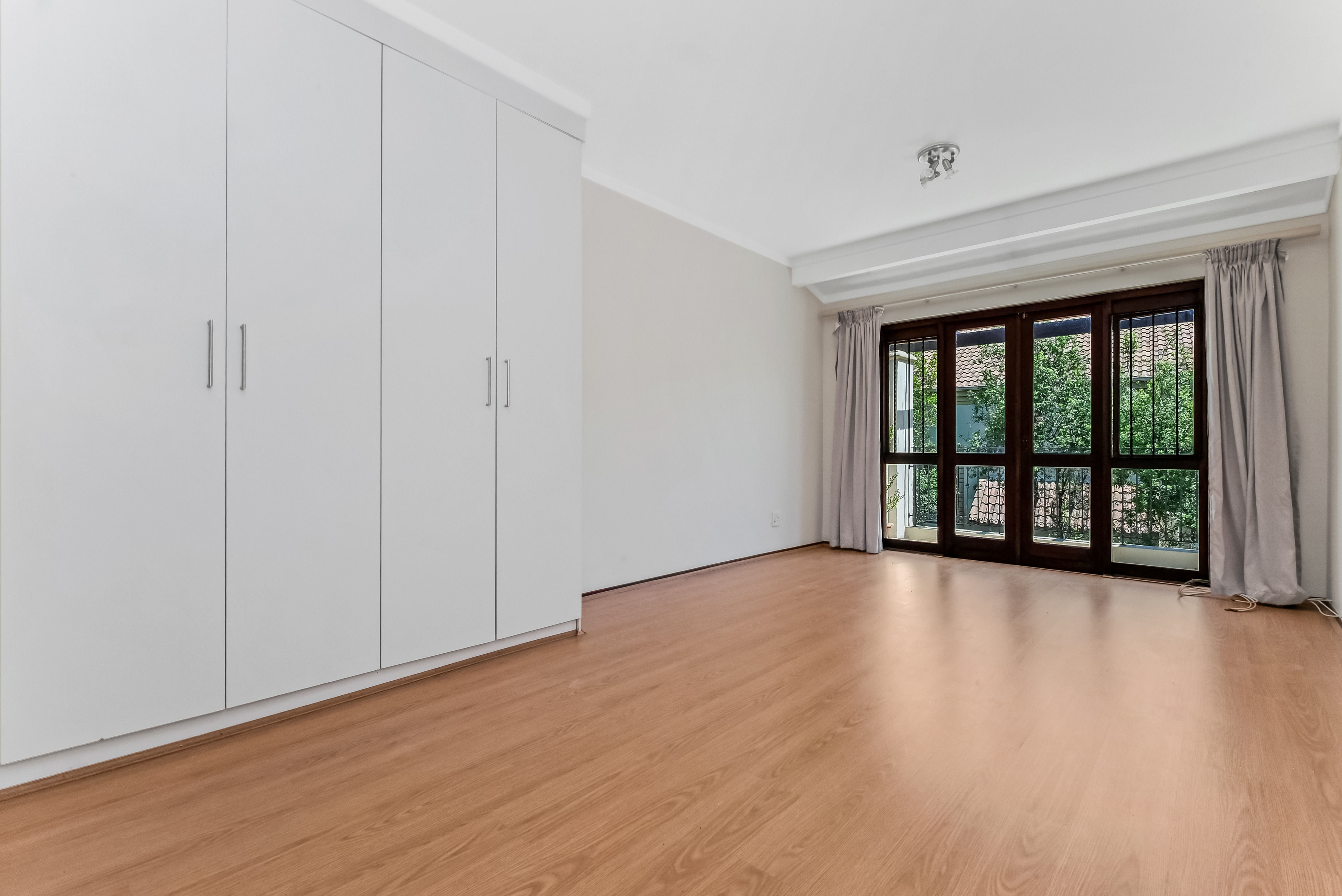 Upstairs, two well-proportioned bedrooms provide peaceful, private accommodation. Both bedrooms feature laminate flooring and built-in cupboards, each complemented by its own en-suite bathroom. The main suite is particularly appealing, with aluminium French doors opening onto a balcony overlooking the garden—an ideal spot for morning light or evening calm. A linen cupboard on the landing adds practical storage without compromising space.