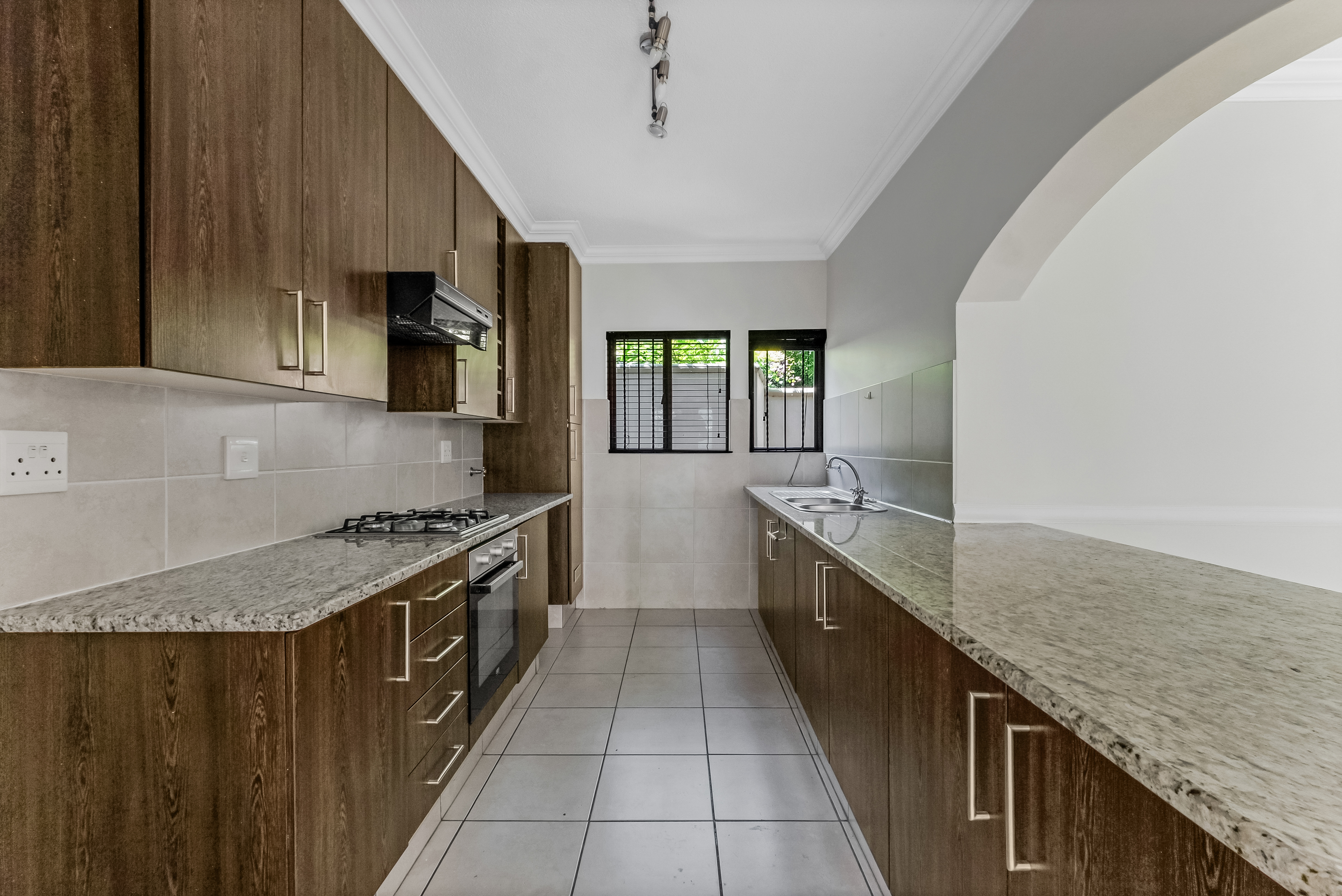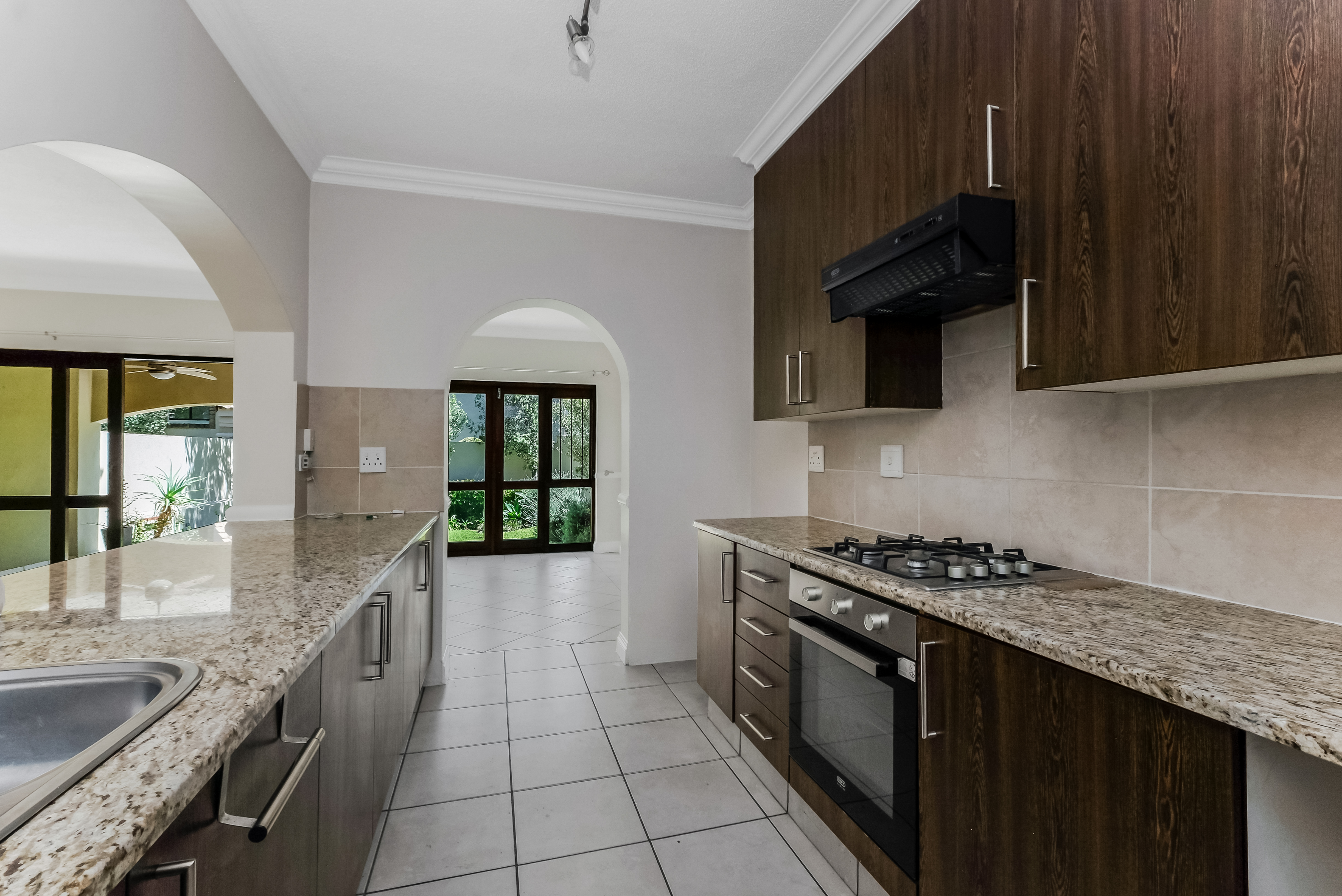 The kitchen is thoughtfully positioned to remain connected to the living space while still feeling defined. Granite countertops, generous cabinetry, a gas hob with electric oven and accommodation for two under-counter appliances make it both functional and inviting. The arched pass-through enhances the home’s architectural charm while keeping the space social and open.