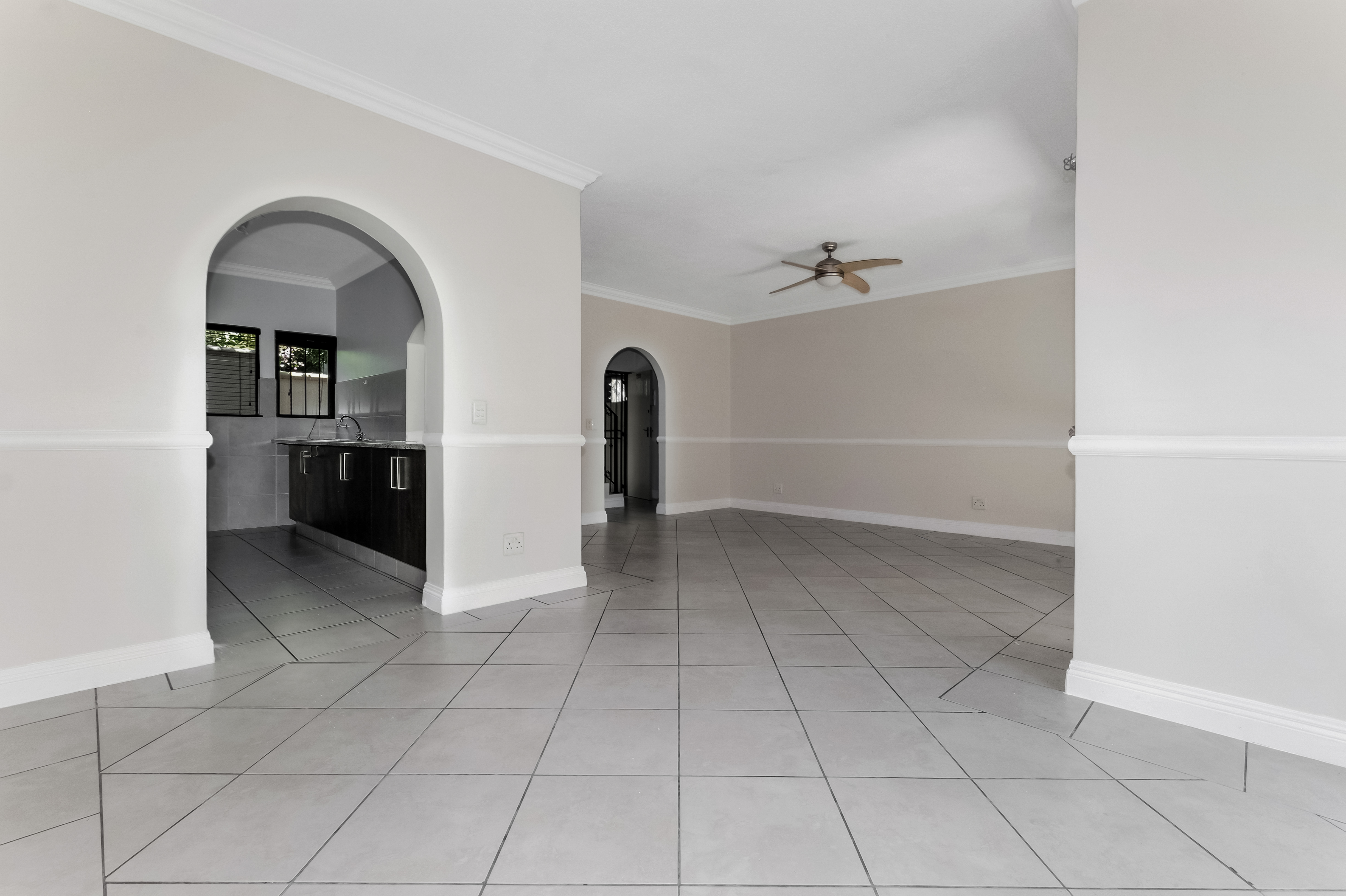 The home opens into a beautifully balanced living space where soft neutral tones, tiled floors and classic archways create a sense of understated refinement. The living and dining areas flow naturally toward the garden, anchored by full-height wooden-framed doors that draw the outdoors in and flood the home with light. Whether entertaining or enjoying quiet evenings at home, the layout works seamlessly.