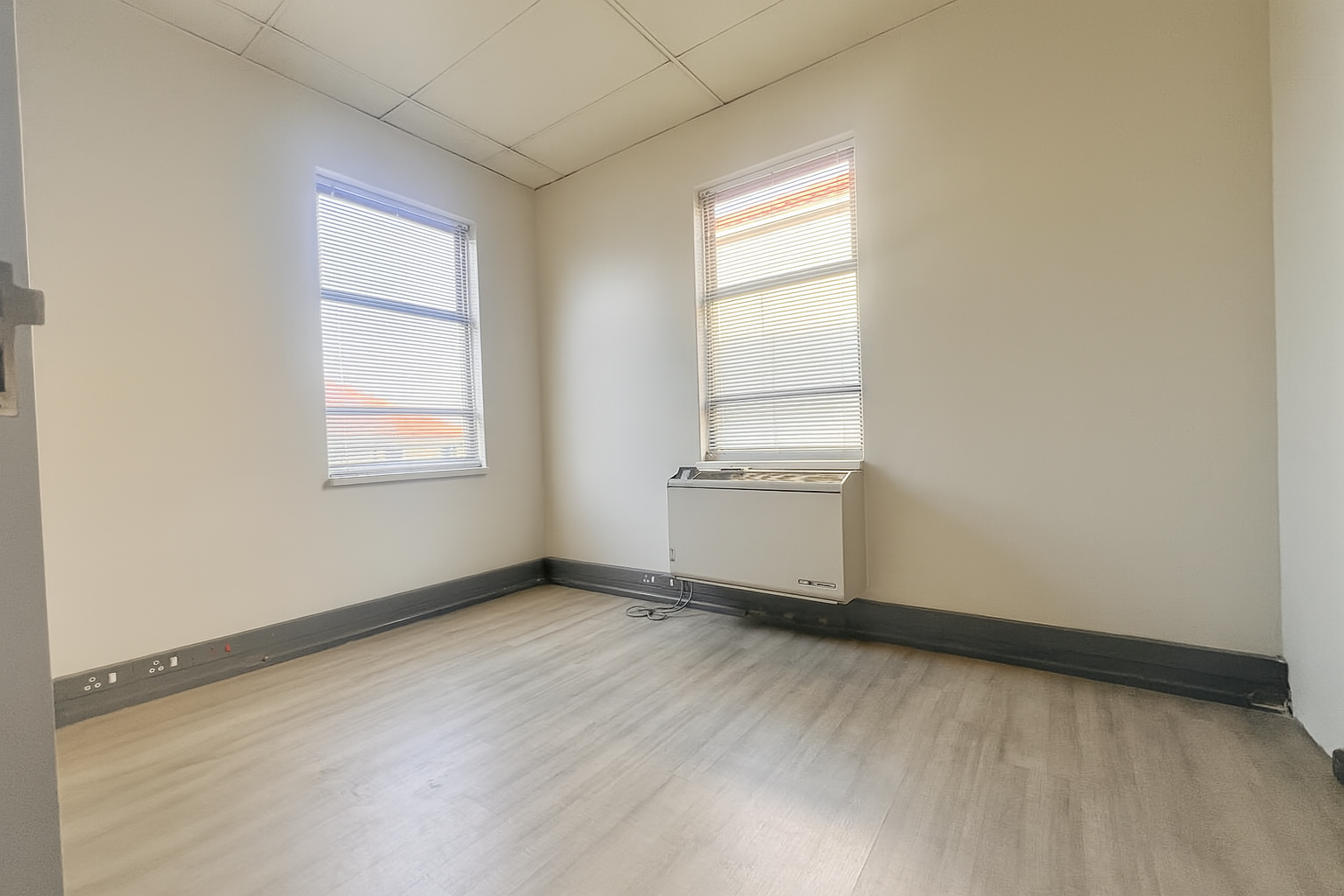 The interiors feature a mix of carpeted areas for improved acoustics and laminated flooring for a sleek, professional finish. The open-plan layout can easily be reconfigured to suit your business needs, offering a space that’s both functional and adaptable.