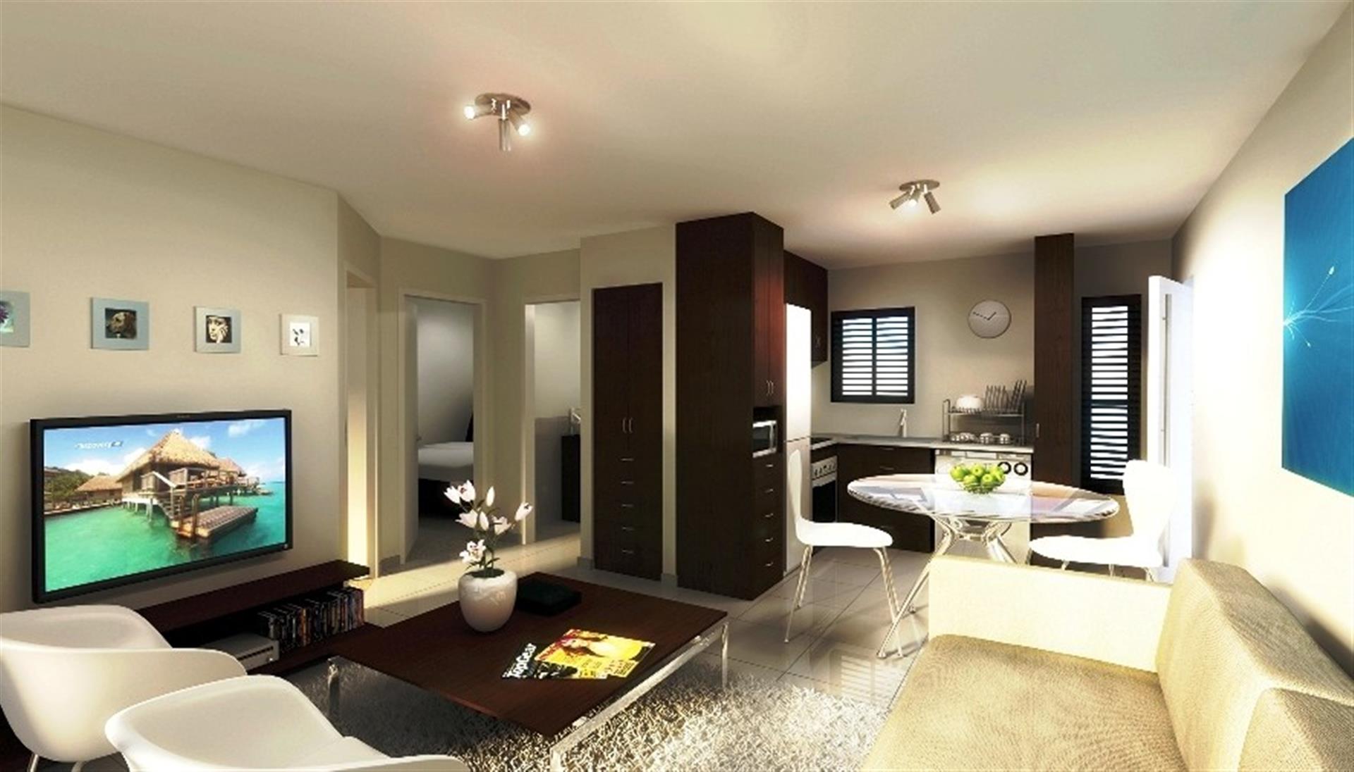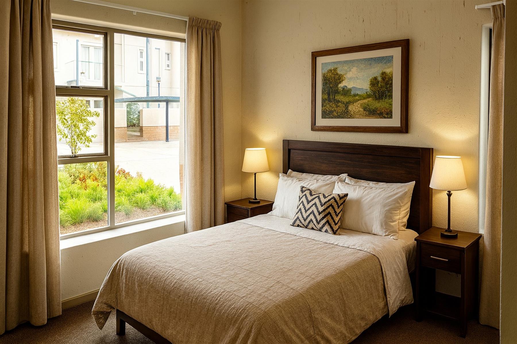 Both bedrooms are generously sized, showcasing elegant wooden floors and abundant natural light. The full bathroom offers a modern shower-over-bath design with matching wooden finishes for a cohesive touch. Additional highlights include pre-paid electricity, a covered carport, ample visitor parking, and access to a sparkling communal pool — all within a 24-hour secure complex.