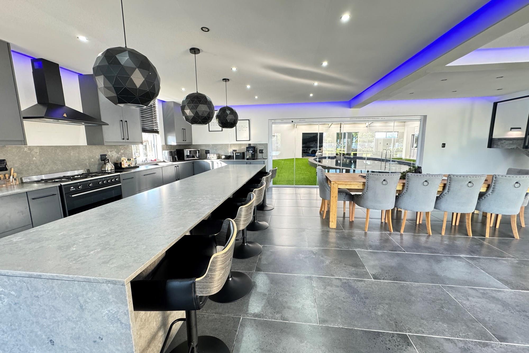 This house is designed for entertaining with a large swimming pool with heated fireplace. This area has a large bar and an enormous area to entertain. A BBQ area with a Pizza oven completes this large space.Modern Aesthetic: The home features a sleek modern design complemented by colored LED lighting, creating a vibrant contemporary atmosphere.Quality Sanware: High-quality sanitary ware is featured in all bathrooms and the kitchen, ensuring functionality and style.Spacious Main Area: Includes a large open-plan lounge, dining room, kitchen, and undercover pool area that can comfortably entertain up to 100 guests.Ultra-Modern Kitchen: The kitchen boasts top-tier finishes and Built-in Cupboards (BIC), along with a separate scullery and laundry area overlooking the lawns and play area.Two Staircases: Conveniently located on the north and west sides of the house, providing easy access to all areas.High-Quality Finishes: Premium materials and finishes are used throughout the home, enhancing its luxurious appeal.