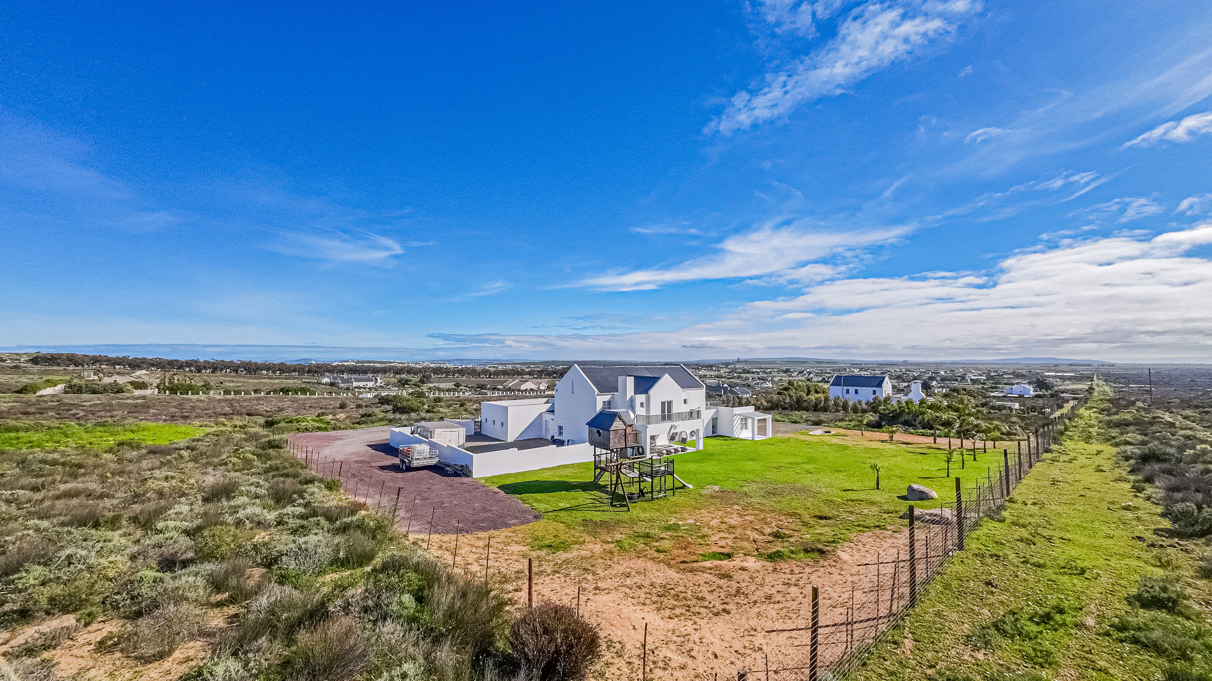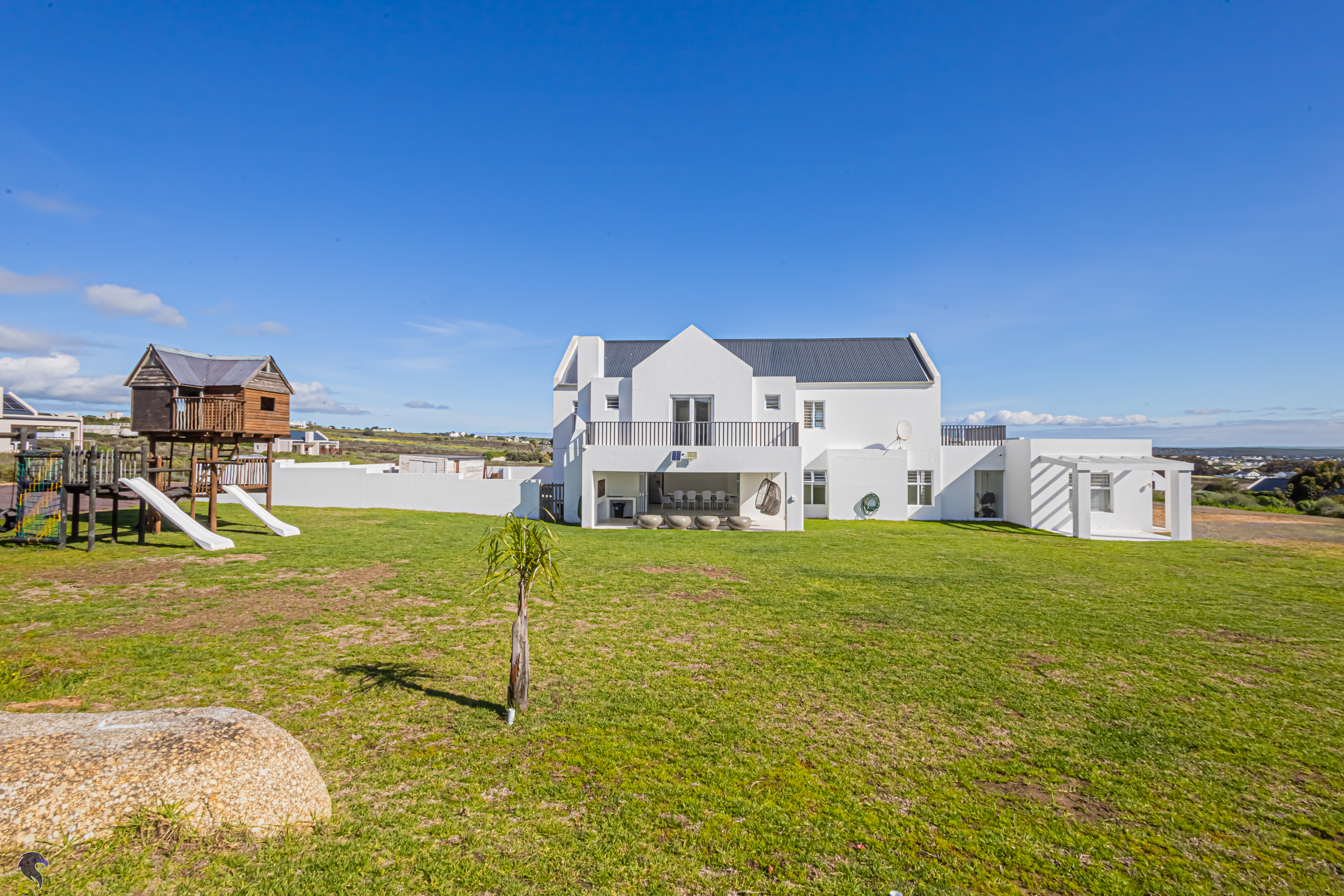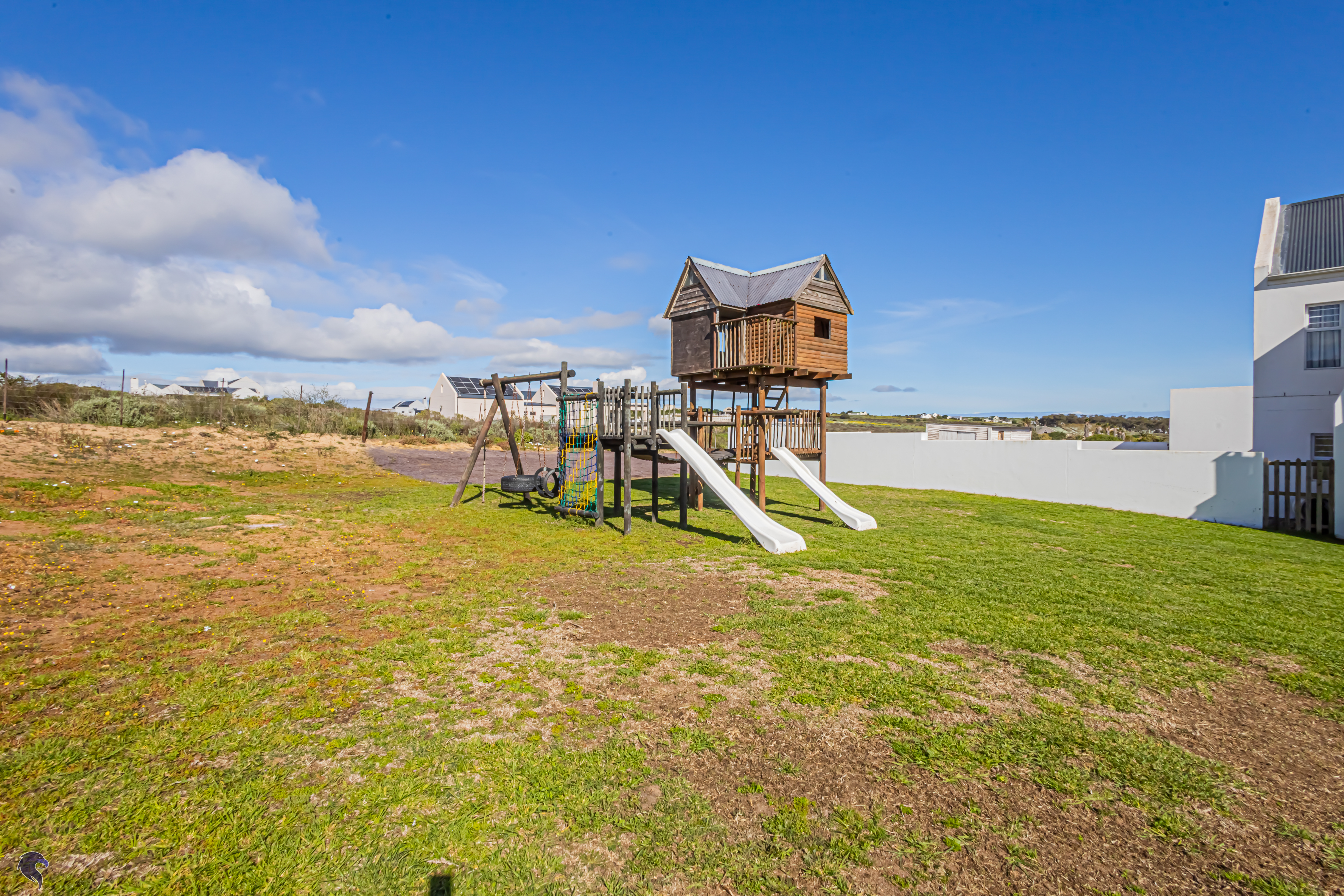 Outside, the fully fenced backyard is a little haven for children, complete with a jungle gym and space to run. The covered stoep with a built-in braai is just waiting for weekend get-togethers.