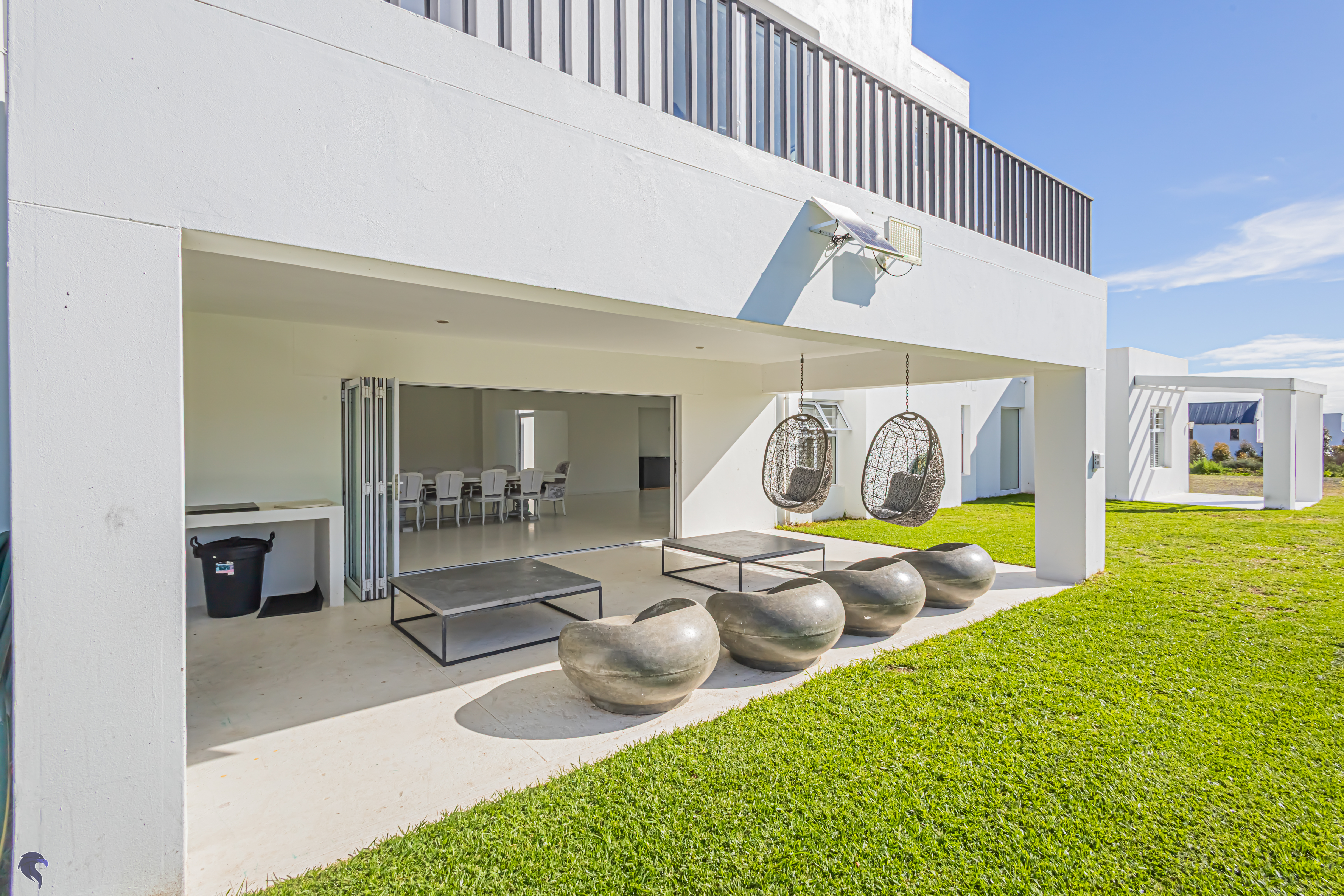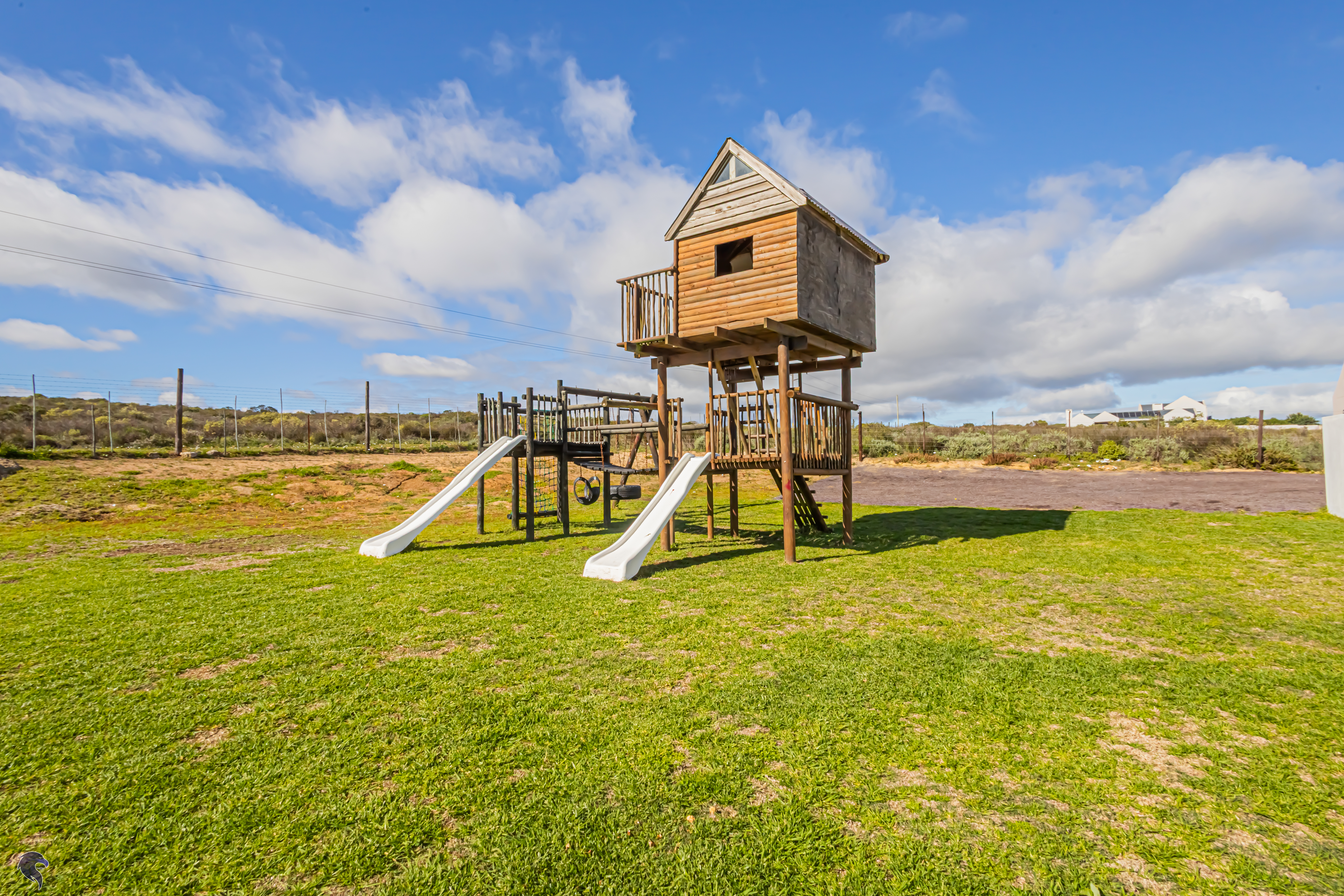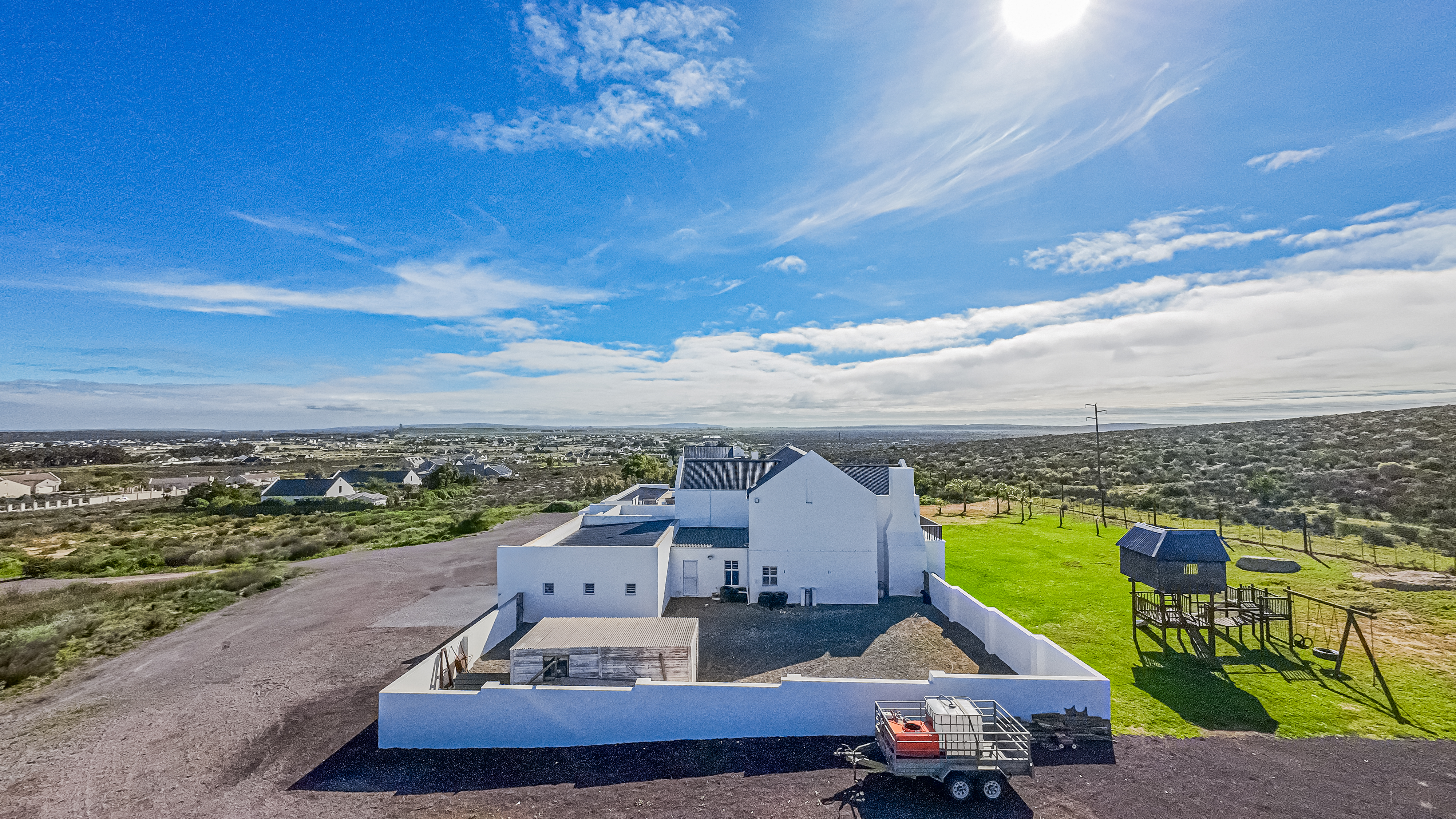 Outside, the fully fenced backyard is a little haven for children, complete with a jungle gym and space to run. The covered stoep with a built-in braai is just waiting for weekend get-togethers.