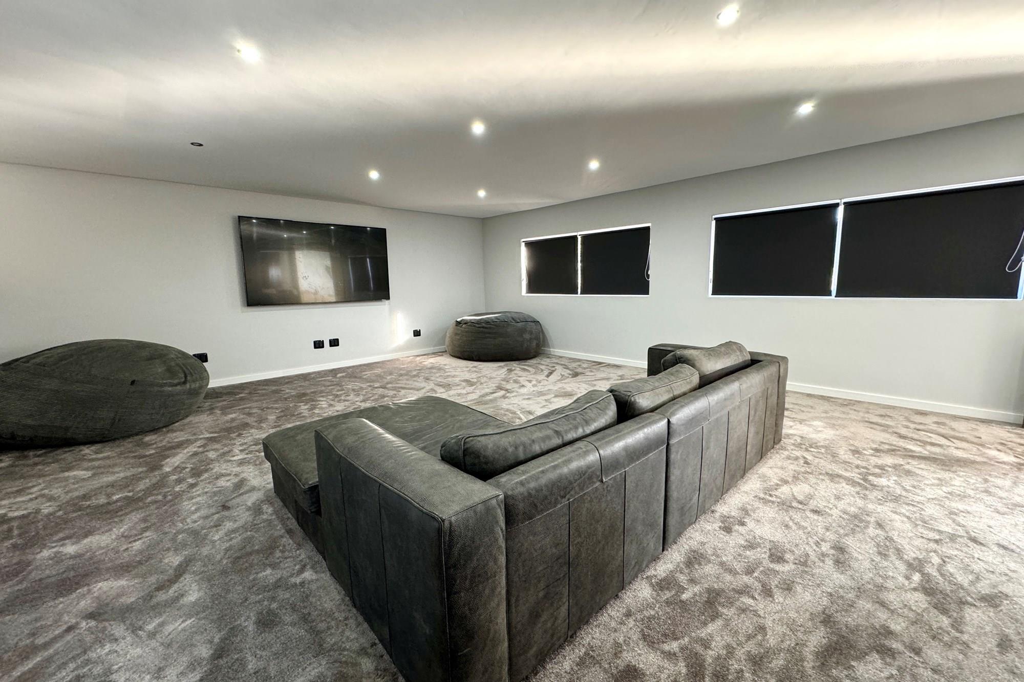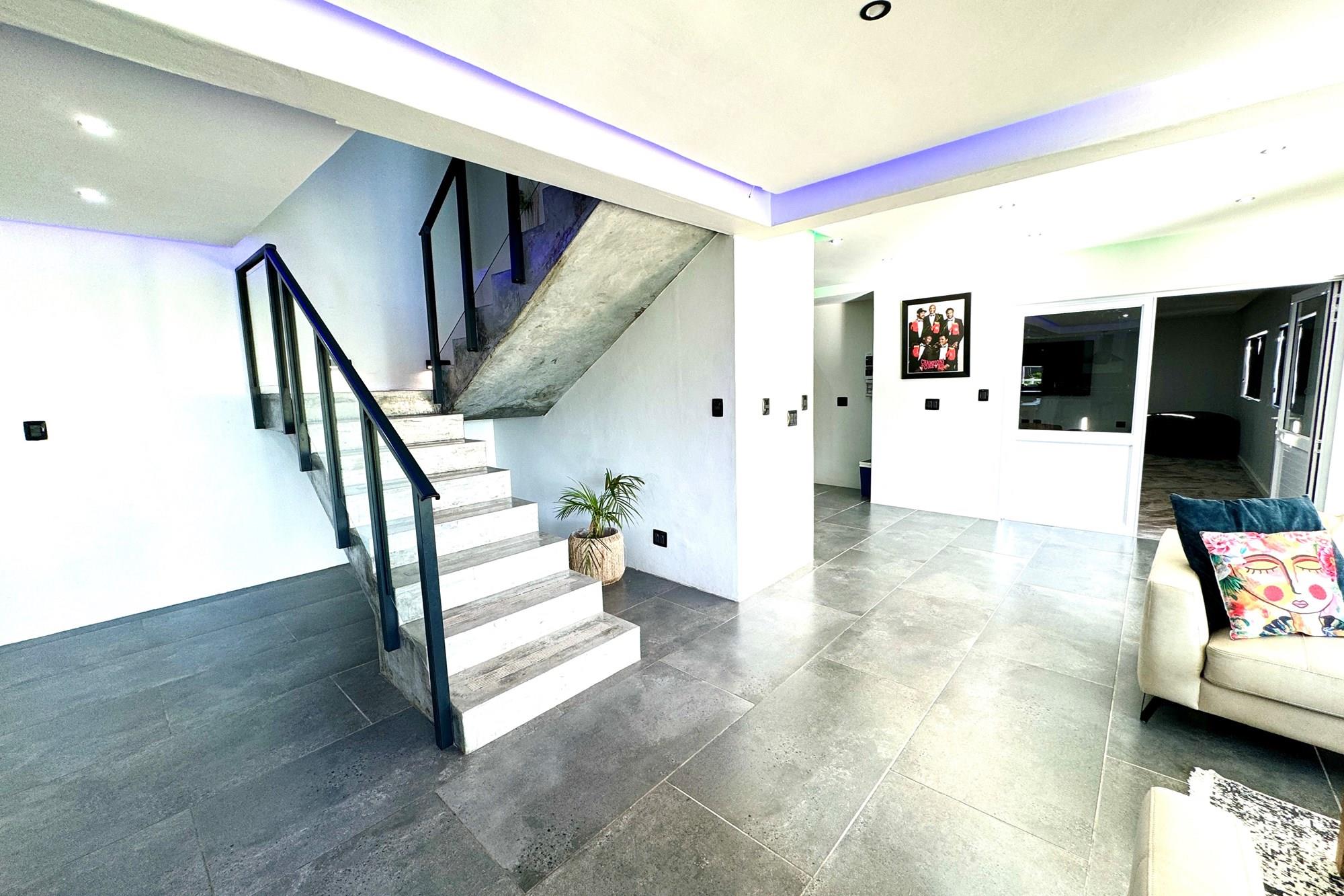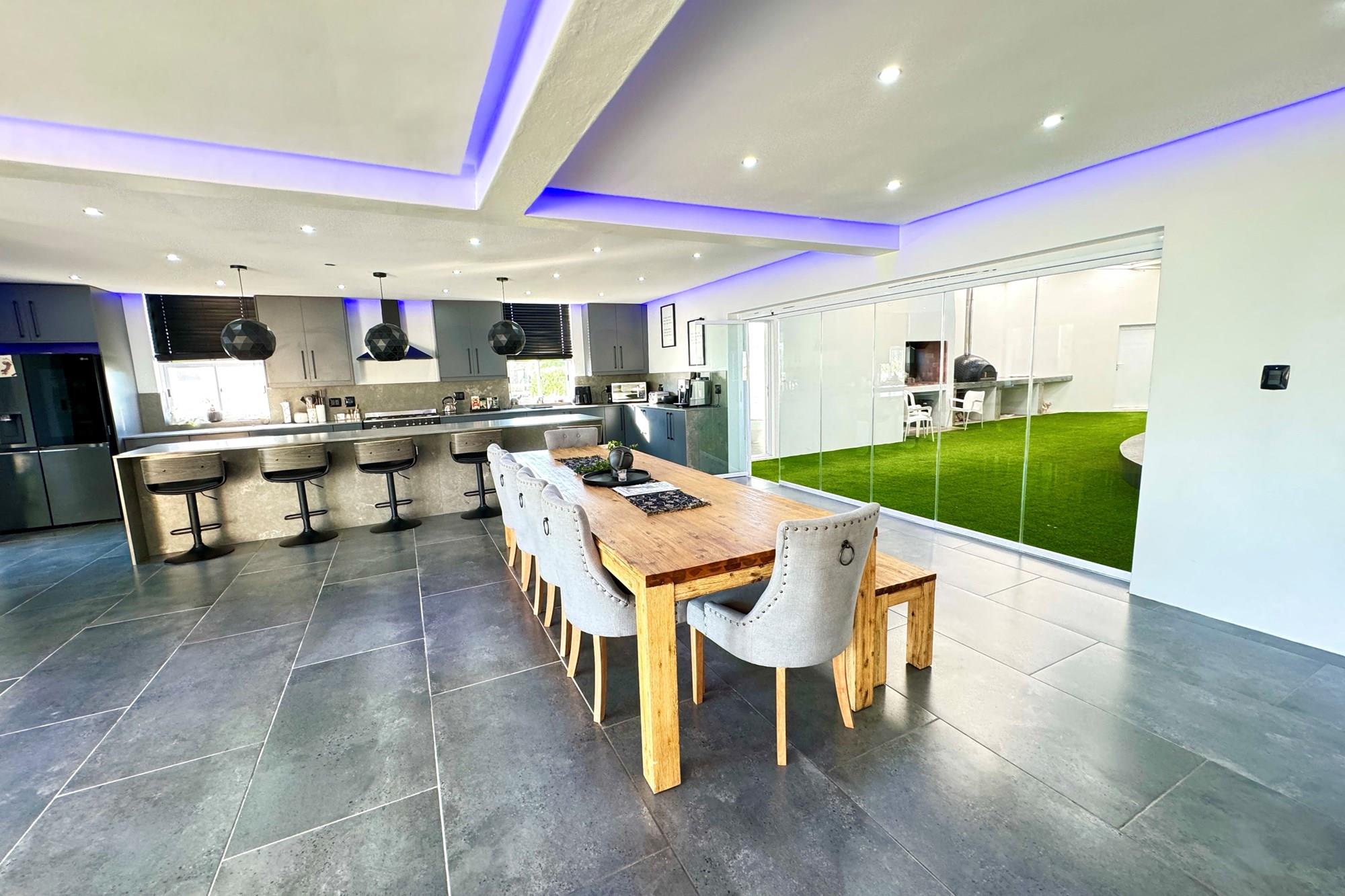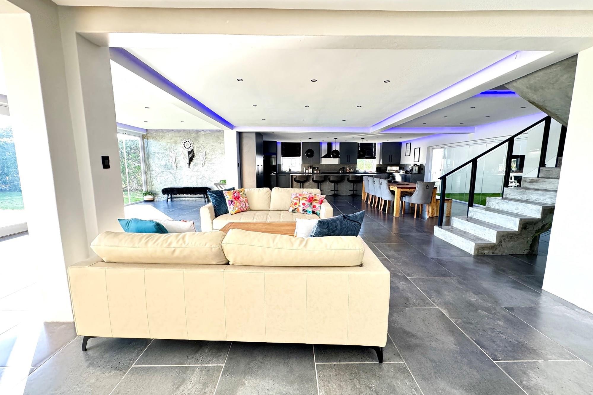 This house is designed for entertaining with a large swimming pool with heated fireplace. This area has a large bar and an enormous area to entertain. A BBQ area with a Pizza oven completes this large space.Modern Aesthetic: The home features a sleek modern design complemented by colored LED lighting, creating a vibrant contemporary atmosphere.Quality Sanware: High-quality sanitary ware is featured in all bathrooms and the kitchen, ensuring functionality and style.Spacious Main Area: Includes a large open-plan lounge, dining room, kitchen, and undercover pool area that can comfortably entertain up to 100 guests.Ultra-Modern Kitchen: The kitchen boasts top-tier finishes and Built-in Cupboards (BIC), along with a separate scullery and laundry area overlooking the lawns and play area.Two Staircases: Conveniently located on the north and west sides of the house, providing easy access to all areas.High-Quality Finishes: Premium materials and finishes are used throughout the home, enhancing its luxurious appeal.