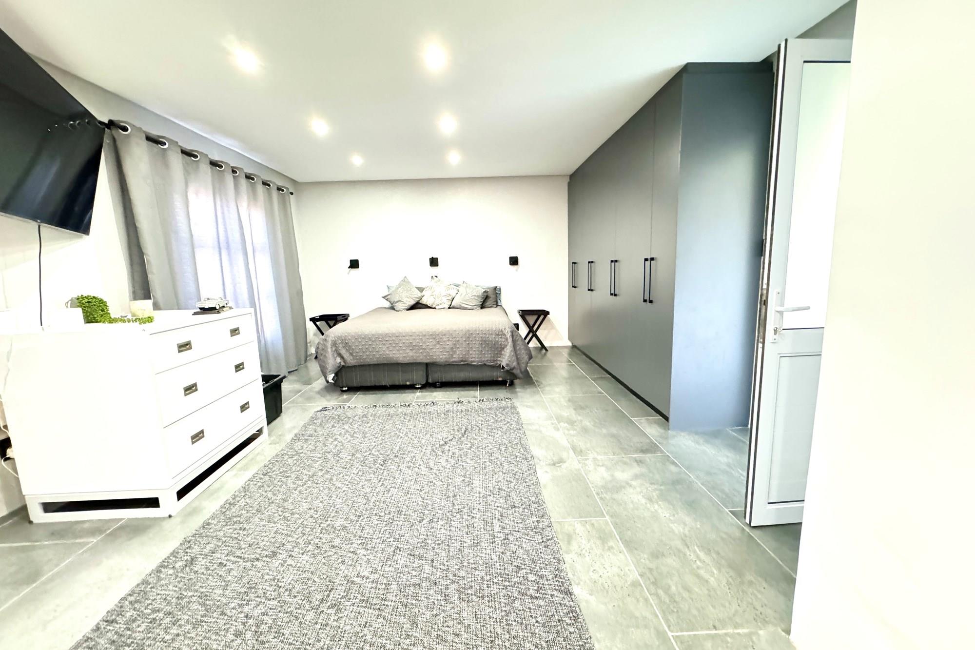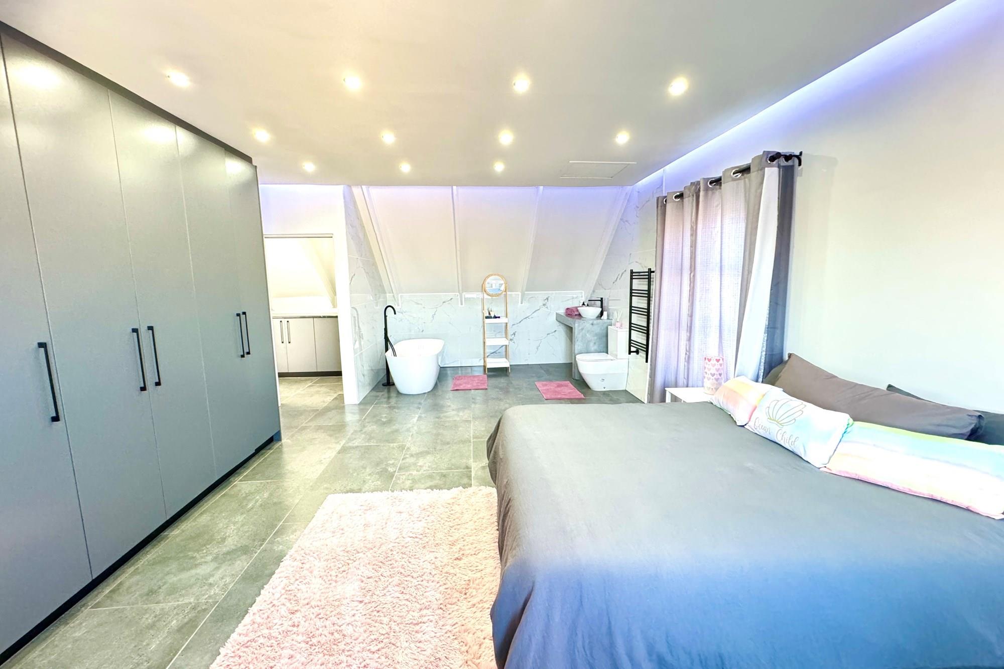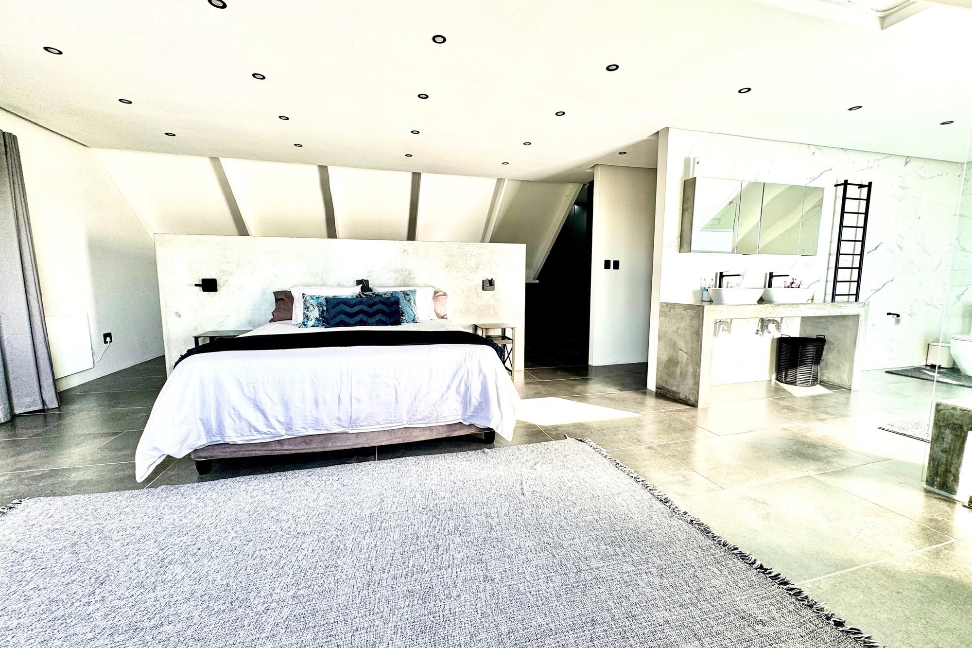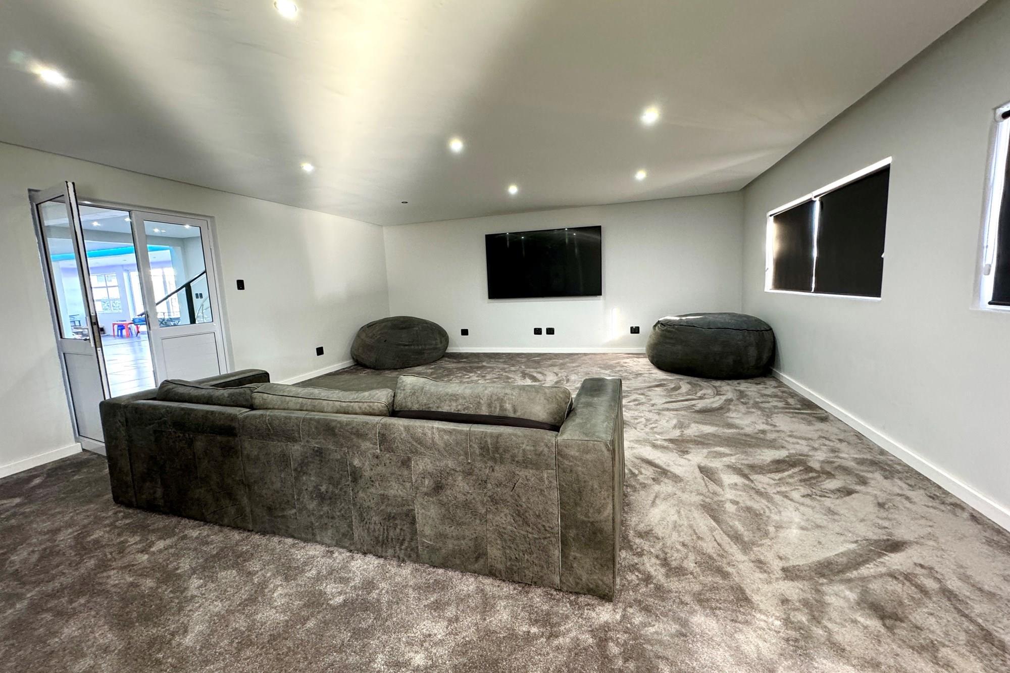 This house is designed for entertaining with a large swimming pool with heated fireplace. This area has a large bar and an enormous area to entertain. A BBQ area with a Pizza oven completes this large space.Modern Aesthetic: The home features a sleek modern design complemented by colored LED lighting, creating a vibrant contemporary atmosphere.Quality Sanware: High-quality sanitary ware is featured in all bathrooms and the kitchen, ensuring functionality and style.Spacious Main Area: Includes a large open-plan lounge, dining room, kitchen, and undercover pool area that can comfortably entertain up to 100 guests.Ultra-Modern Kitchen: The kitchen boasts top-tier finishes and Built-in Cupboards (BIC), along with a separate scullery and laundry area overlooking the lawns and play area.Two Staircases: Conveniently located on the north and west sides of the house, providing easy access to all areas.High-Quality Finishes: Premium materials and finishes are used throughout the home, enhancing its luxurious appeal.
