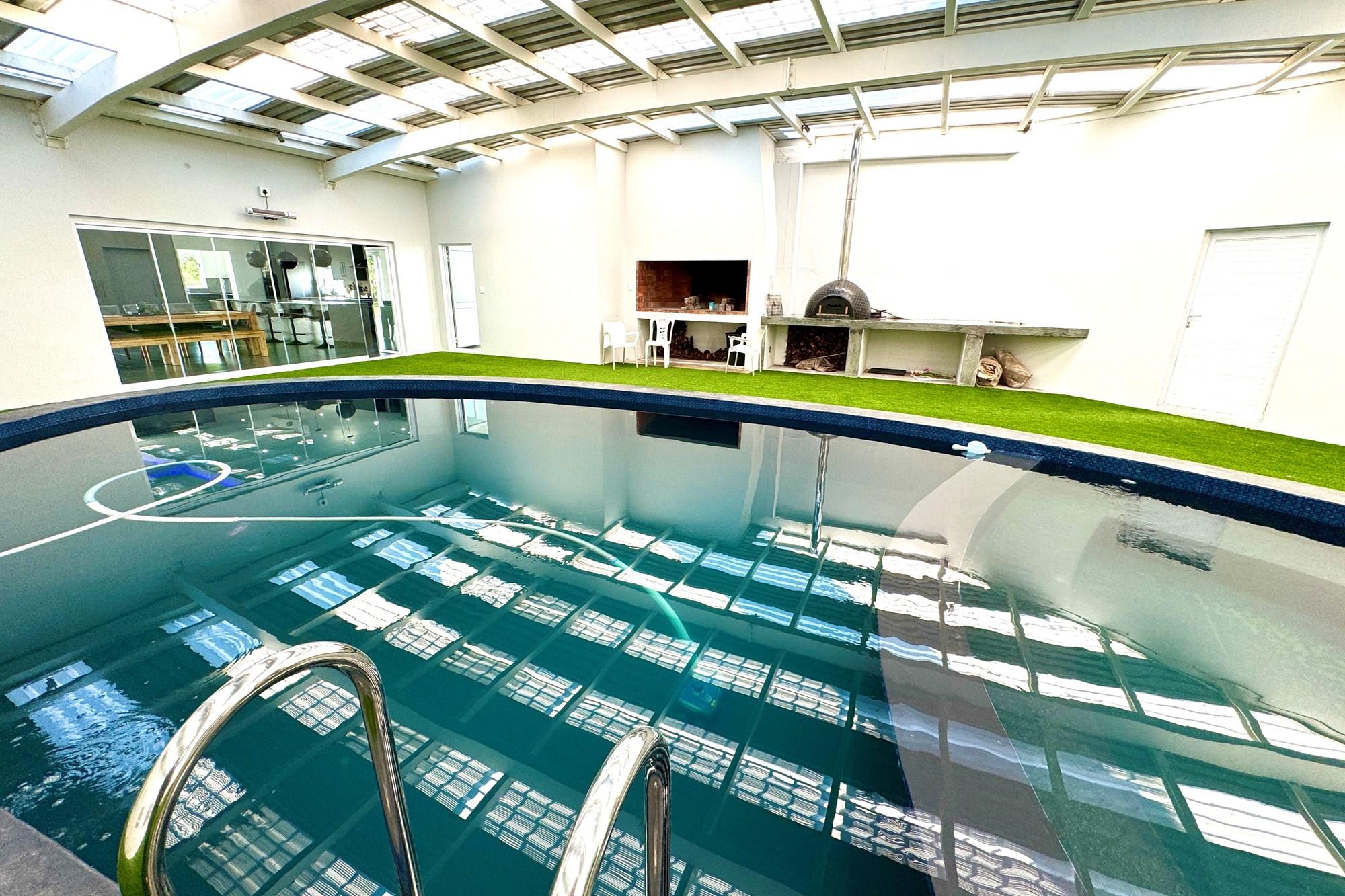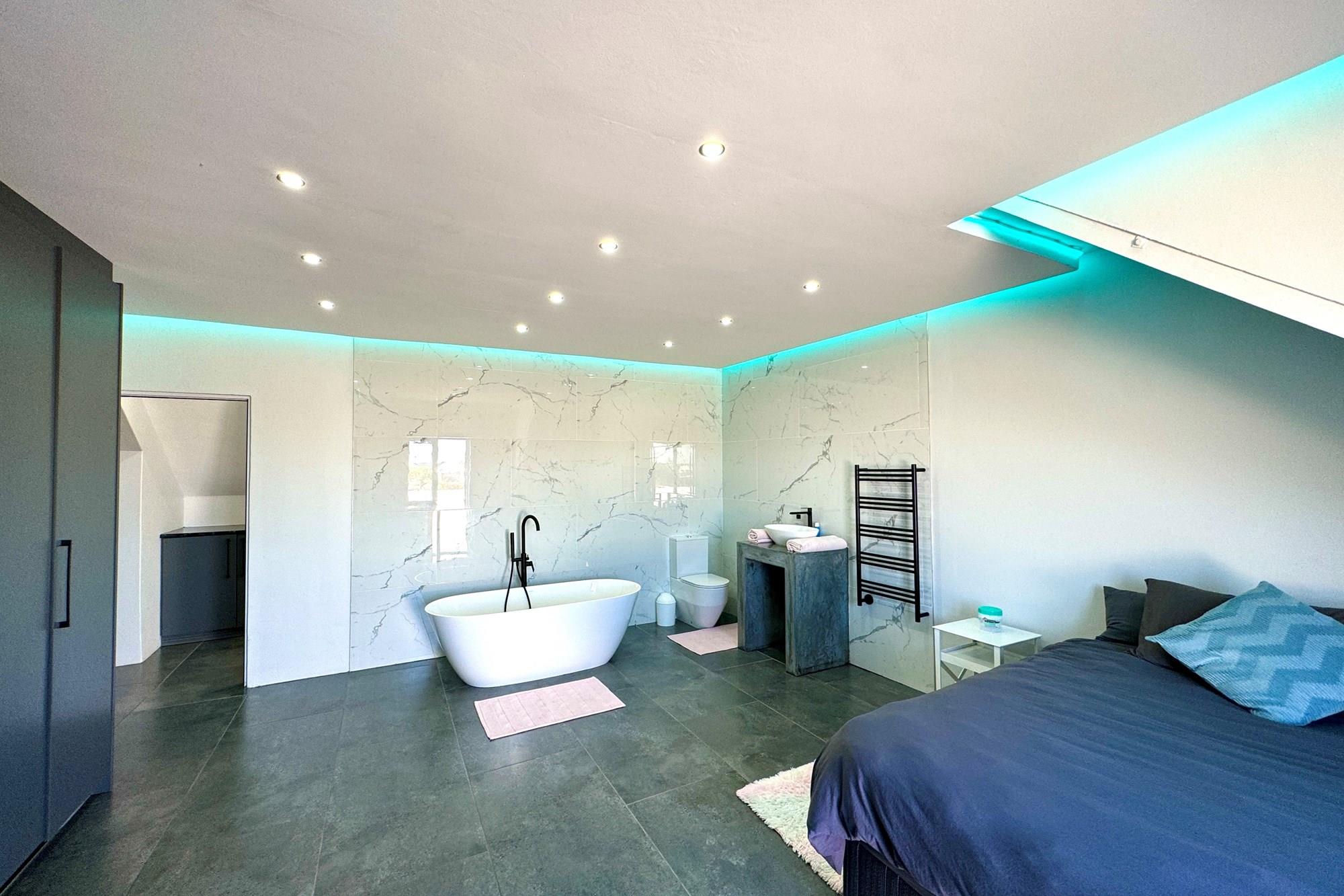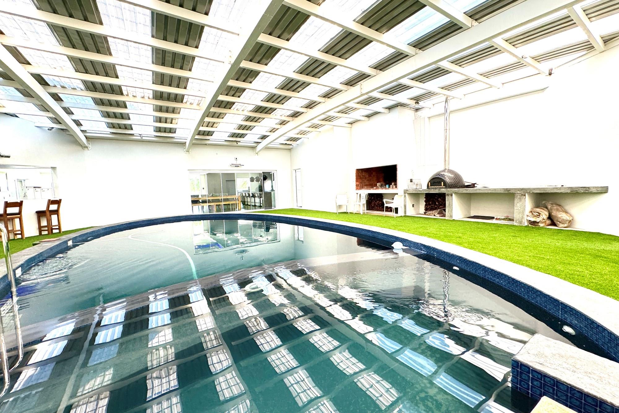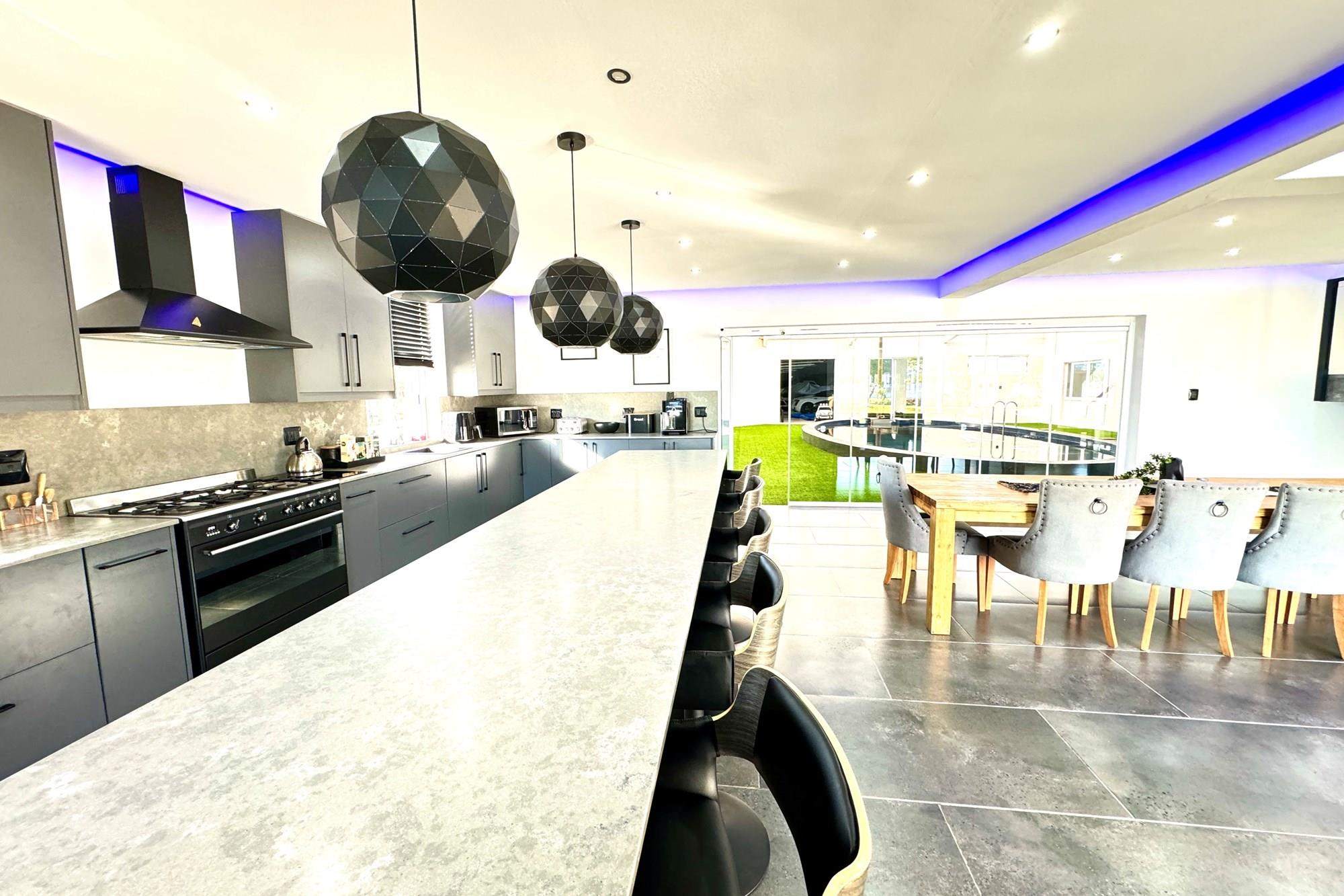 This house is designed for entertaining with a large swimming pool with heated fireplace. This area has a large bar and an enormous area to entertain. A BBQ area with a Pizza oven completes this large space.Modern Aesthetic: The home features a sleek modern design complemented by colored LED lighting, creating a vibrant contemporary atmosphere.Quality Sanware: High-quality sanitary ware is featured in all bathrooms and the kitchen, ensuring functionality and style.Spacious Main Area: Includes a large open-plan lounge, dining room, kitchen, and undercover pool area that can comfortably entertain up to 100 guests.Ultra-Modern Kitchen: The kitchen boasts top-tier finishes and Built-in Cupboards (BIC), along with a separate scullery and laundry area overlooking the lawns and play area.Two Staircases: Conveniently located on the north and west sides of the house, providing easy access to all areas.High-Quality Finishes: Premium materials and finishes are used throughout the home, enhancing its luxurious appeal.