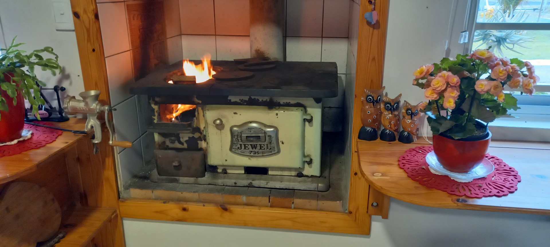 Expansive open-plan farmhouse kitchen featuring three stoves (electric, gas, and a Jewel coal stove) – perfect for winter.